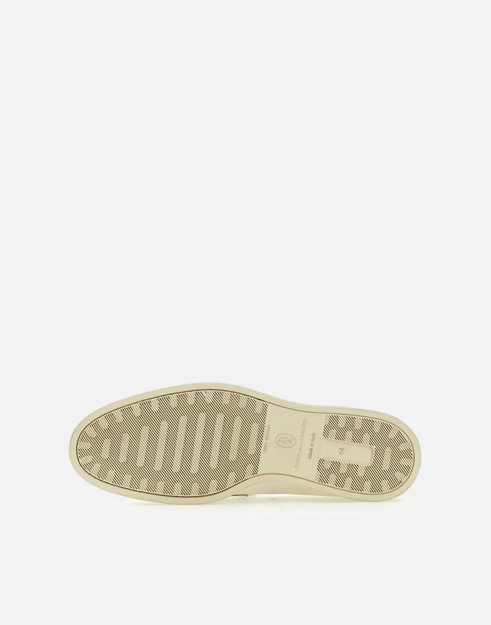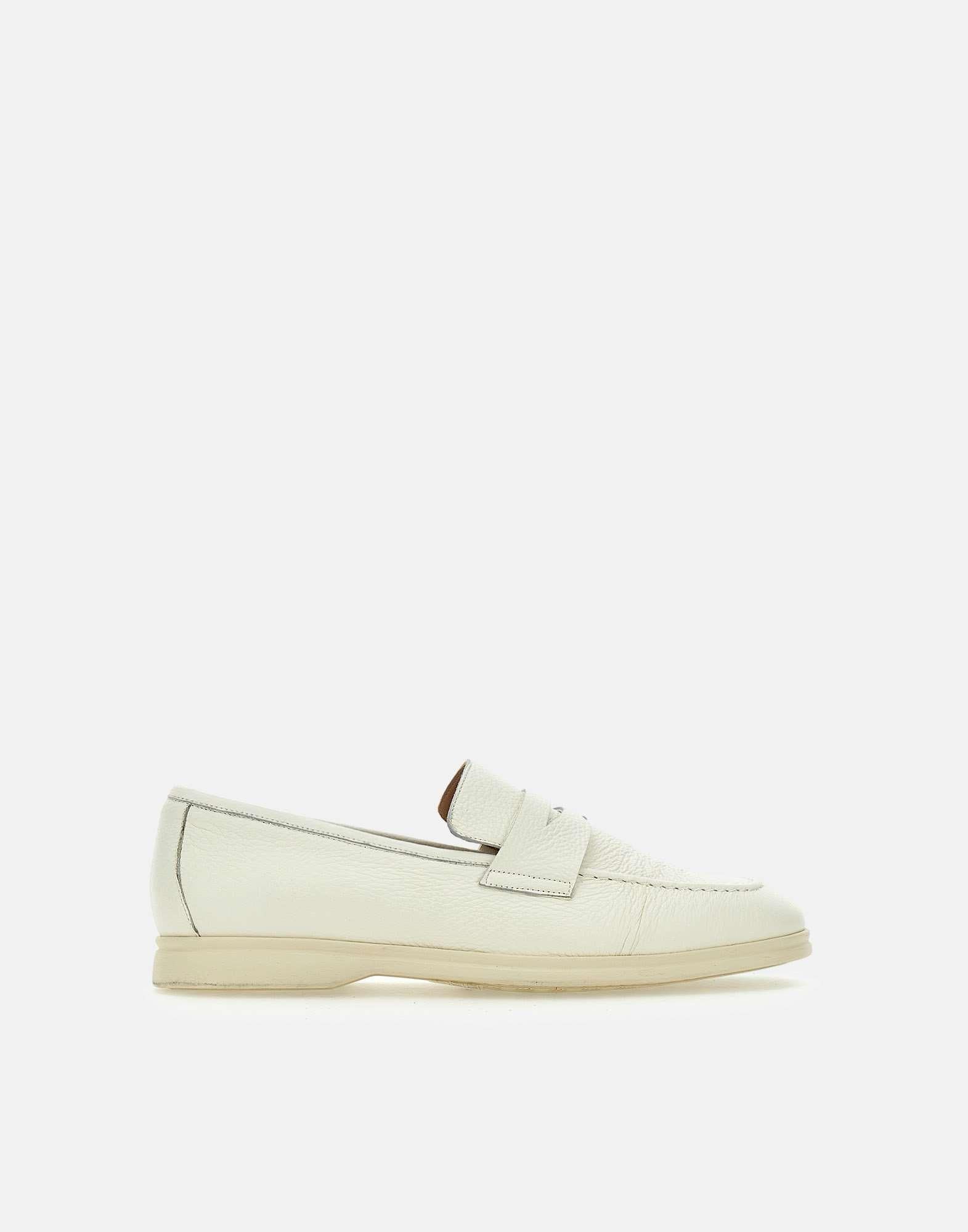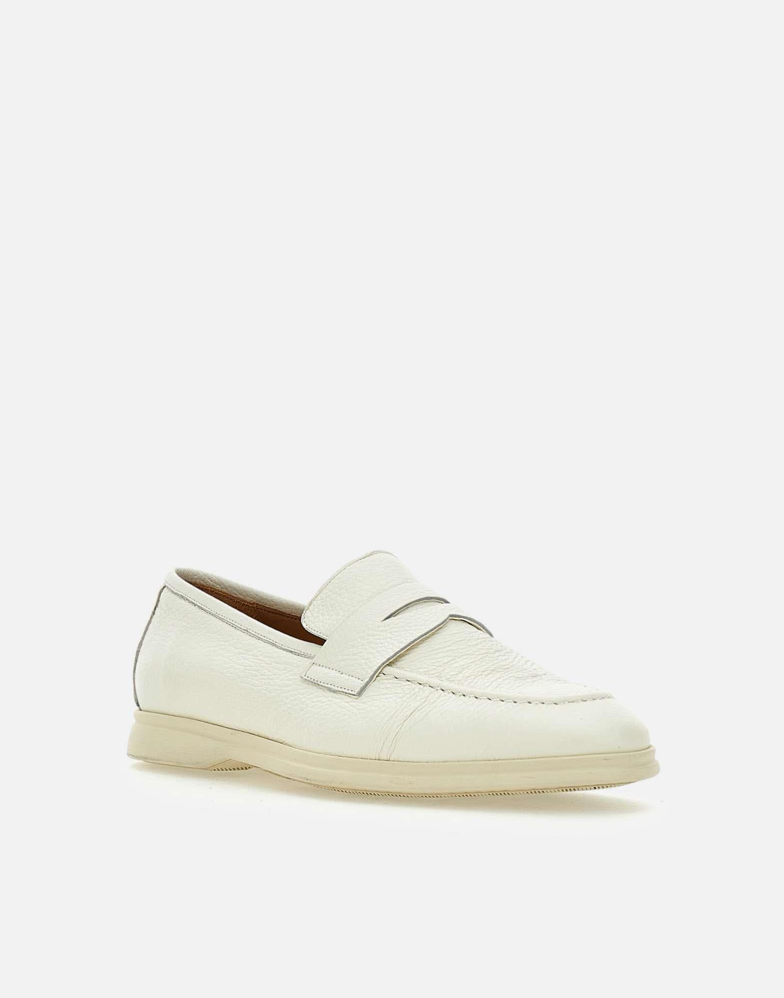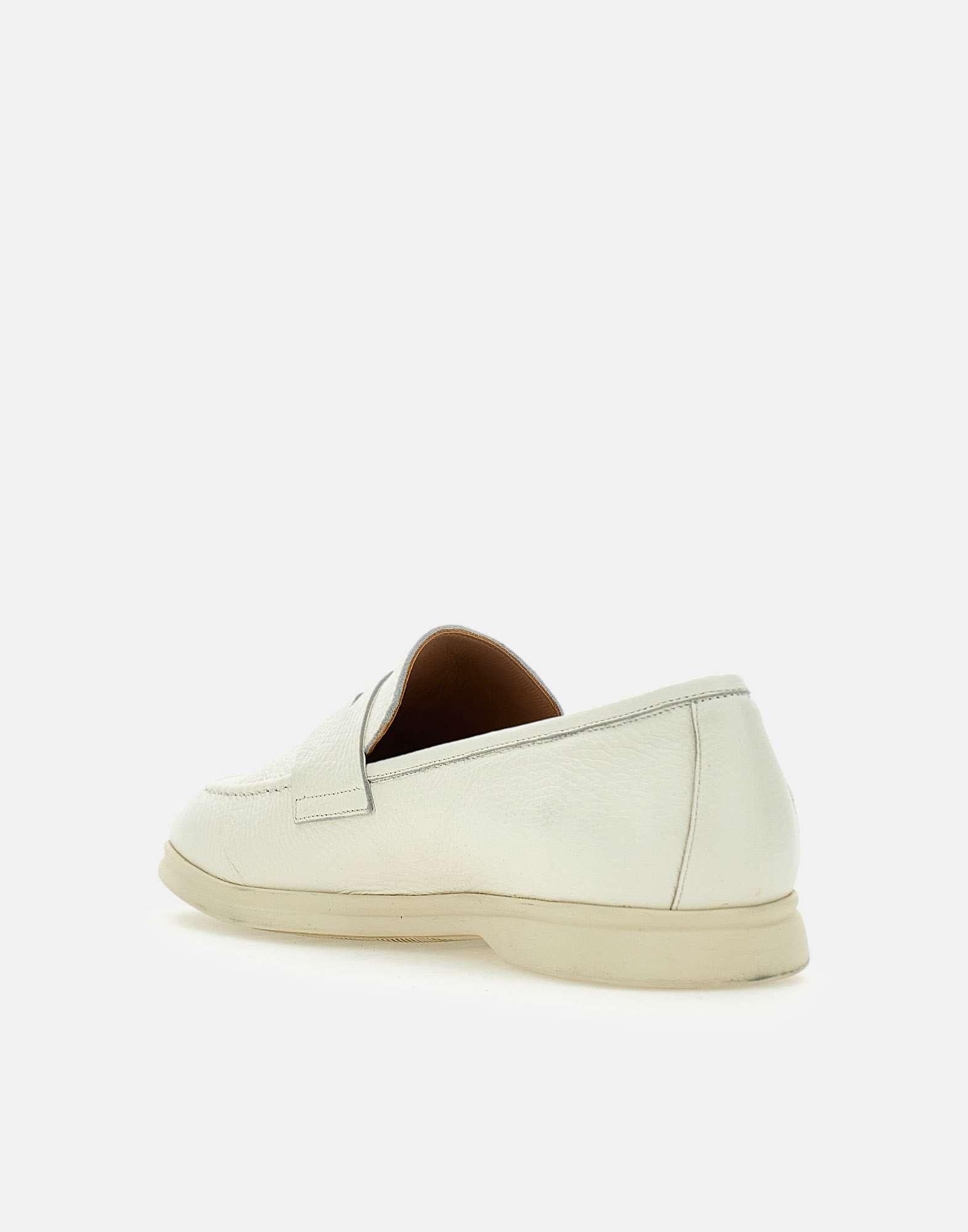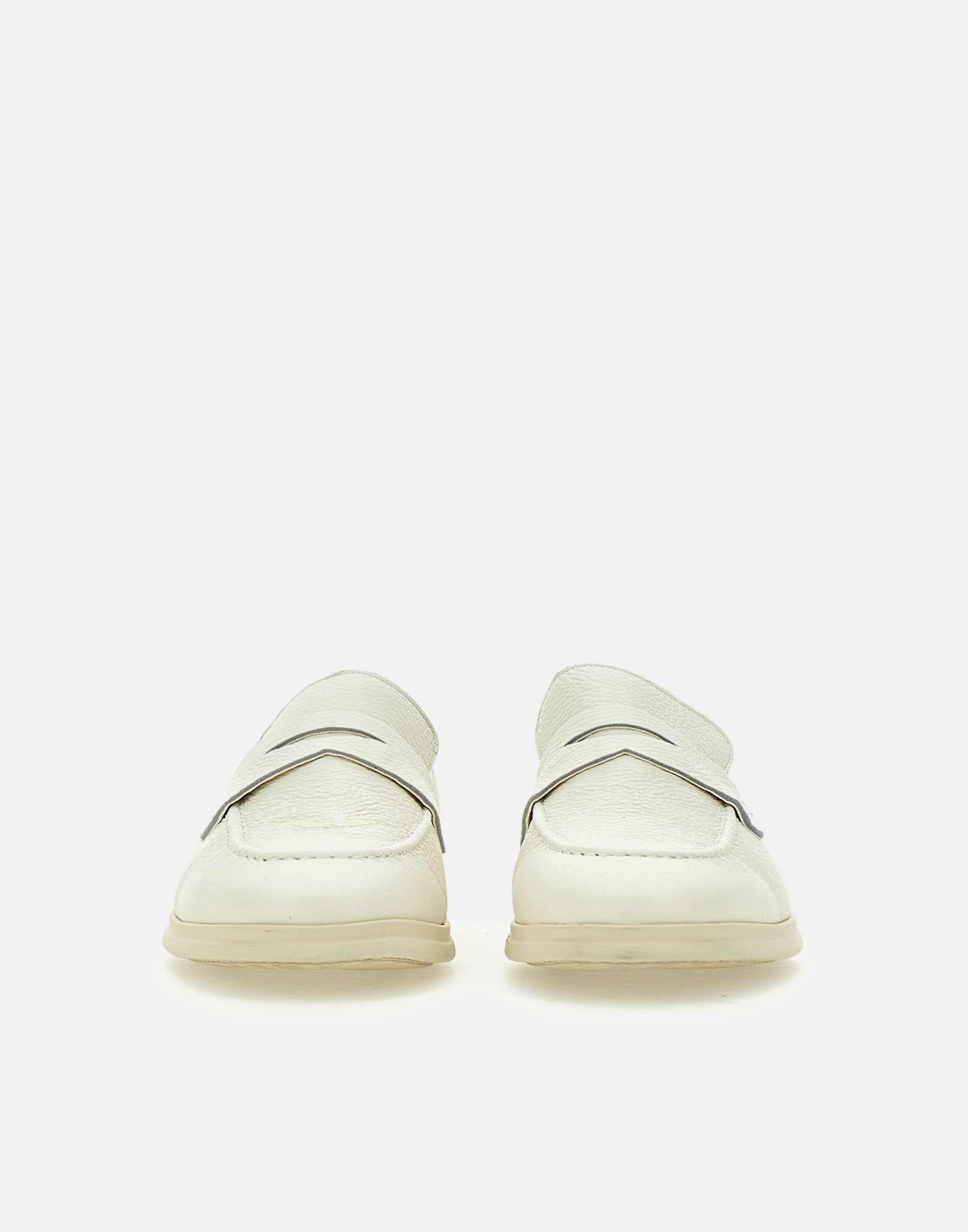 Mocassini "Piero4" Duca Degli Abruzzi in pelle grana martellata dollaro-cervo, color latte, mostrina decorata, punta tonda, soletta logata, interno in morbidissima pelle, impunture artigianali a vista, suola in gomma, tacco 2cm, custodia inclusa, made in Italy.