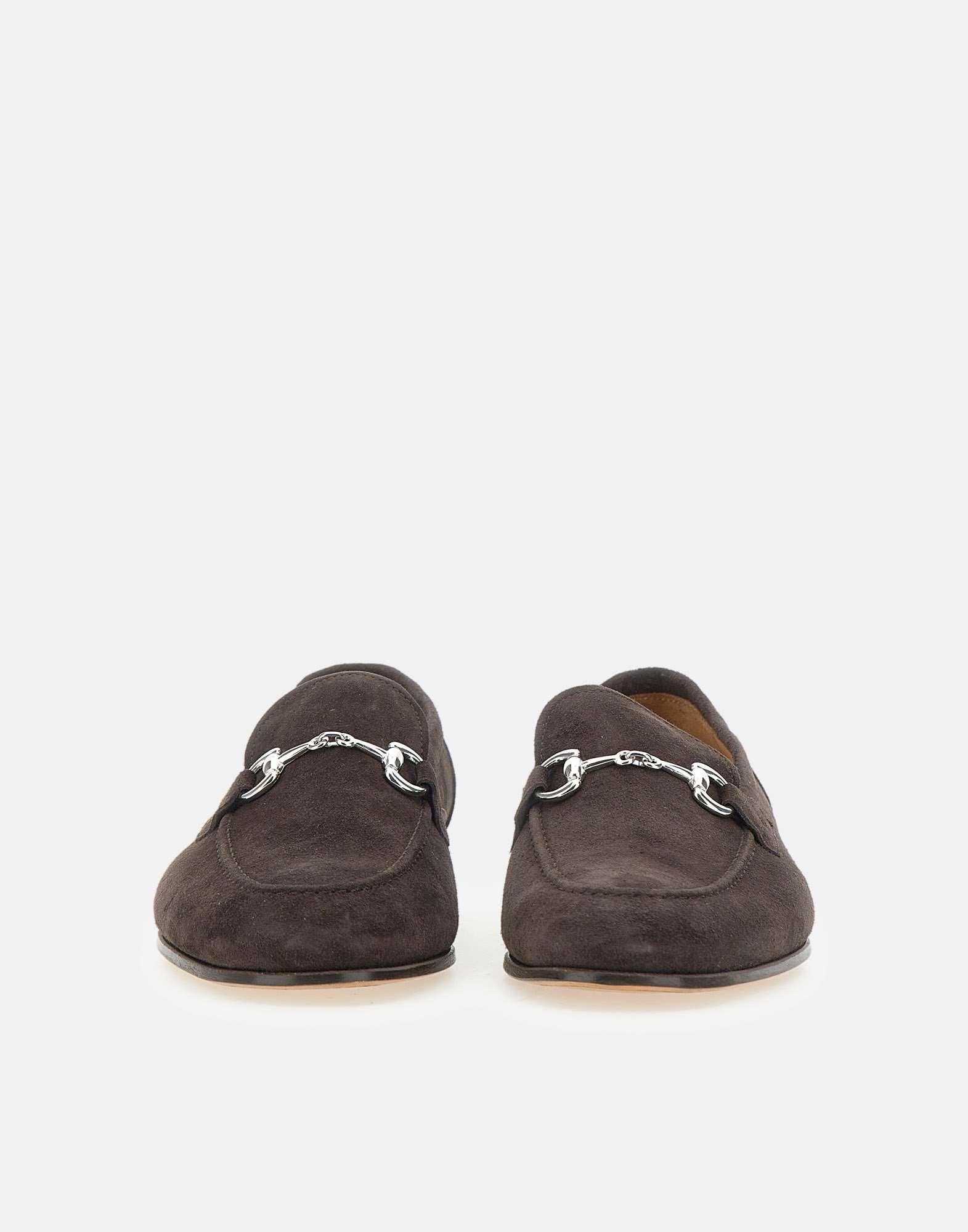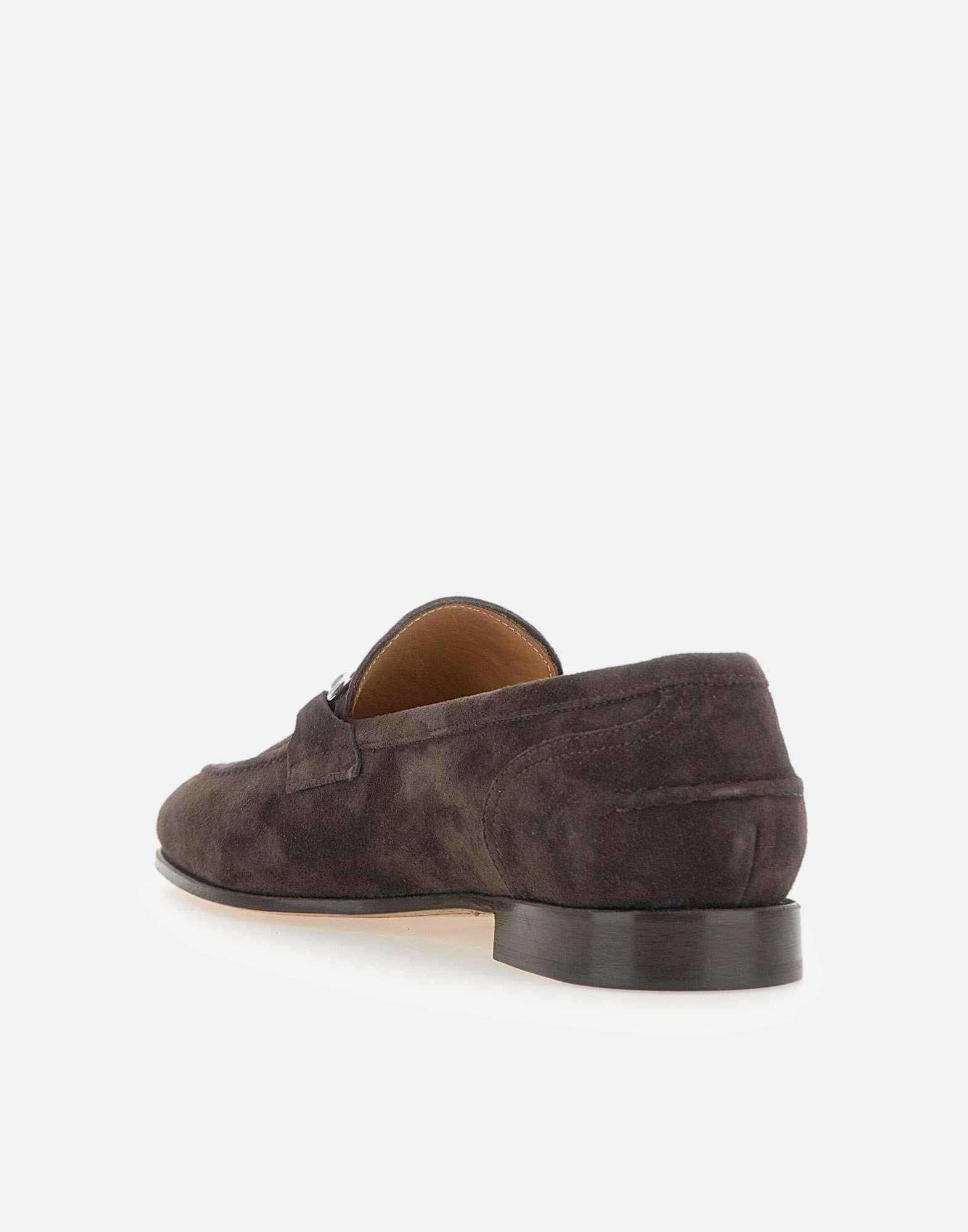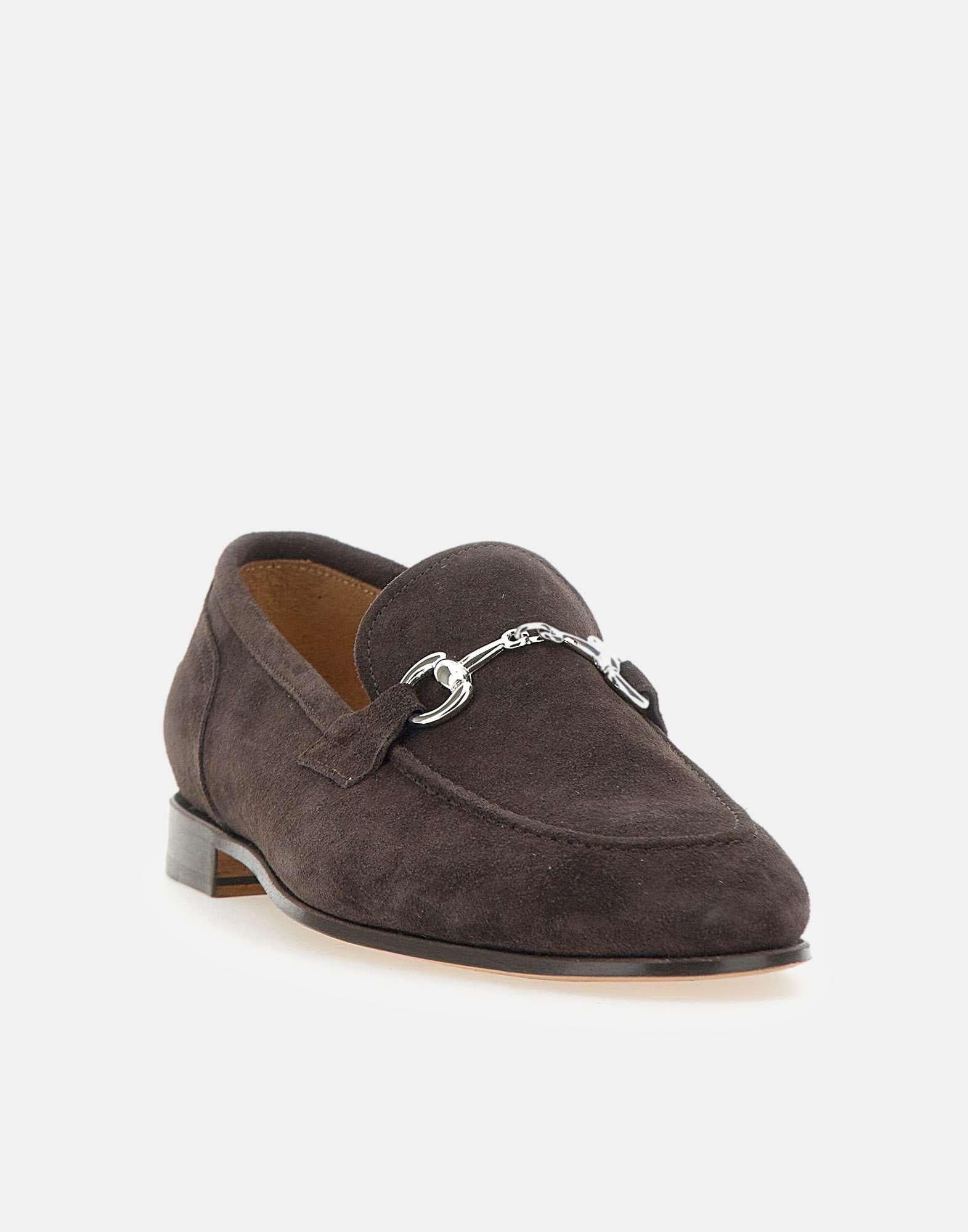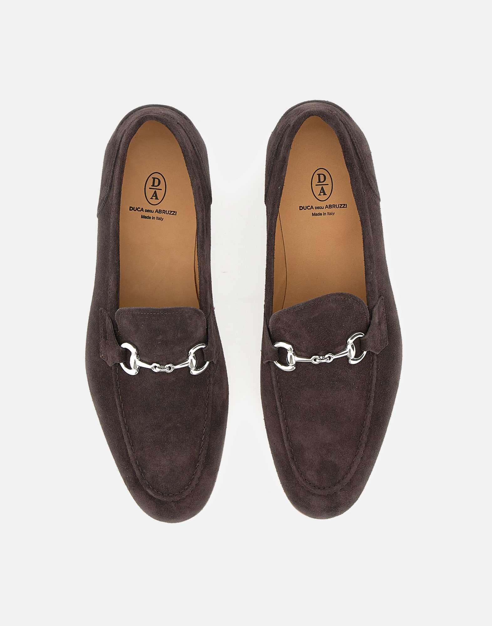 Mocassini uomo Duca Degli Abruzzi " Vasco Kaleido 299", testa di moro, in pelle scamosciata, super morbidi e comodi, mascherina con accessorio decorativo in metallo silver lucido, impunture artigianali a vista, soletta in morbida pelle, suola in cuoio, tacco 2cm, made in Italy, calzata regolare