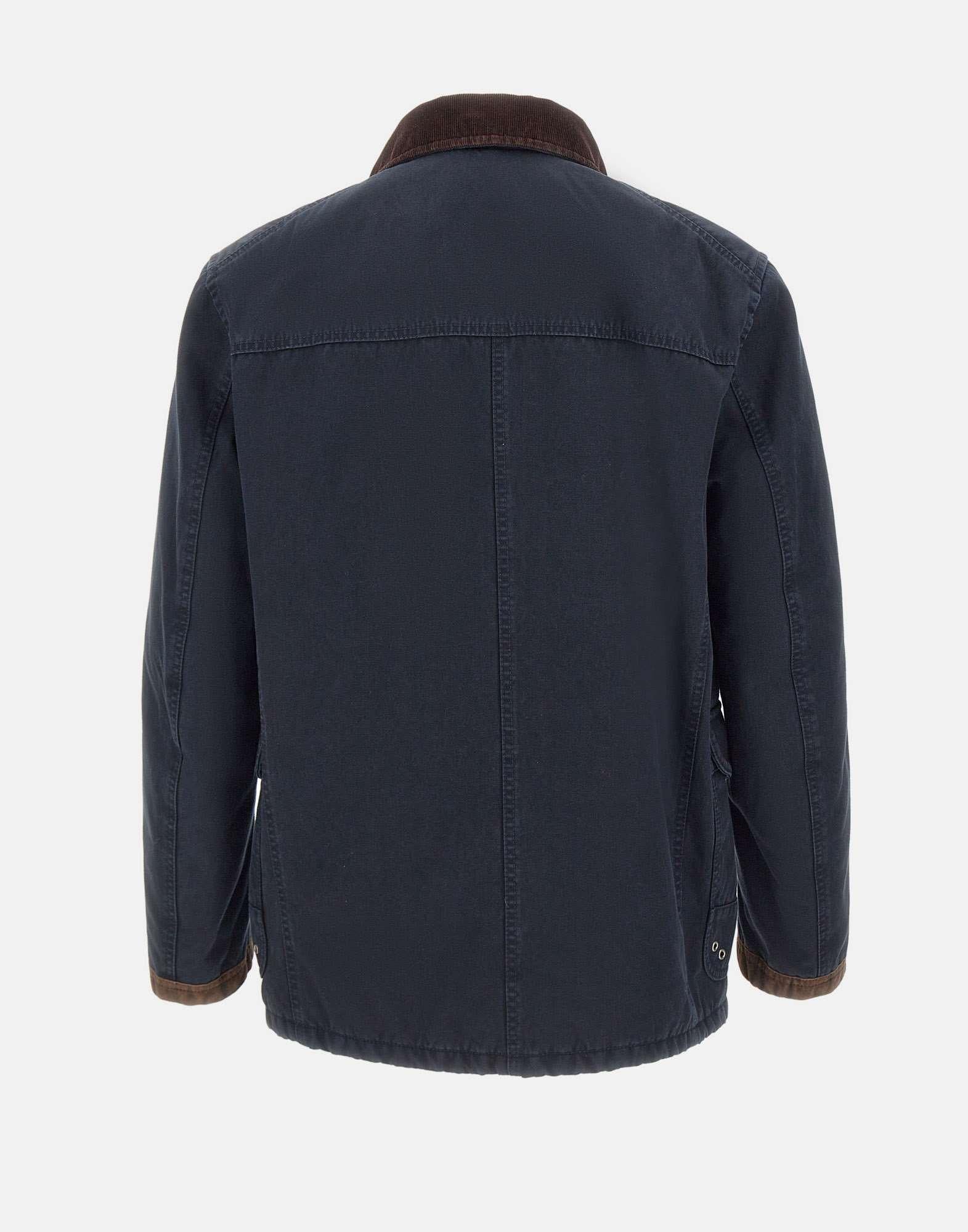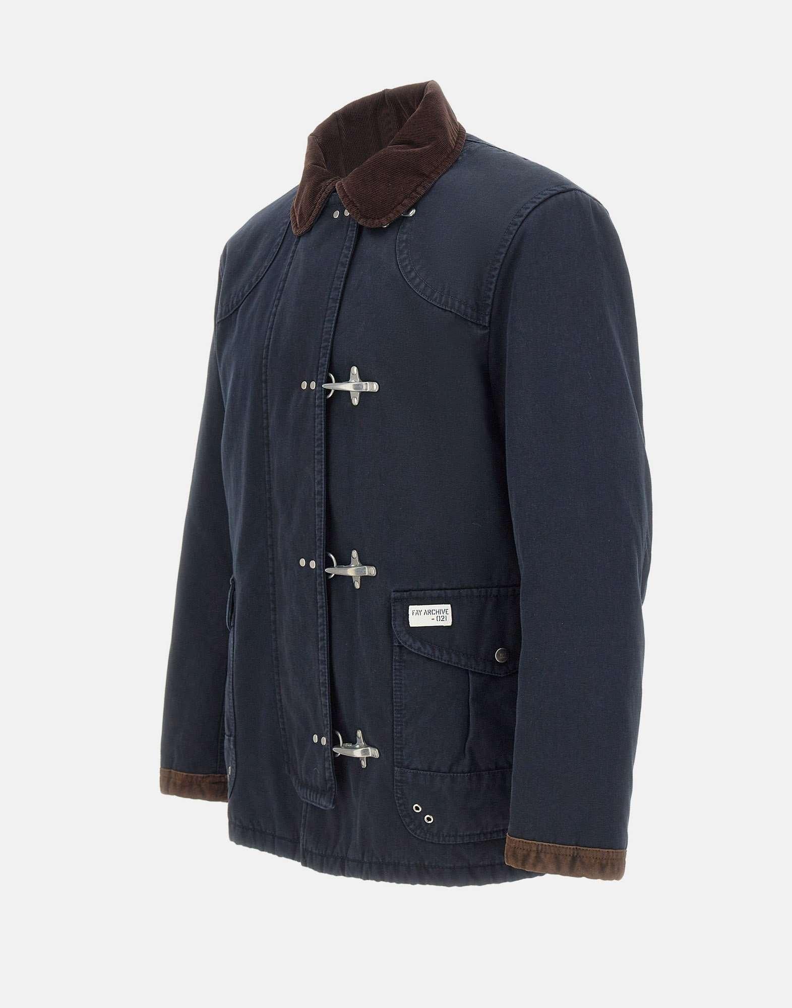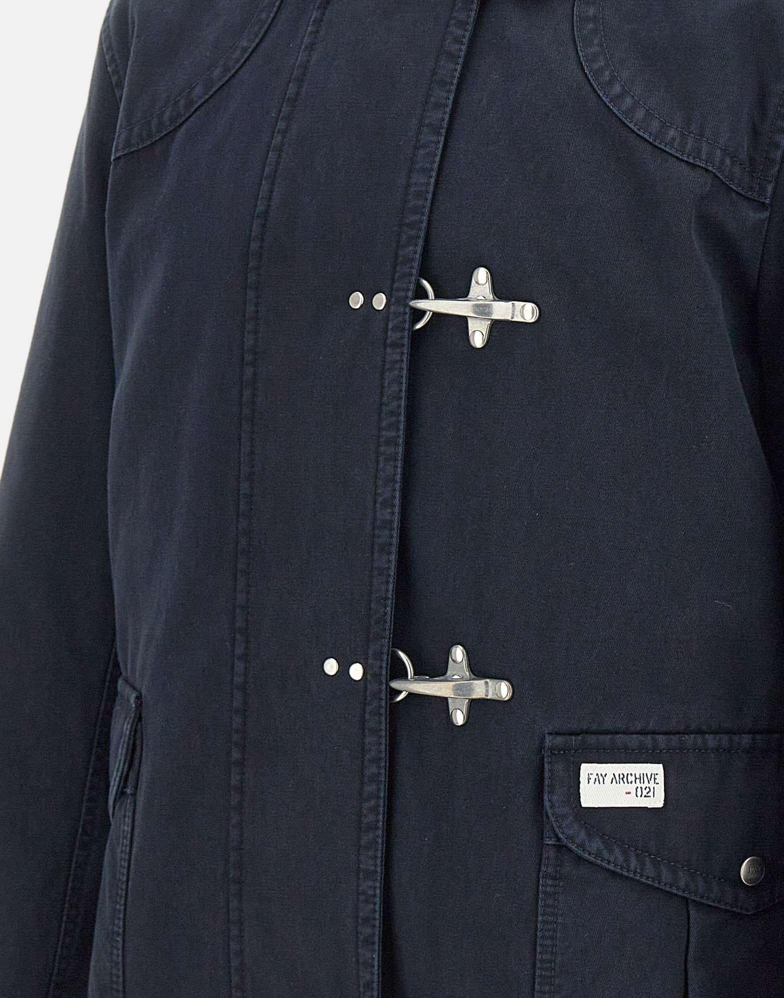 Iconico "4 Ganci Fay Archive" colore blu, capo cult del DNA workwear Fay dagli anni Ottanta. Ispirato alle divise dei pompieri americani, è realizzato in resistente cover di cotone con imbottitura in ovatta e fodera trapuntata a motivo cipolla a contrasto di colore. Caratterizzato da colletto in velluto, dettagli in crosta e inconfondibile chiusura con quattro ganci in metallo e automatici nascosti. Completano il design le maxi tasche con patta e il taschino interno. Etichetta Fay Archive cucita sulla tasca sinistra. Made in Italy. Vestibilità comfort.