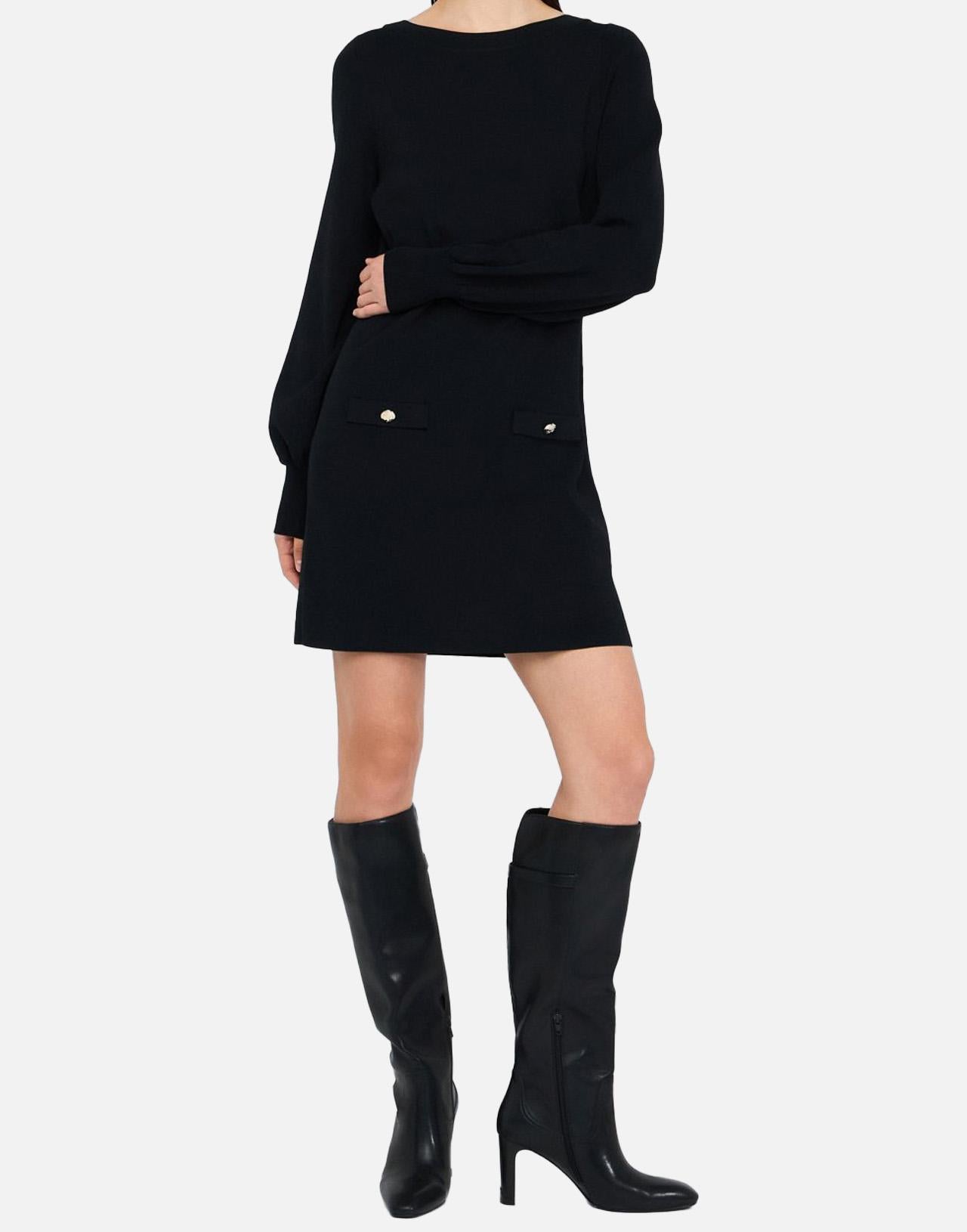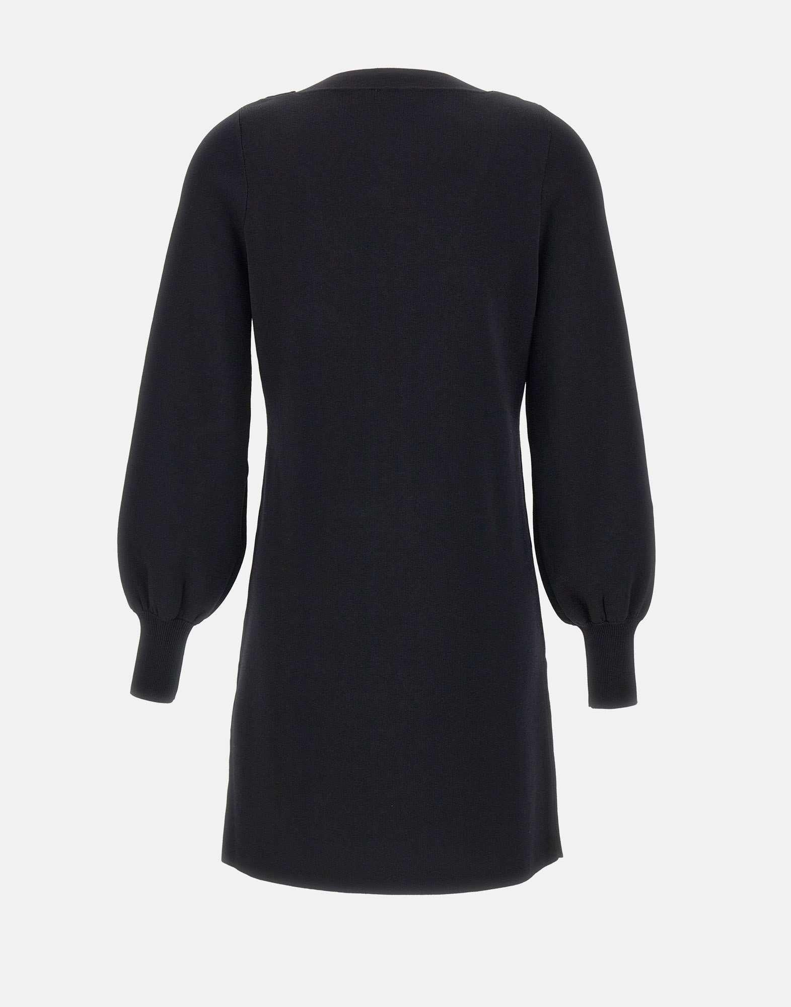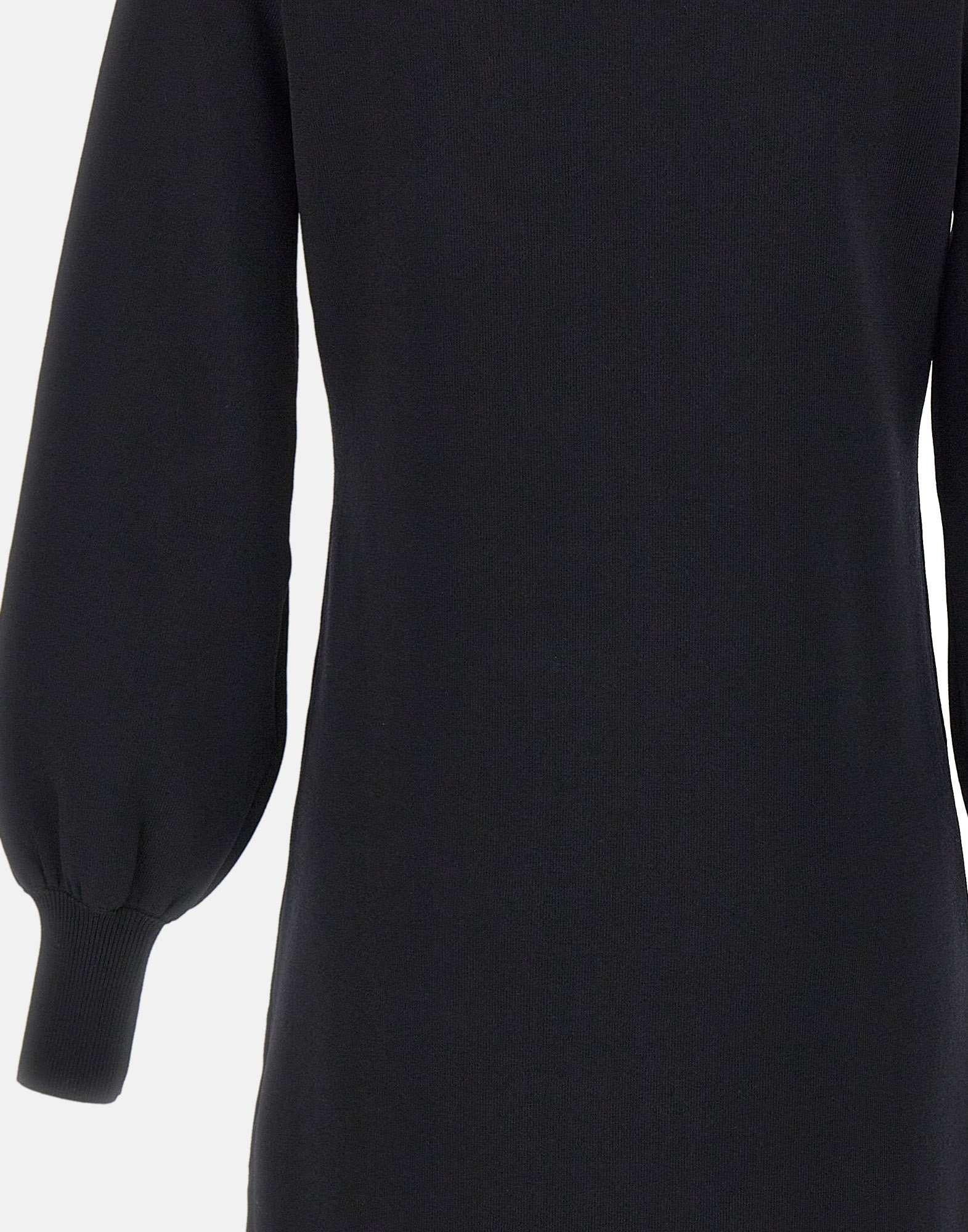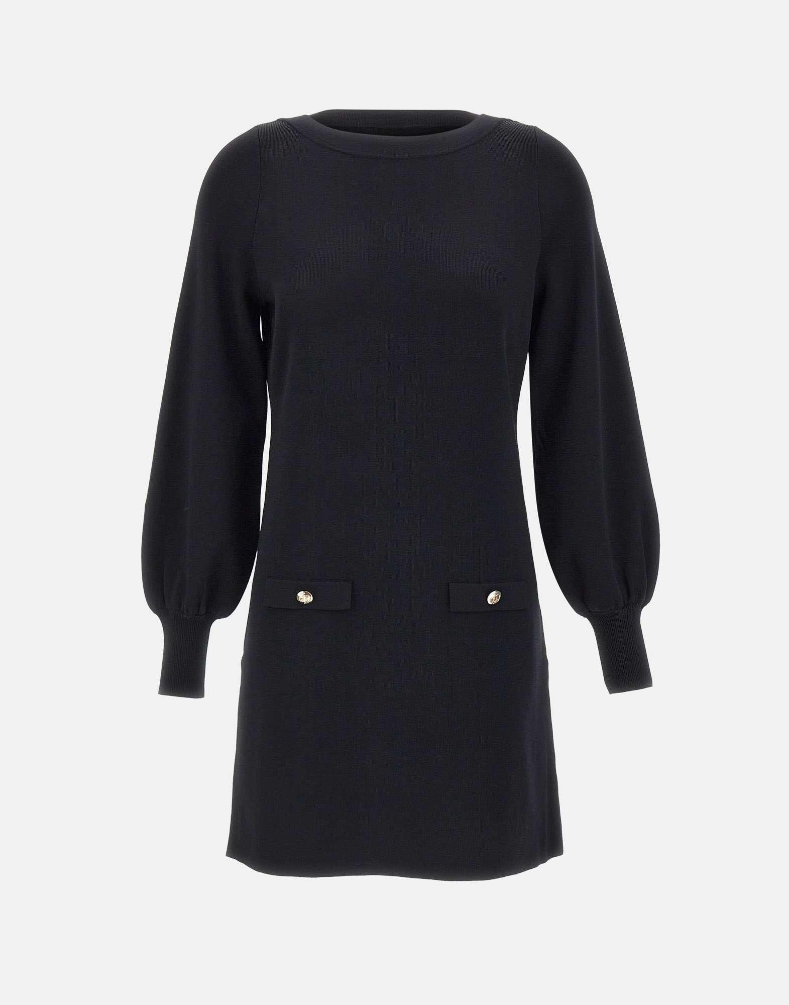 Abito donna Liu-Jo in maglia di misto viscosa colore nero, dal fascino elegante e femminile. Presenta scollo a barca, maniche lunghe a palloncino e pattine decorative con bottone dorato logato che impreziosiscono il design. Realizzato come prodotto "Liu Jo Better", riflette l'impegno del brand verso una moda più sostenibile. La vestibilità regular fit assicura comfort e raffinatezza, perfetta per look day-to-night.