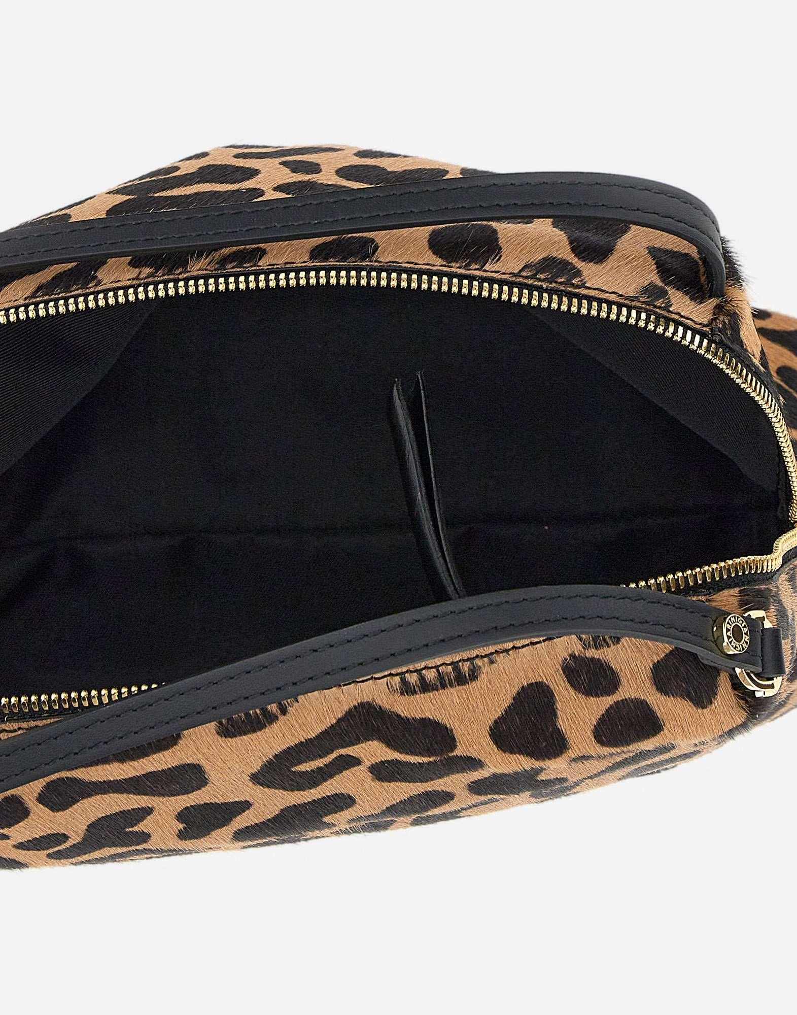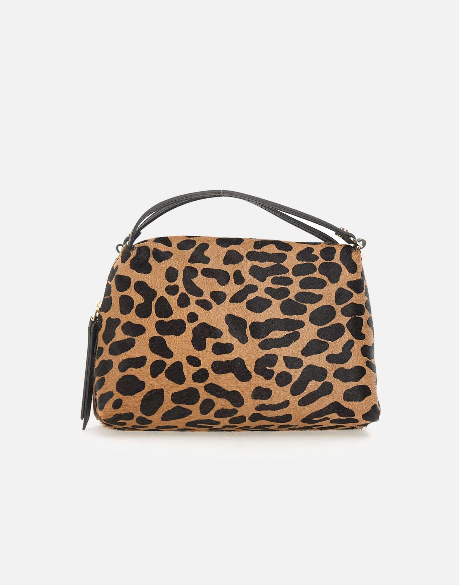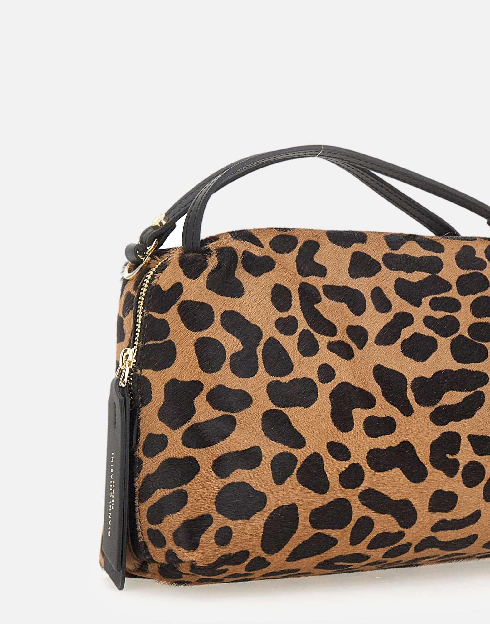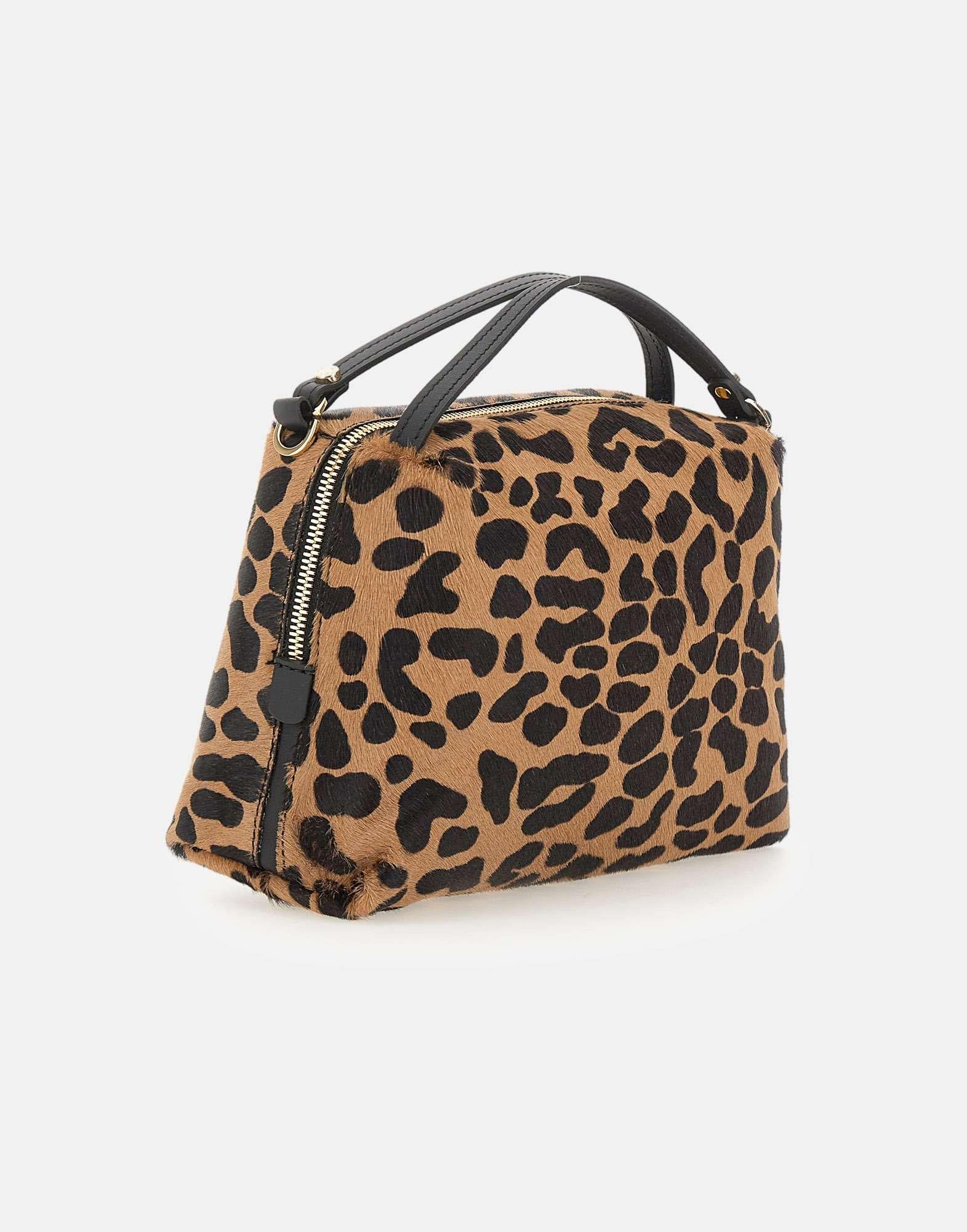 Borsa a mano Gianni Chiarini "Alifa" in pelle stampata effetto cavallino, fantasia animalier nei toni del cammello e nero, tracolla removibile e regolabile 100cm, chiusura con zip superiore, doppio manico superiore, fodera in tessuto, finiture metalliche oro lucido, tasca interna con zip. Dimensioni: 26cm lunghezza, 16cm altezza, 12cm profondità. Made in Italy.