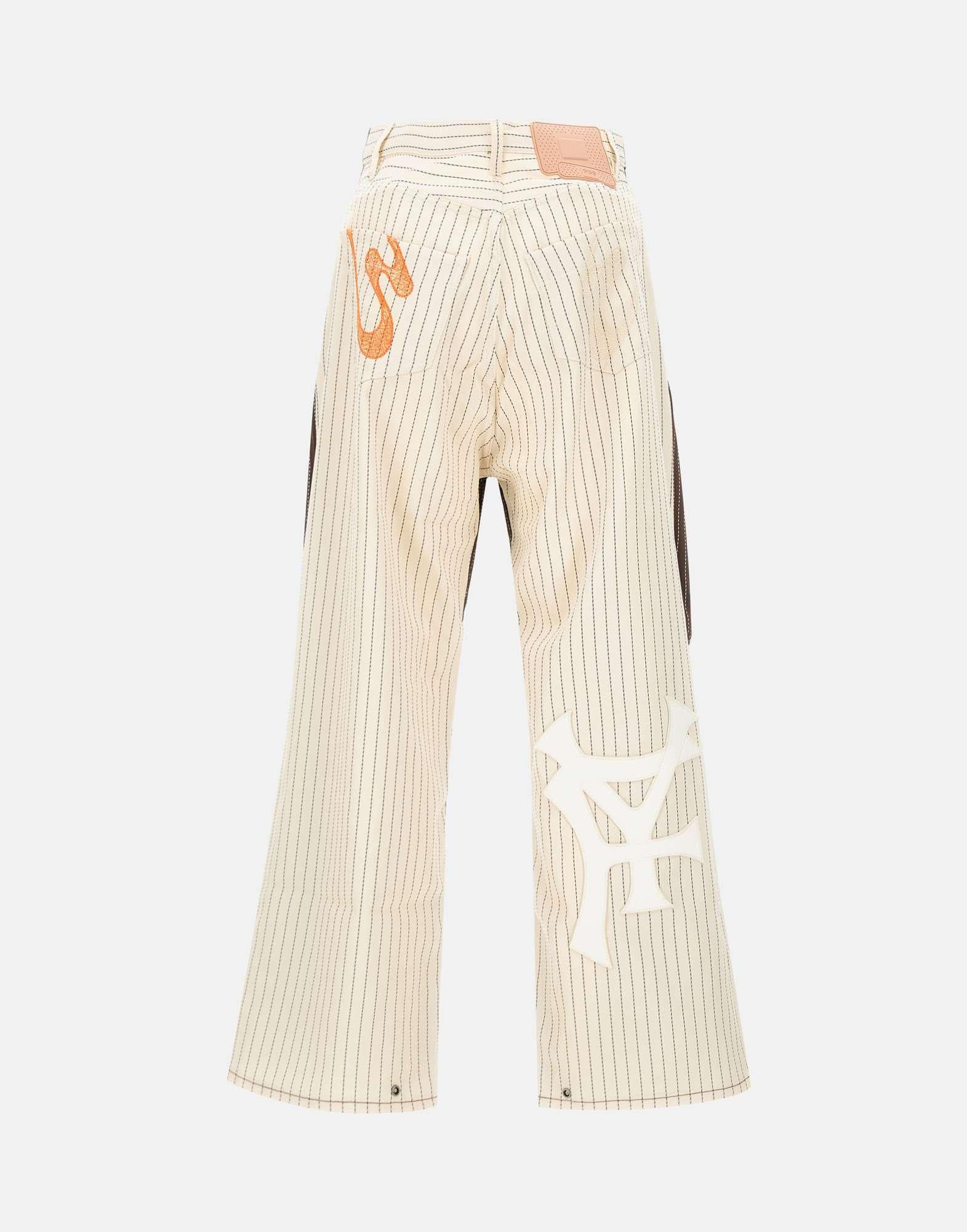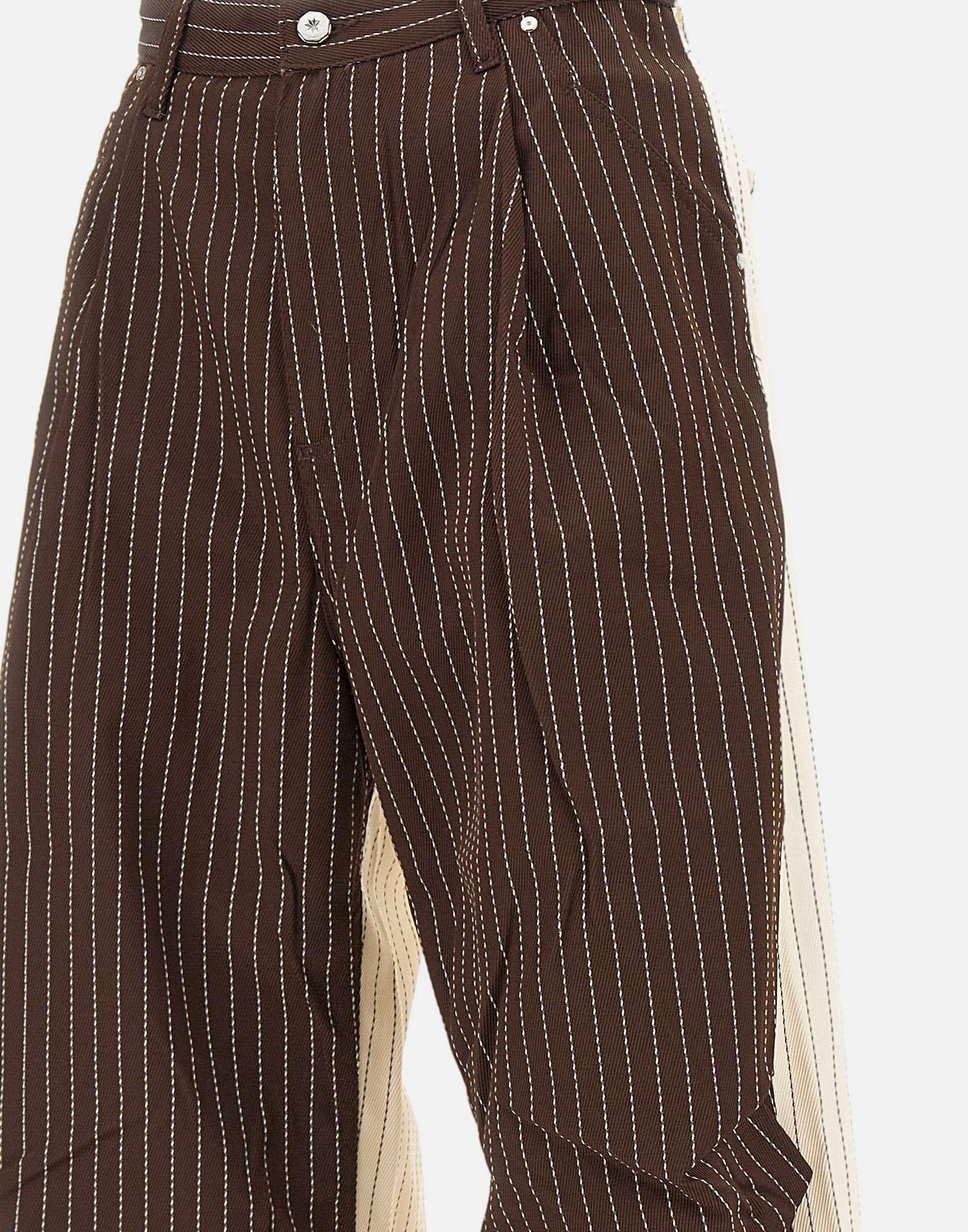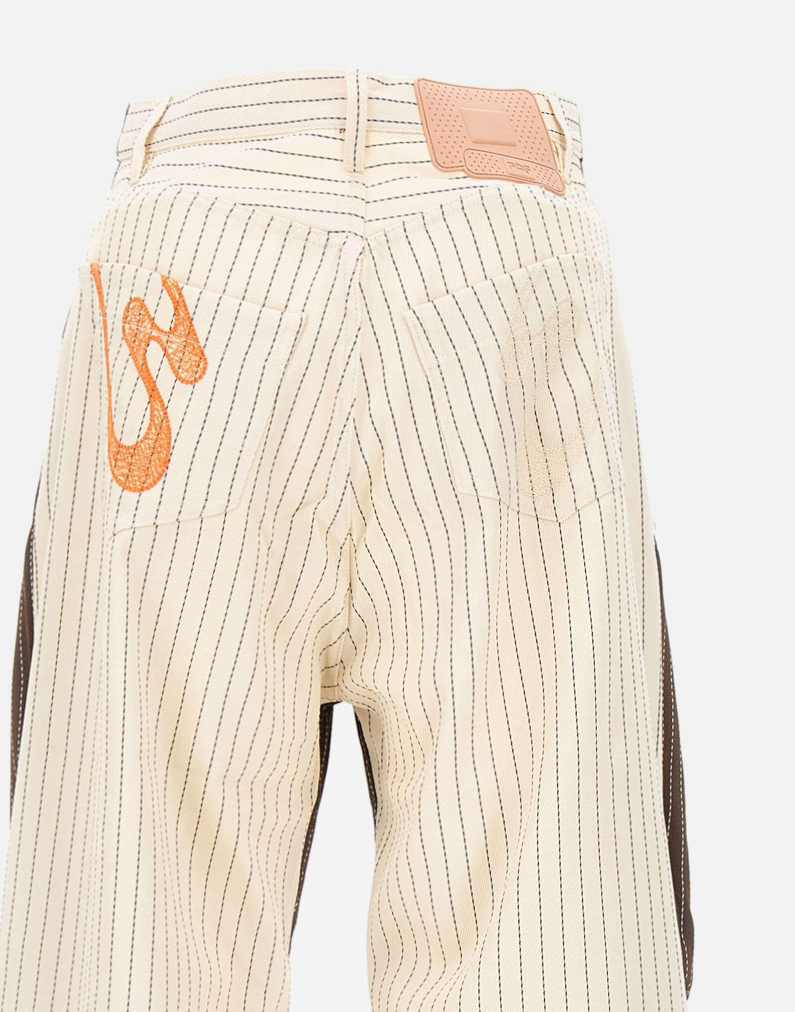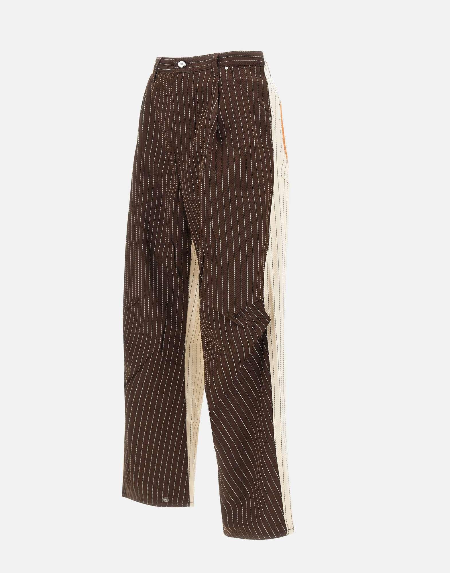 Pantaloni PDF modello "Fat Angelo" double color panna e tabacco su fantasia gessato, caratterizzati da una vita alta con passanti per cintura e taglio balloon dal volume morbido. Realizzati in tessuto leggero misto viscosa e lana con pince frontali e arricciature sartoriali che ne esaltano la costruzione. Presentano chiusura con zip e bottone gioiello, cinque tasche e liconico logo a cerotto applicato sul retro. Linea contemporanea e comfort elevato per un look casual. Fondo con bottoni 25cm e interno 72cm per la taglia 29. Relaxed fit. Made in Italy.