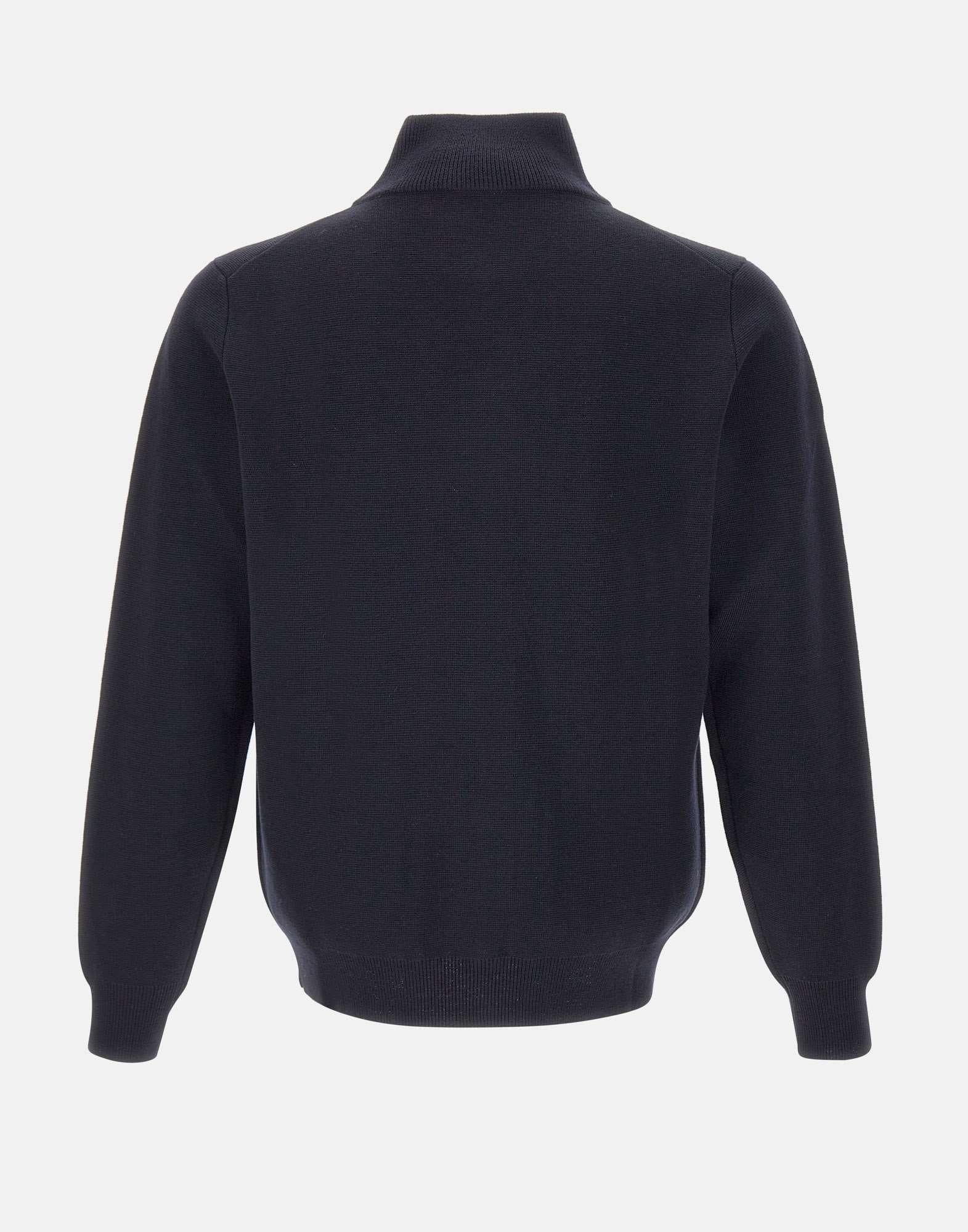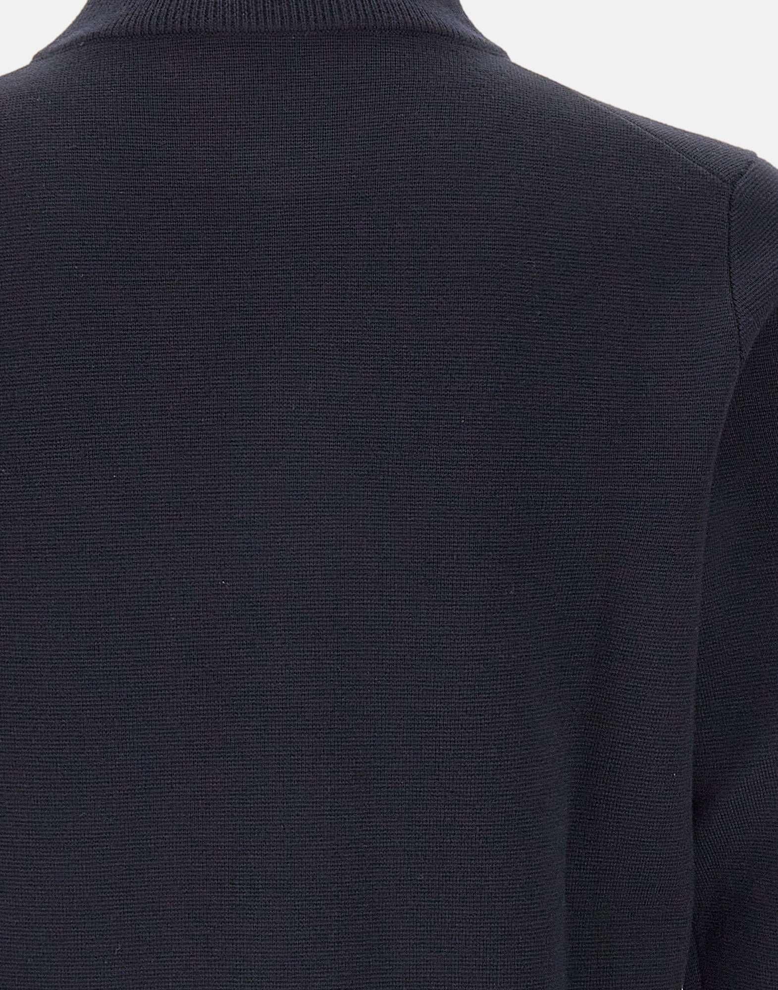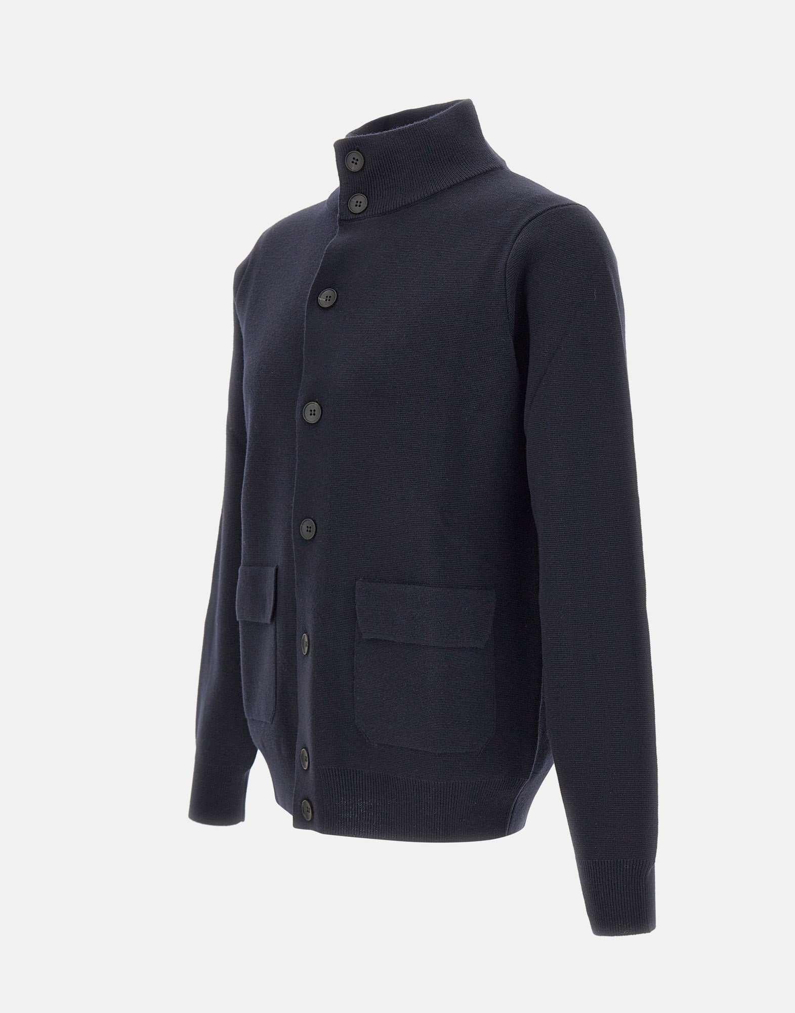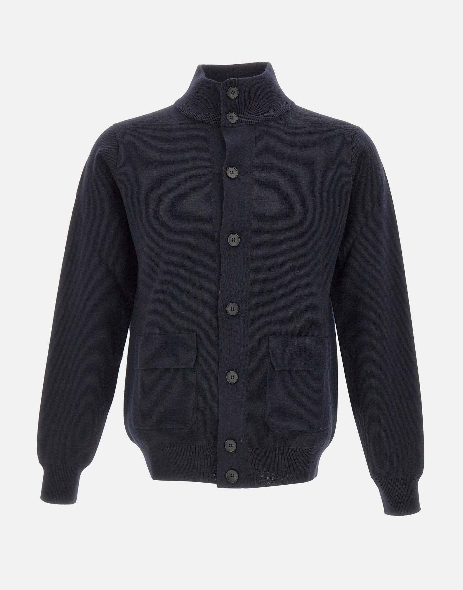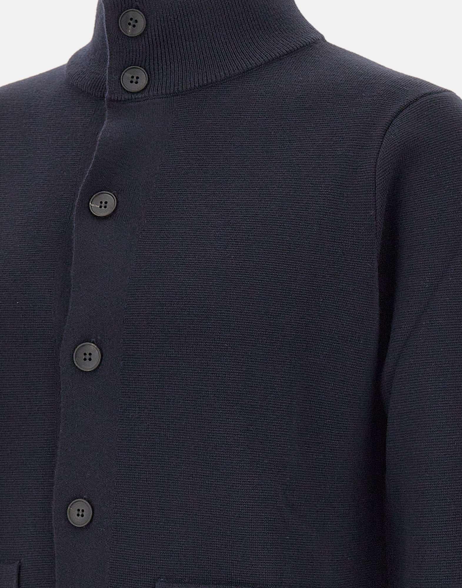 Giacca Filippo De Laurentiis realizzata in maglia di lana extrafine merino, caratterizzata da una texture morbida e compatta che unisce comfort e raffinatezza. Proposta nel colore blu navy, presenta colletto in piedi, chiusura con bottoni in corno, tasche anteriori applicate e bordi a costine che definiscono la linea. La vestibilità regular fit e la costruzione sartoriale ne fanno un capo versatile e sofisticato. Made in Italy.