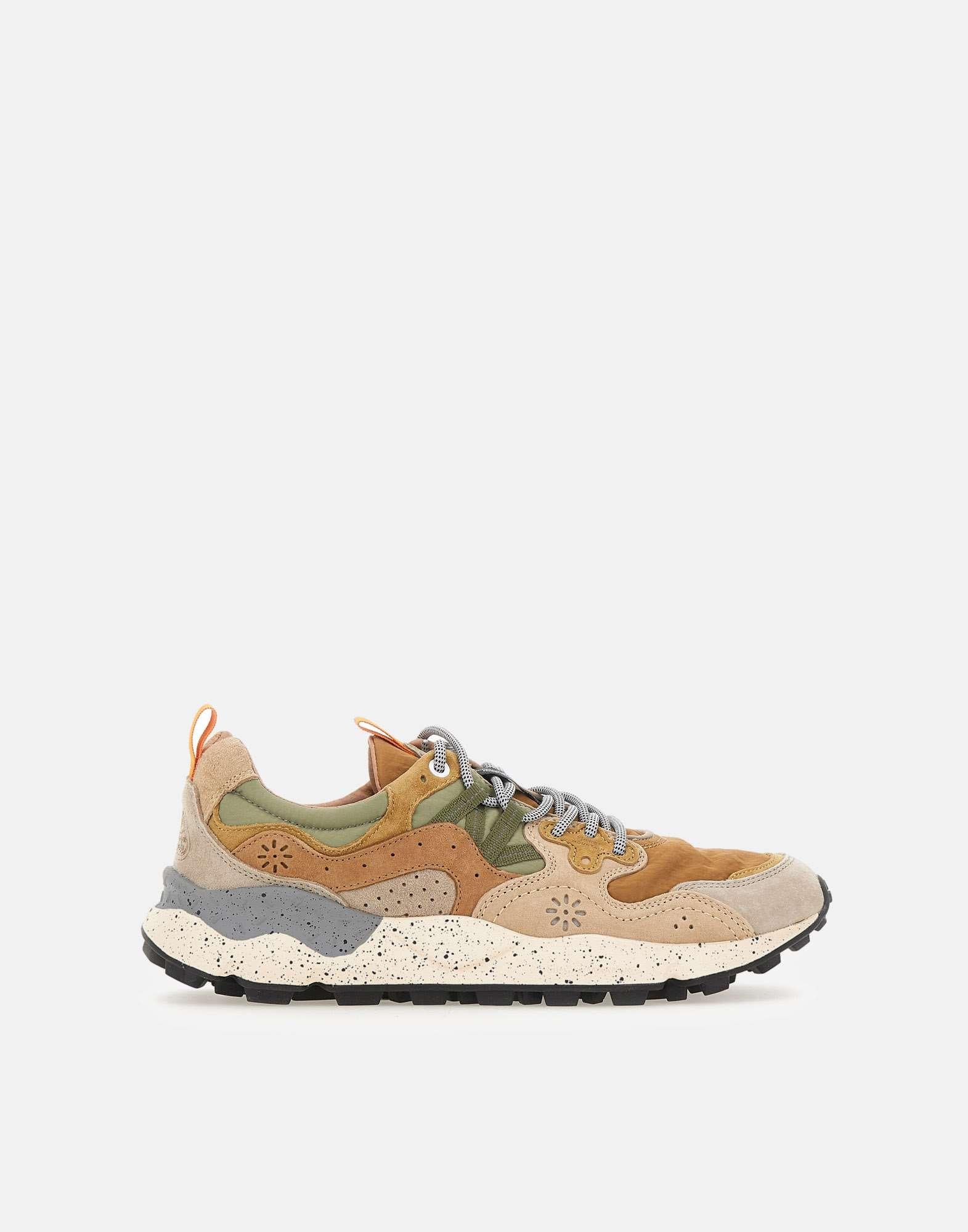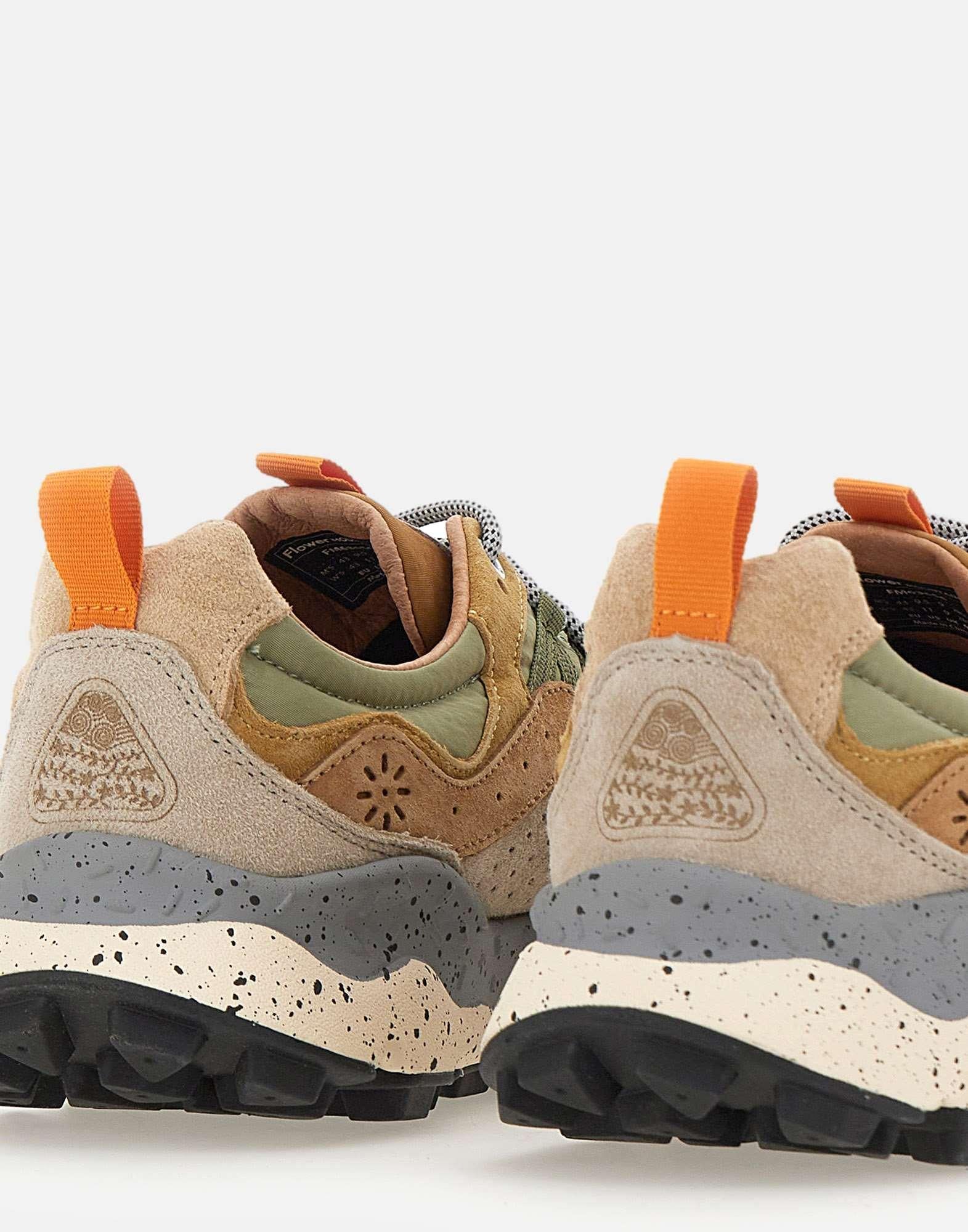 Sneakers uomo Flower Mountain modello "Yamano3" realizzate in tessuto tecnico su trama a rete con inserti in camoscio. Il design multicolor nei toni del verde, beige e marrone richiama uno stile outdoor ispirato alle calzature da trekking, con traforature funzionali e occhielli rinforzati. La costruzione e completata da lacci tubolari e soletta interna in sughero naturale con trattamento antibatterico, studiata per garantire comfort e traspirabilita. La suola in gomma ultra leggera con battistrada dentellato, altezza 4 cm, assicura stabilita e aderenza. Dotate di tecnologia Microban Odor Control. Calzata regolare.