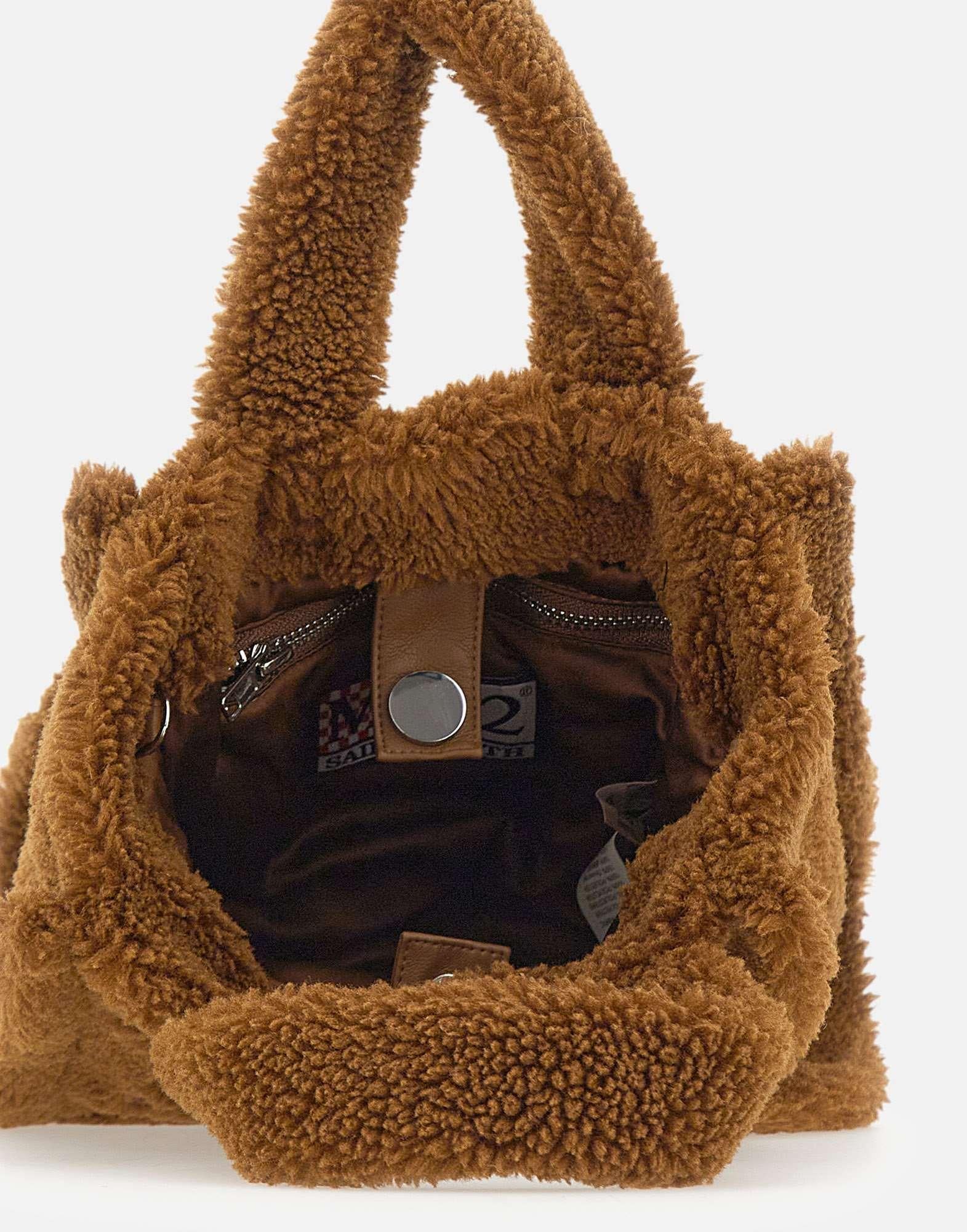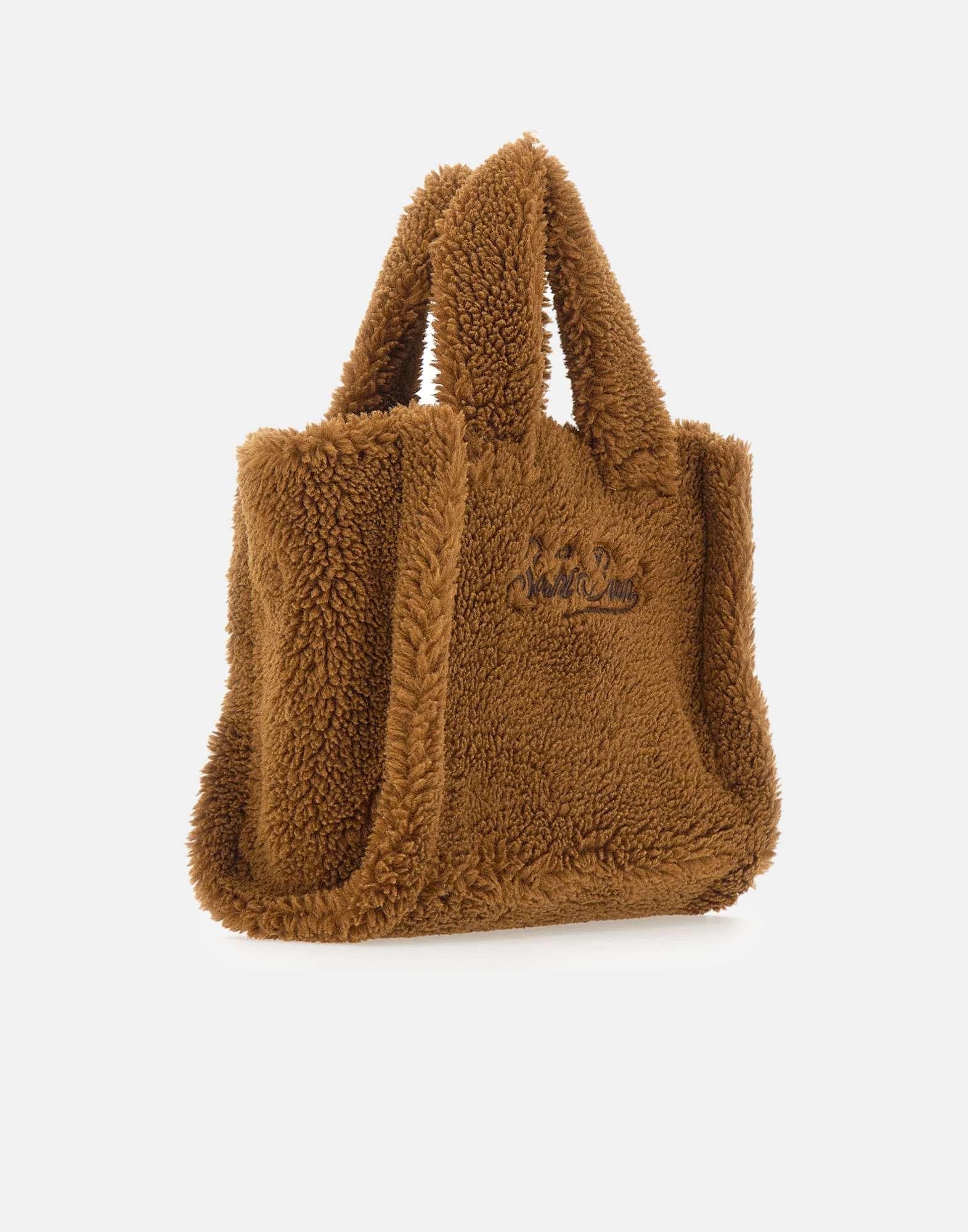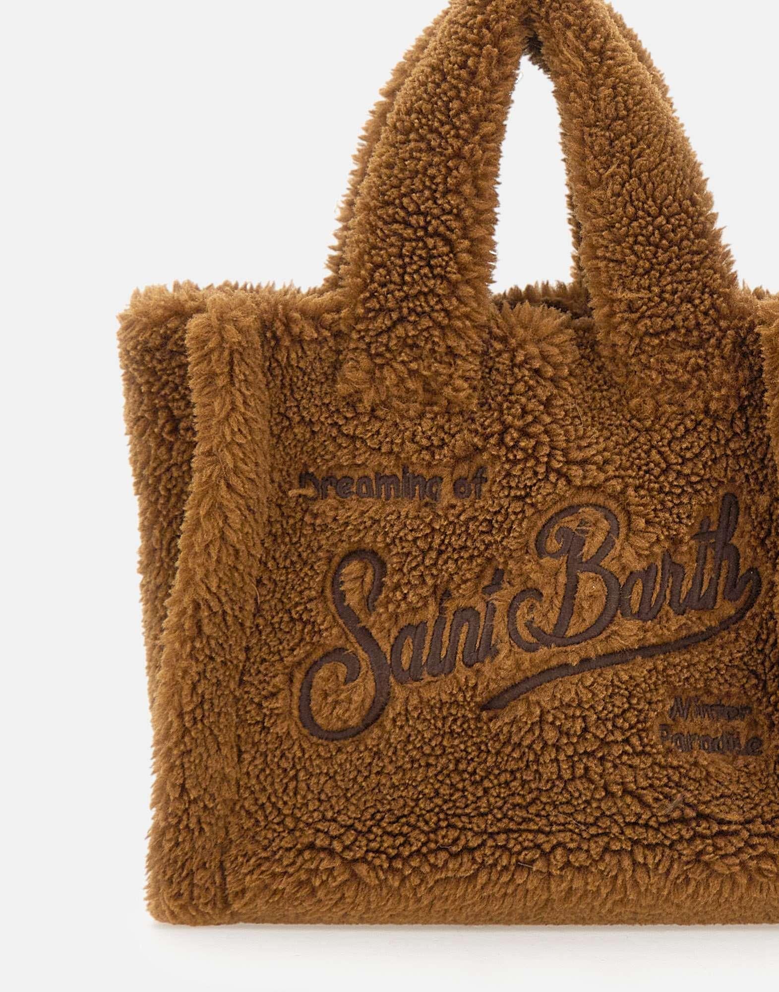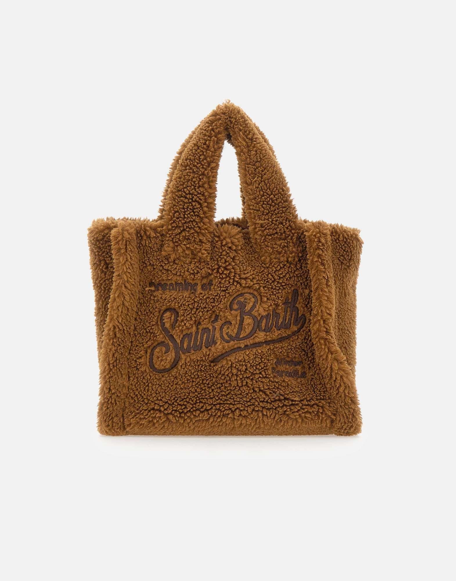 Borsa Mc2 Saint Barth "Vanity Mini Teddy 18emb" in morbido tessuto effetto pelliccia color caffè. Rifinita con logo ricamato frontale, presenta doppio manico superiore, tracolla regolabile e removibile, chiusura con bottone e tasca interna. Compatta e trendy, è perfetta per aggiungere un tocco originale ai look invernali. Misure: 20x19x10 cm.