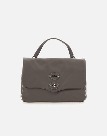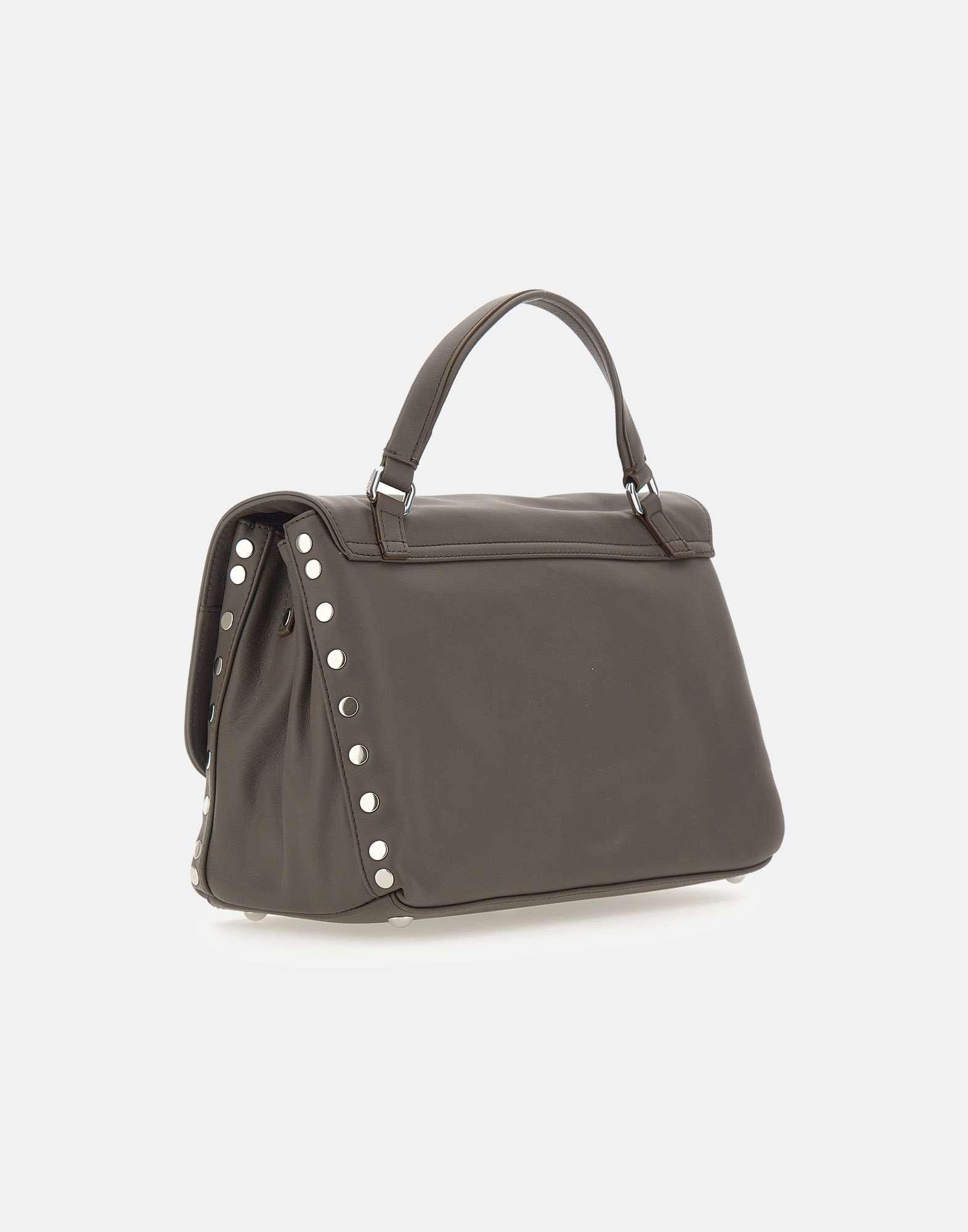 Borsa a mano Zanellato "Postina Saeta Small" realizzata in pelle color marrone scuro, dal design iconico e funzionale. Il modello presenta manico superiore e tracolla regolabile e removibile di circa 80 cm, per una portabilita versatile. La chiusura con meccanismo metallico a girella e le finiture silver lucido definiscono lestetica riconoscibile del brand. Linterno in tessuto e organizzato in due scomparti con tasca interna con zip, pensati per una gestione pratica degli oggetti personali. Completano il design le borchiette decorative e i piedini metallici al fondo, che garantiscono protezione e stabilita. Dimensioni: 30 x 20 x 12 cm. Dustbag inclusa. Made in Italy.
