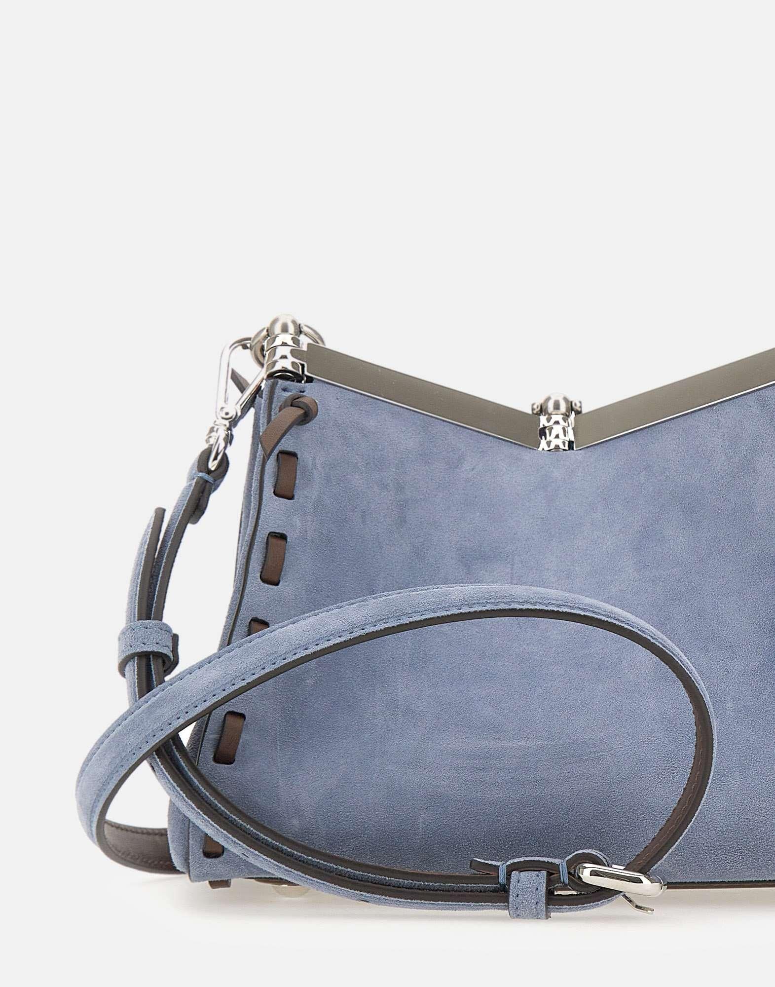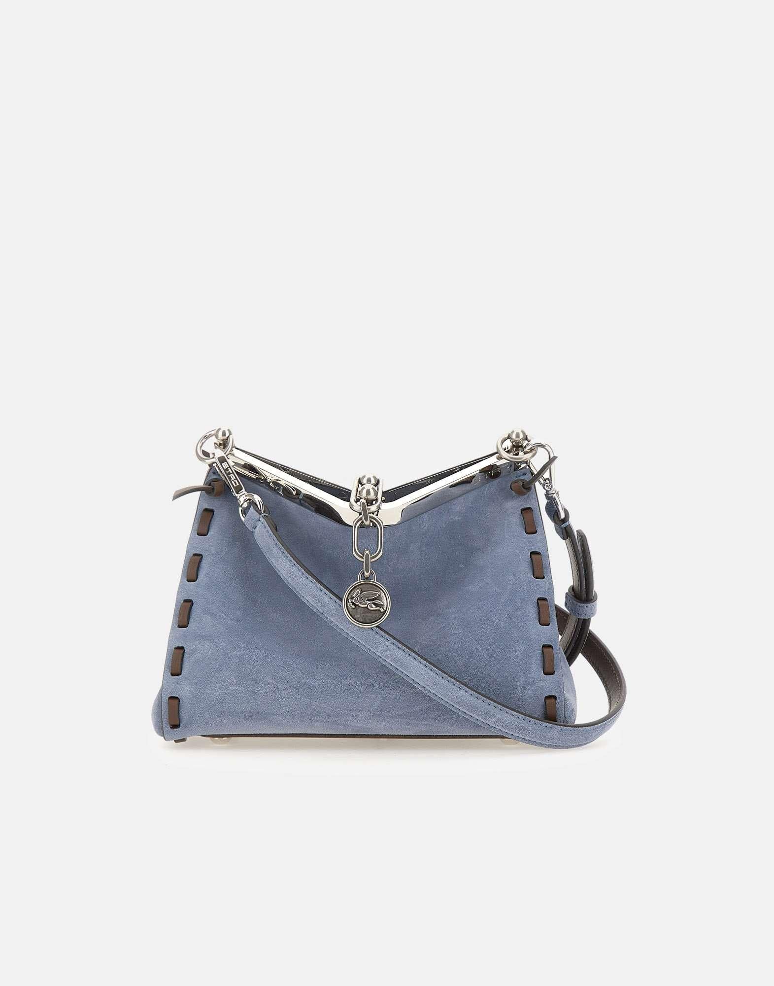Borsa Etro "Vela" in suede con infilature, iconico modello del brand, in pelle di vitello, color carta da zucchero, manico corto 27 cm, tracolla regolabile e removibile 55 cm, finiture metalliche silver lucido, distintiva chiusura in metallo centrale, medaglietta con logo Pegaso inciso con la tecnica della coniatura delle monete, interno in pelle, piedini in metallo al fondo. Misure: lunghezza 21cm, altezza 16cm, 9cm profondità.
