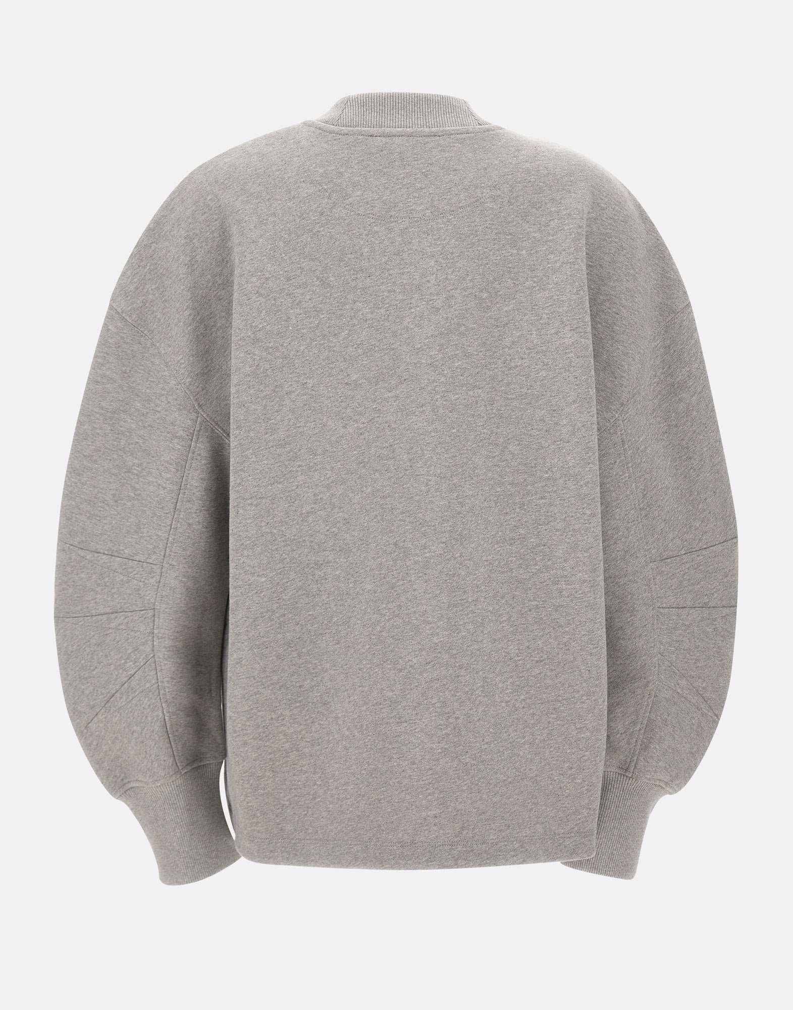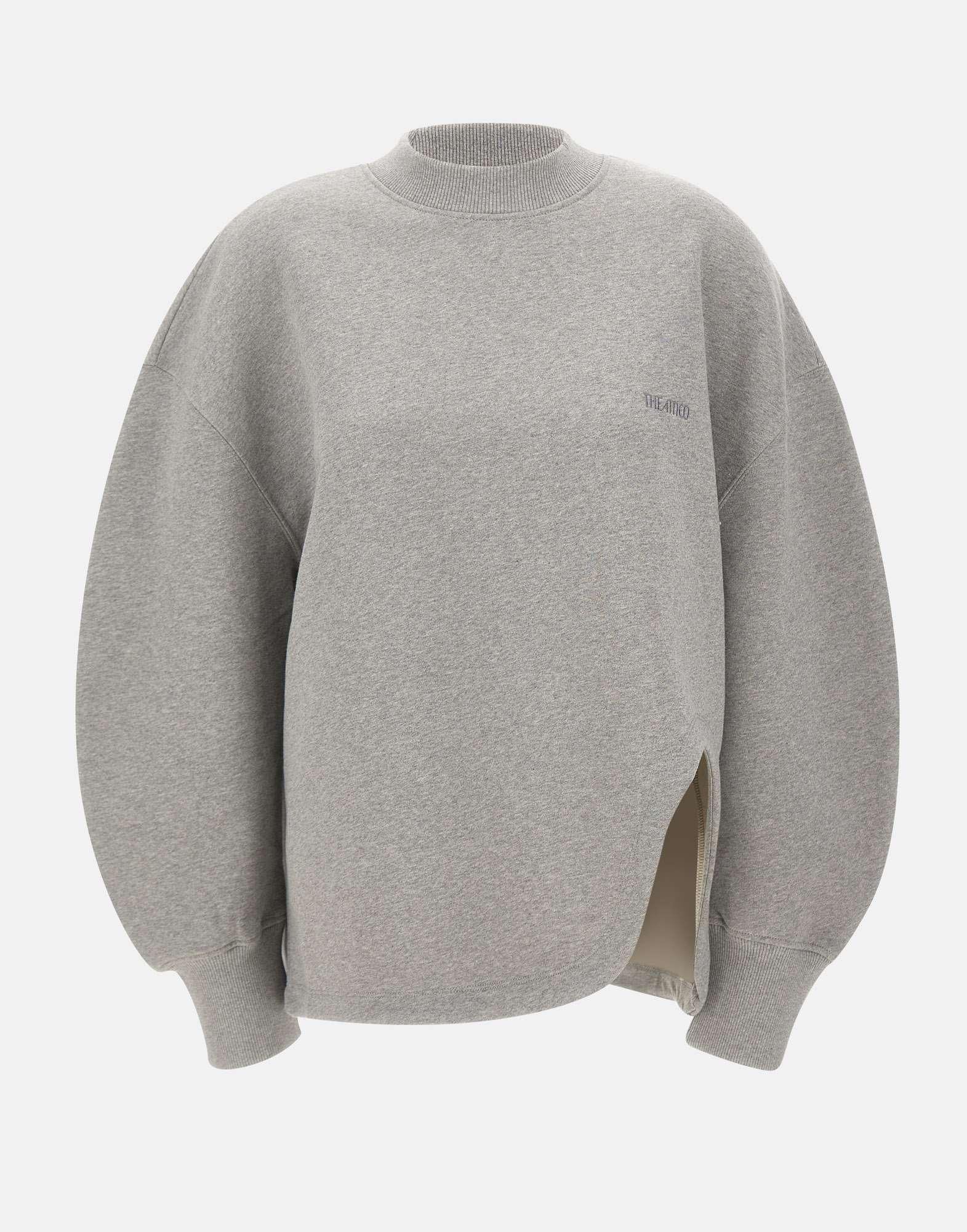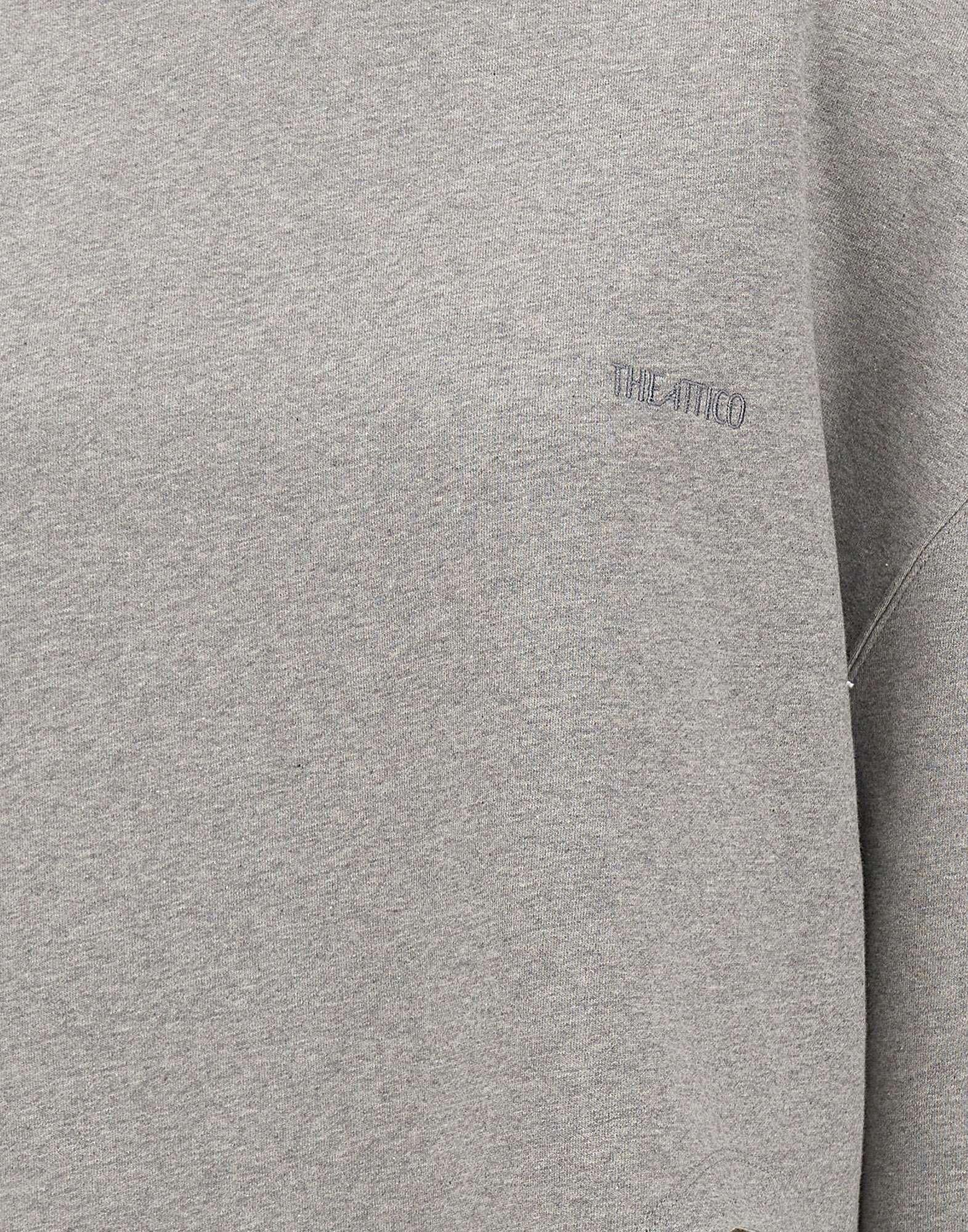 Felpa donna The Attico in pile americano di cotone color grigio melange, dal design contemporaneo e rilassato. Il modello presenta girocollo, spalle scese, maniche ampie e polsini a costine elasticizzati per un comfort ottimale. Lo spacco geometrico sul fronte aggiunge un tocco distintivo e moderno, mentre il logo ricamato ton sur ton sul petto firma il capo con discreta eleganza. Vestibilità over per un look urbano e sofisticato.