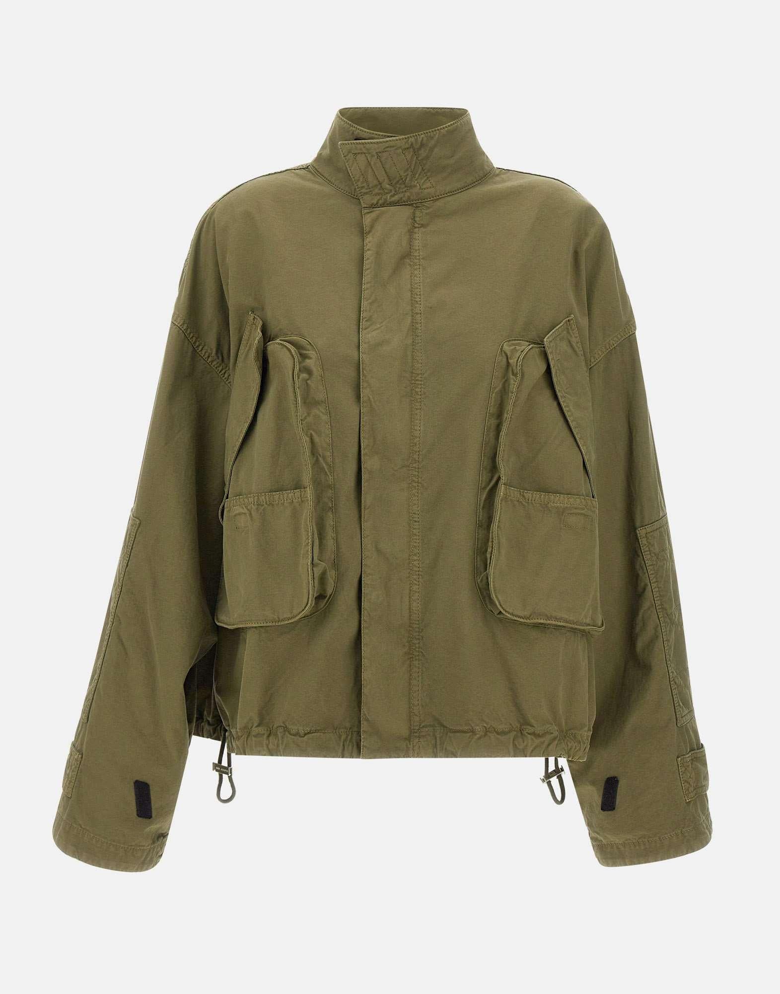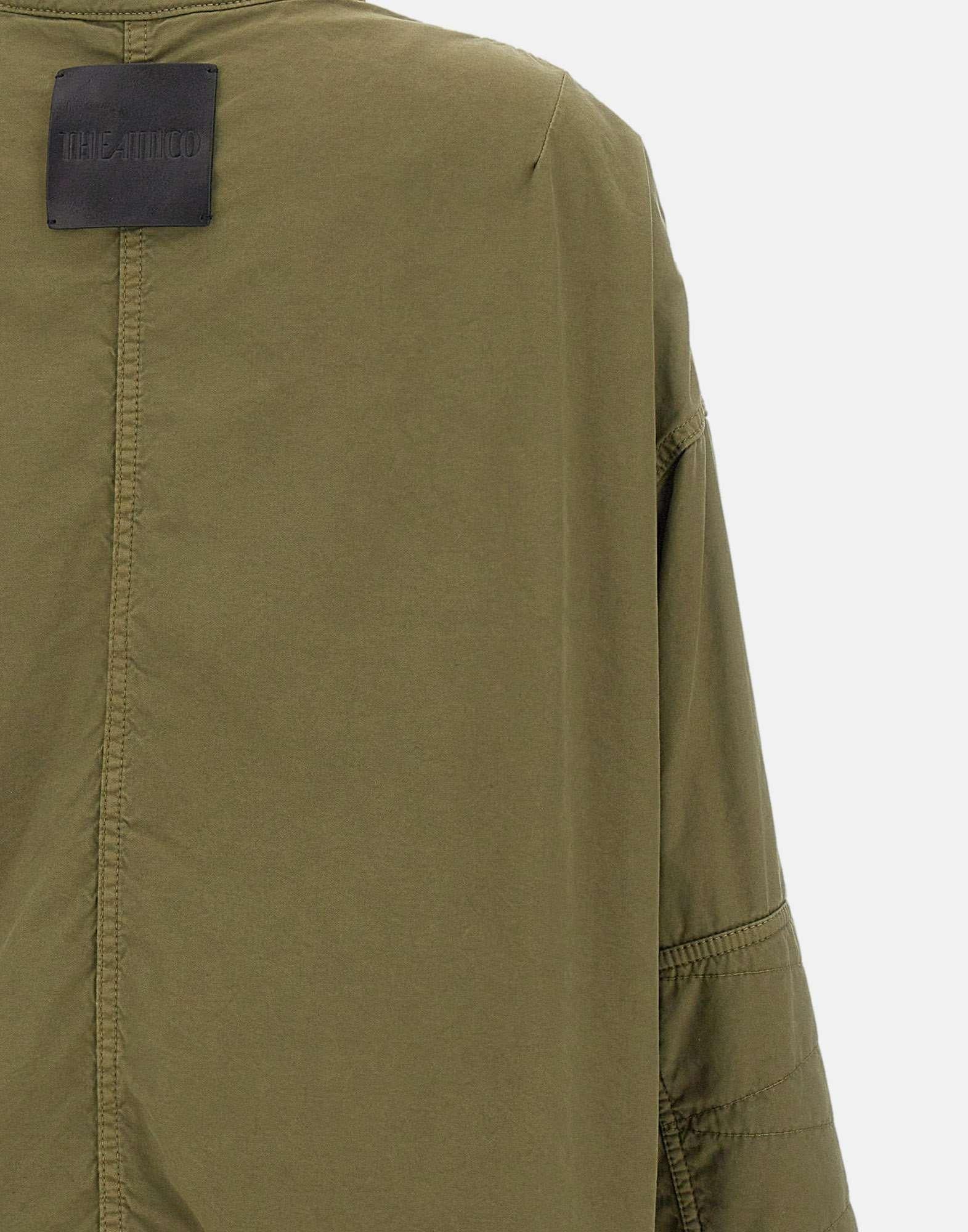 Giacca donna The Attico in cotone verde militare, dal design utility reinterpretato in chiave fashion. Presenta chiusura frontale con zip e bottoni a pressione, ampie tasche con patta e velcro, colletto regolabile e maniche larghe con polsini stringibili tramite fascette con velcro. Il fondo con coulisse consente di regolare la vestibilità. Patch logo in pelle applicata sul retro tra le spalle. Un capo funzionale e di carattere, perfetto per completare look decisi e contemporanei.
