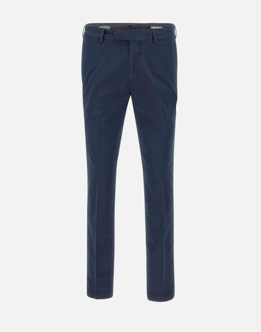 Pantaloni Devore Incipit uomo "Dvr3", blu navy, in cotone pima peruviano e seta stretch, tessuto lussuoso al tatto e all'indosso, chiusura con bottoni e zip, gamba dritta con fondo 17cm, passanti per cintura, tasche alla francese, tasche posteriori monofiletto, slim fit, made in Italy
