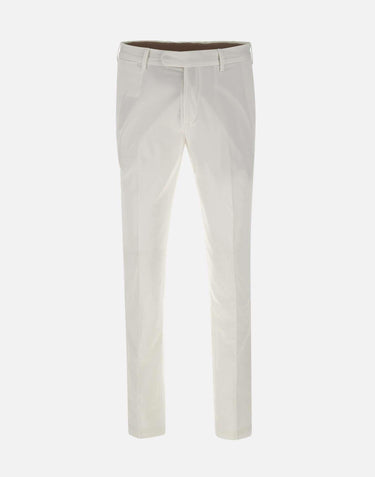 Pantaloni Devore Incipit uomo "Dvr3", colore bianco, in cotone pima peruviano e seta stretch, tessuto lussuoso al tatto e all'indosso, chiusura con bottoni e zip, gamba dritta con fondo 17cm, passanti per cintura, tasche alla francese, tasche posteriori monofiletto, slim fit, made in Italy