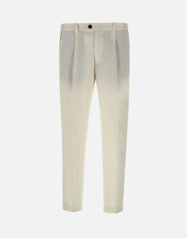 Pantaloni uomo Devore Incipit "Dvr47", colore bianco latte, in lino e tencel, tessuto extra morbido e lussuoso al tatto e all'indosso, pince singola sul davanti, tasche laterali alla francese, tasche posteriori monofiletto, vita con passanti per cintura e inserto elastico, chiusura con zip e bottone, gamba dritta con fondo 18cm e risvolto 3cm, slim fit, made in Italy.