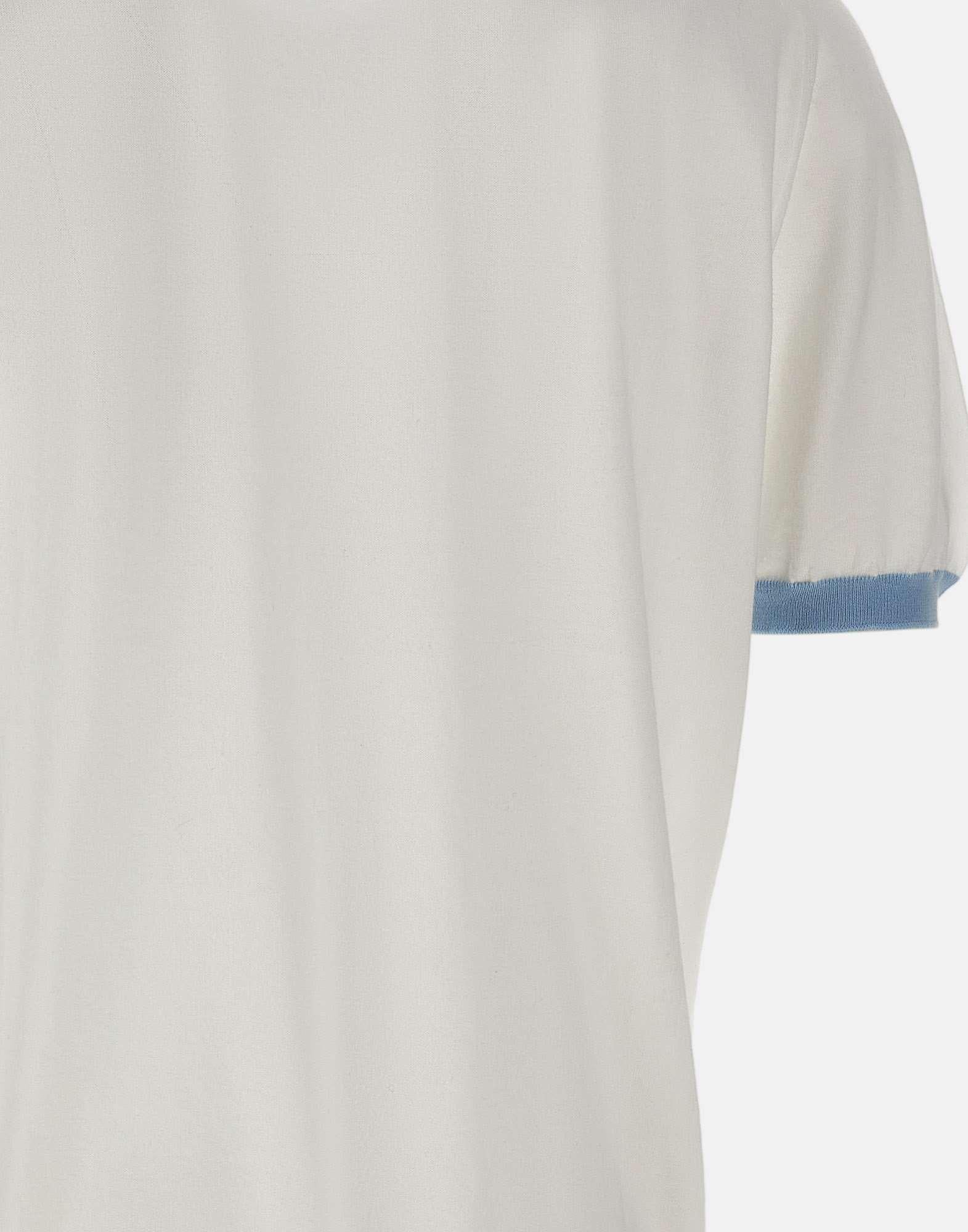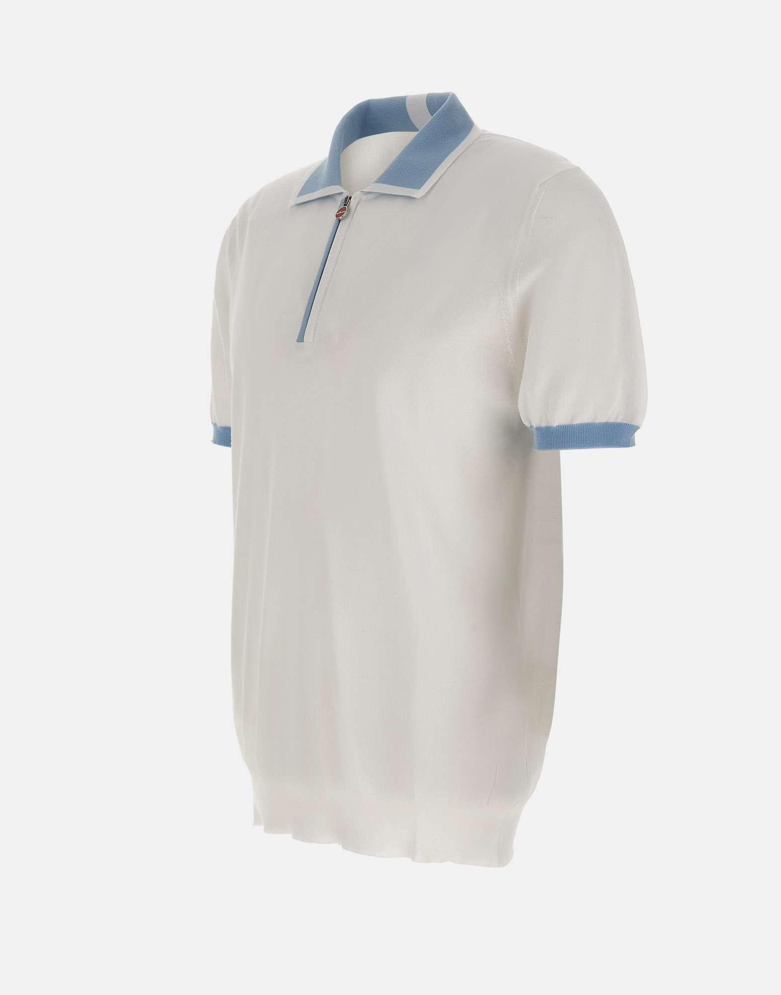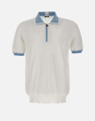 Eleganza sartoriale e comfort casual si incontrano nella polo Kiton in un filato di cotone di alta qualità, proposta nel versatile colore bianco con profili a contrasto celeste pastello. Un capo essenziale dal design raffinato. Dotata di maniche corte, colletto classico e bordi a costine, presenta una pratica chiusura a mezza zip con tirazip logato, dettaglio distintivo dello stile Kiton. Modello regular fit, ideale per ogni tipo di corporatura. Realizzata con la consueta maestria del Made in Italy, questa polo rappresenta un perfetto equilibrio tra lusso, funzionalità e stile.