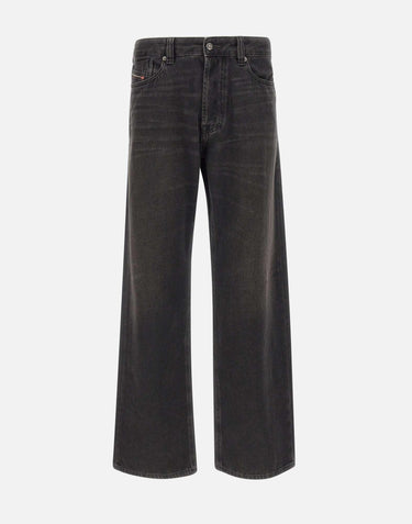 "Relaxed jeans 1980 d-eeper 09j96" uomo Diesel, colore nero, tessuto in denim di cotone 100%, vita regolare con passanti per cintura, modello cinque tasche, doppie cuciture a forma dell'iconico motivo Eagle sul retro, chiusura con bottoni nascosti, gamba dritta e larga con fondo 24cm, relaxed fit.