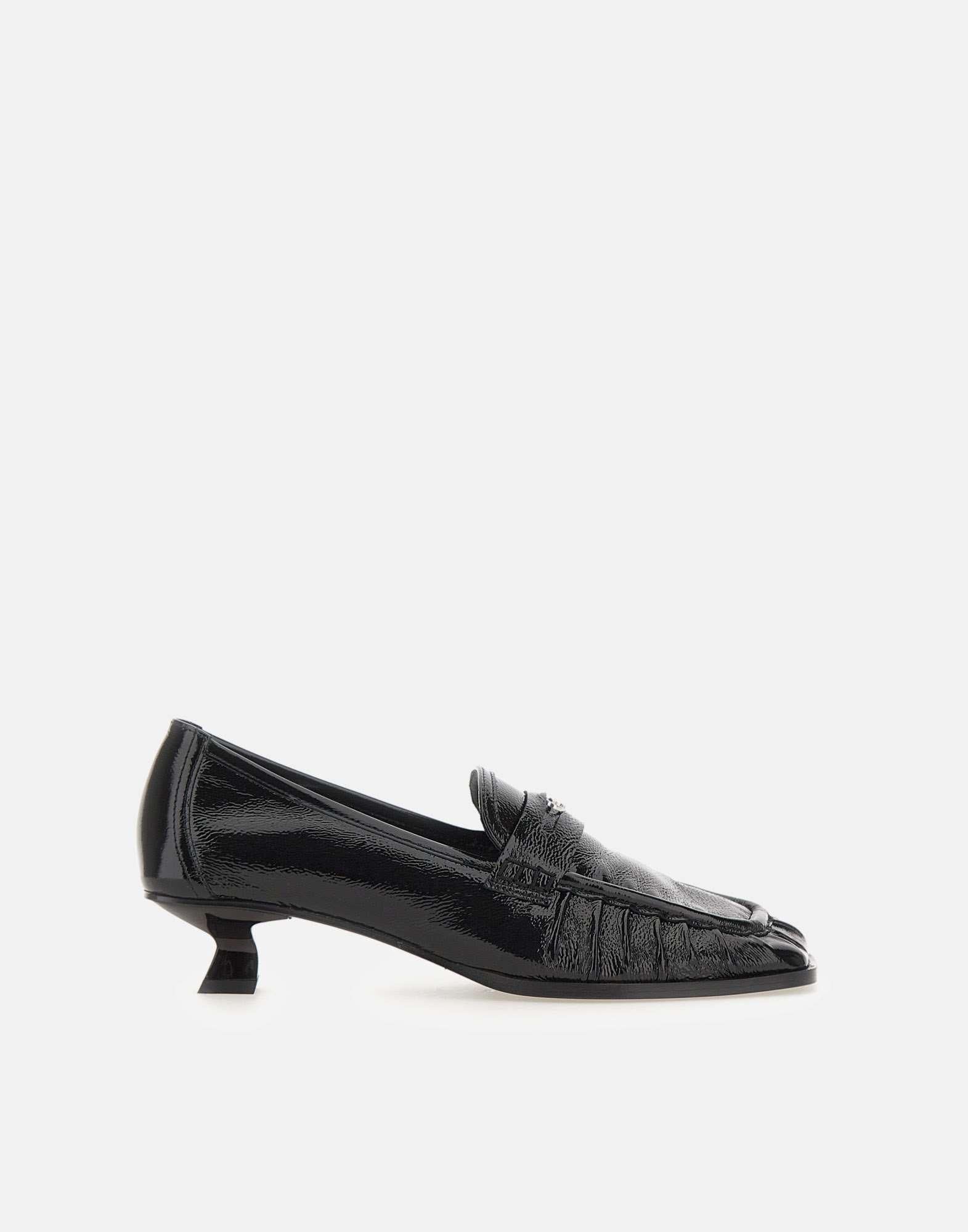 Scarpa donna Diesel "D-Amber Moc 30" in pelle nera lucida e leggermente increspata, dal design ispirato al classico mocassino. Caratterizzata da punta squadrata e tacco scultoreo alto 4 cm con profilo angolato, unisce eleganza e personalità contemporanea. Completata da una piccola placca metallica con logo Oval D applicata sulla sella, è una calzatura dallo stile deciso e sofisticato, perfetta per aggiungere un tocco distintivo ai look urbani.