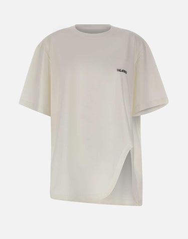T-Shirt uomo The Attico bianca, in puro cotone. Caratterizzata da una vestibilità oversize, presenta uno spacco sagomato sul fondo che aggiunge movimento e un tocco distintivo. Il logo ricamato in nero sul petto completa il design con uno stile essenziale ma riconoscibile. Un capo contemporaneo, perfetto per un look urbano e sofisticato.