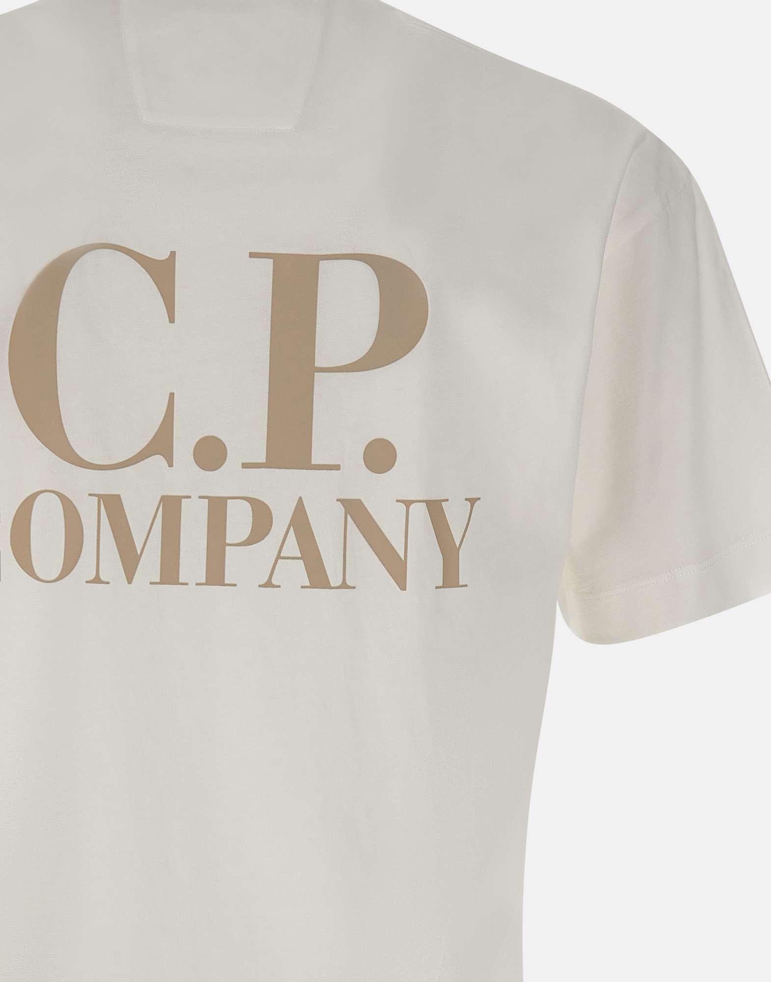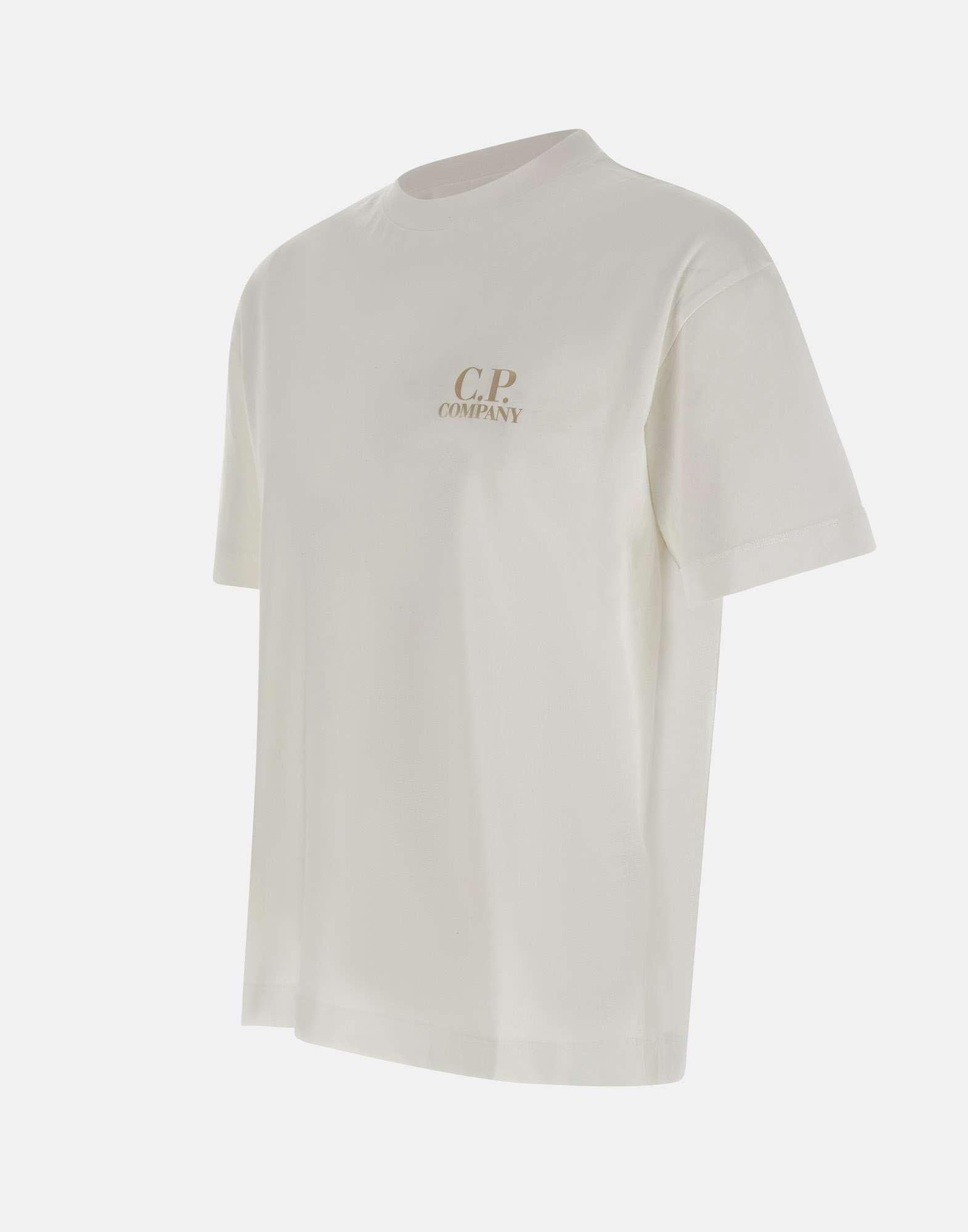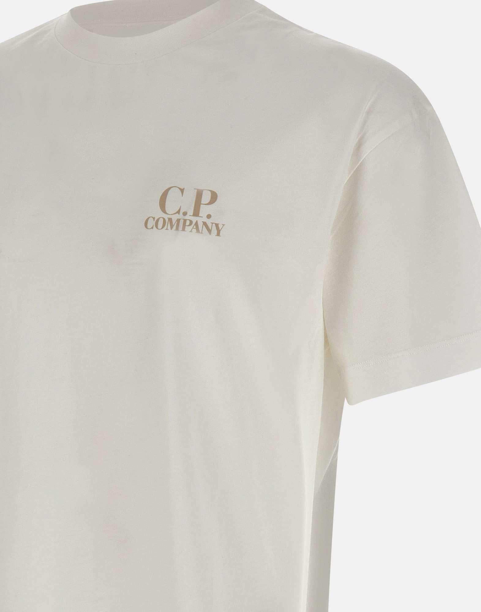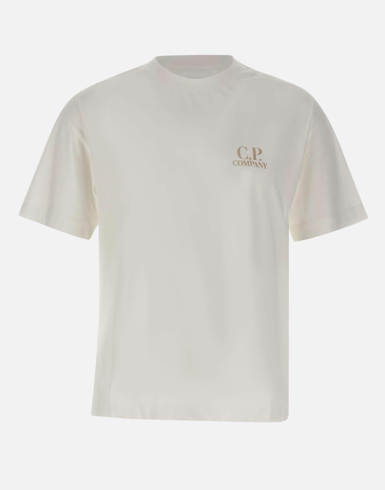 T-shirt uomo C.P. Company realizzata in cotone bianco, caratterizzata da un design essenziale con forte identita grafica. Presenta stampa logo color sabbia sul petto e maxi stampa logo color sabbia sul retro, che aggiungono un tocco distintivo e contemporaneo. Il modello e completato da maniche corte, girocollo con profili a costine e una vestibilita regular fit, ideale per un utilizzo quotidiano allinsegna del comfort e dello stile urban.