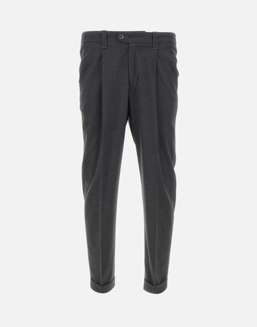 Pantalone uomo Devore Incipit grigio scuro, perfetto per un'eleganza contemporanea e versatile. Realizzato con chiusura a zip nascosta e bottone, presenta tasche anteriori all'italiana e tasche posteriori a filetto. Gli inserti elasticizzati sui fianchi assicurano comfort ottimale, mentre le pinces frontali donano struttura alla linea regolare. Lorlo con risvolto da 4 cm completa il design sofisticato. Ampiezza fondo: 18cm.