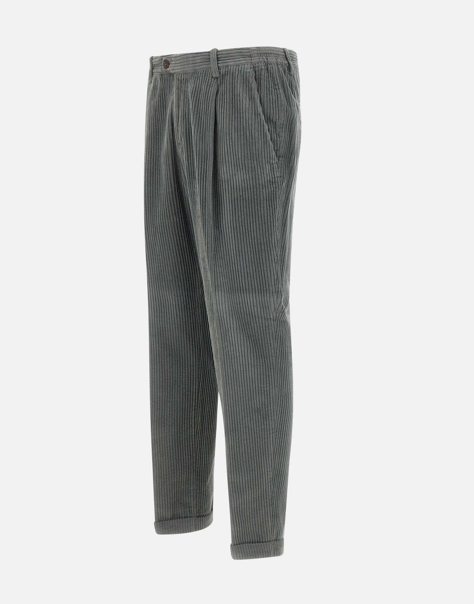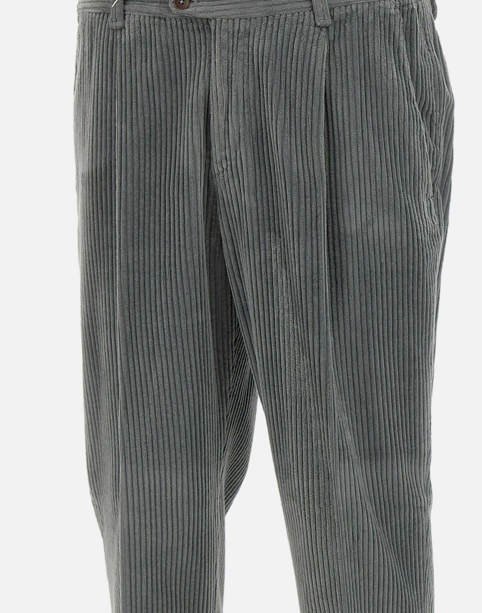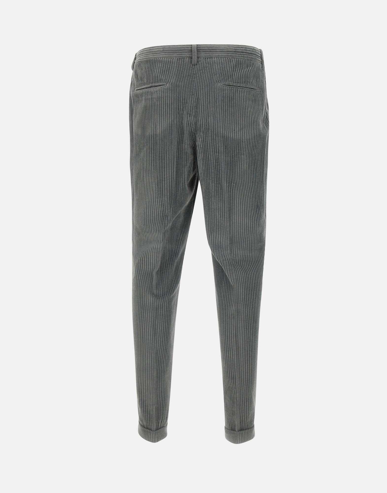 Pantalone uomo Devore Incipit in cotone grigio a maxi costine, con raffinato effetto velluto. Il modello presenta chiusura con zip nascosta e bottone, tasche anteriori nascoste e tasche posteriori a filetto. La vestibilità regolare assicura comfort, mentre il risvolto sull'orlo di 3 cm aggiunge un tocco contemporaneo. Perfetto per look eleganti e versatili. Ampiezza fondo: 17cm. Made in Italy.