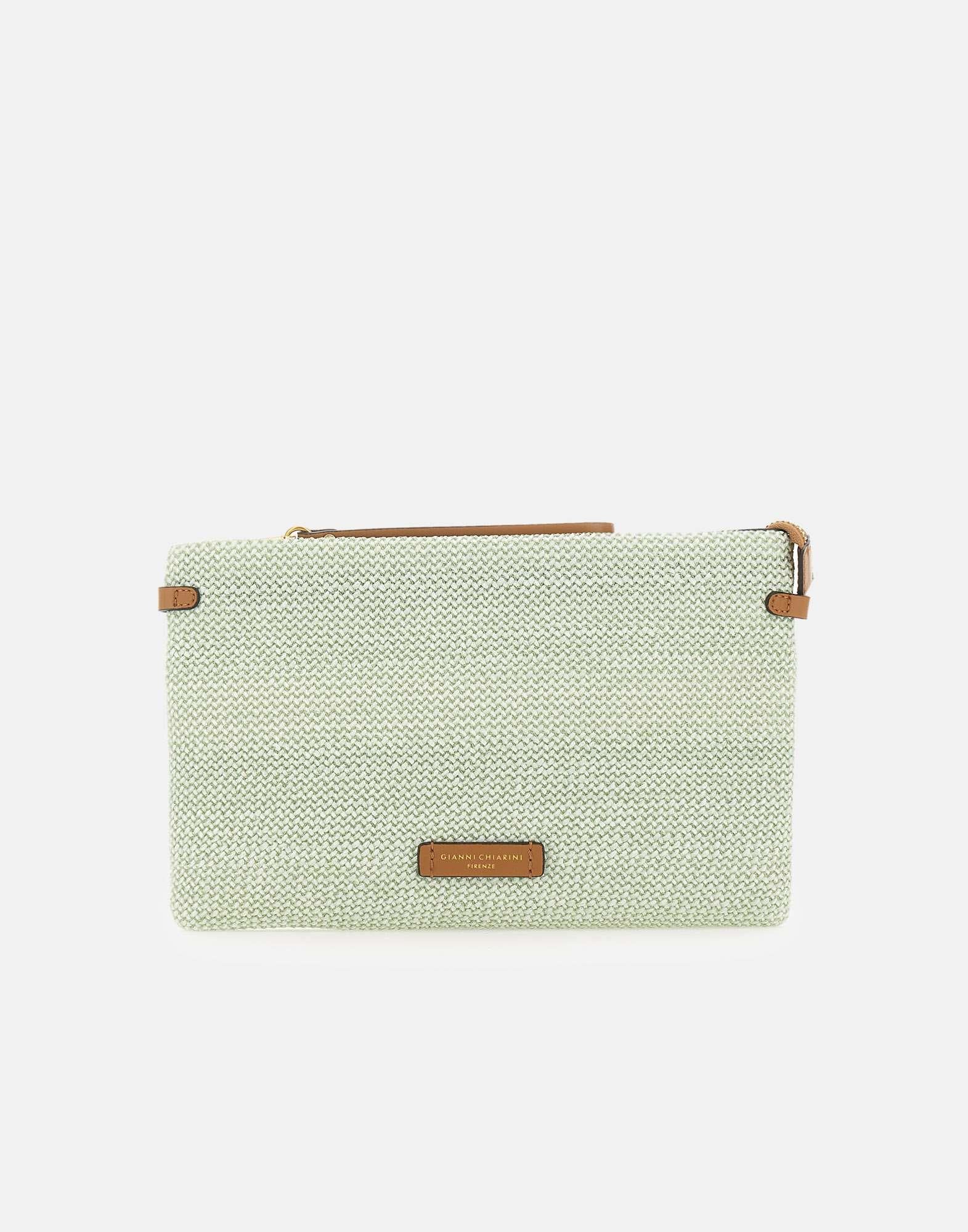 Pochette donna Gianni Chiarini modello "Hermy" realizzata in paglia color verde acqua con dettagli in pelle color cuoio, una clutch leggera e contemporanea pensata per la stagione estiva. La chiusura principale con zip protegge gli essenziali, mentre l'interno in canva e rifinito con patch interna logata. Da portare al polso oppure con la tracolla removibile e regolabile per una portabilità versatile, ideale per completare look casual ma curati. Made in Italy. Dimensioni: 28x18 cm.