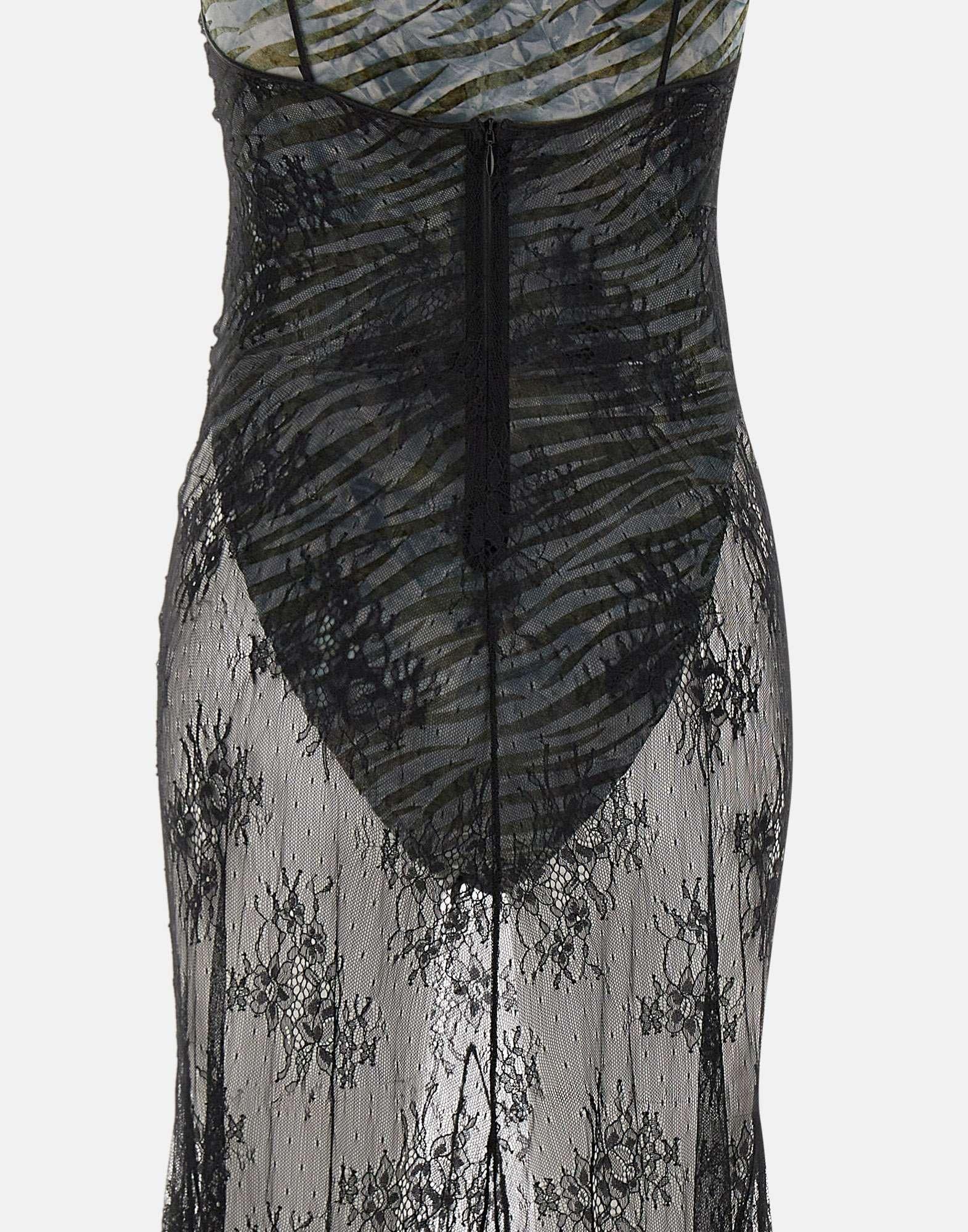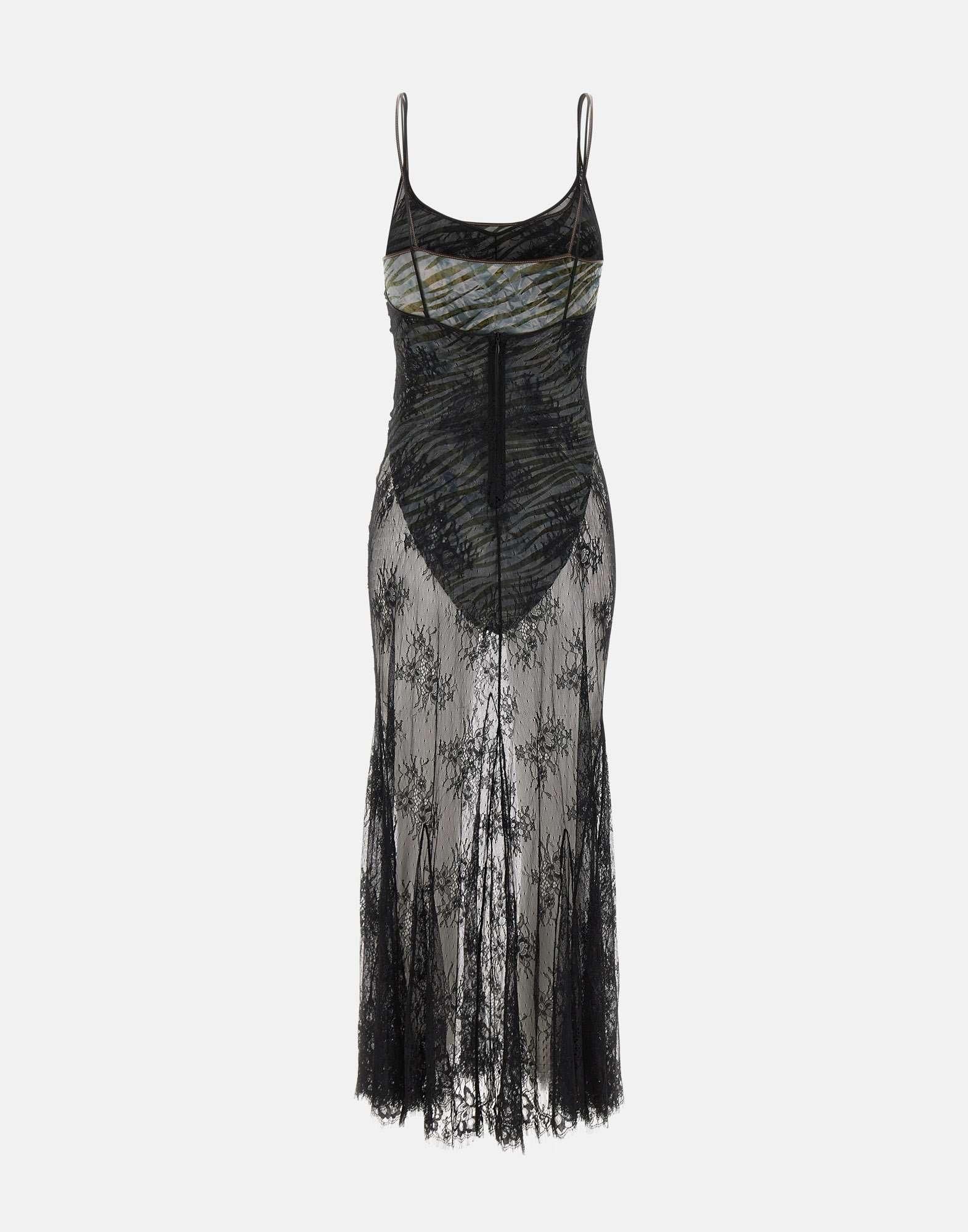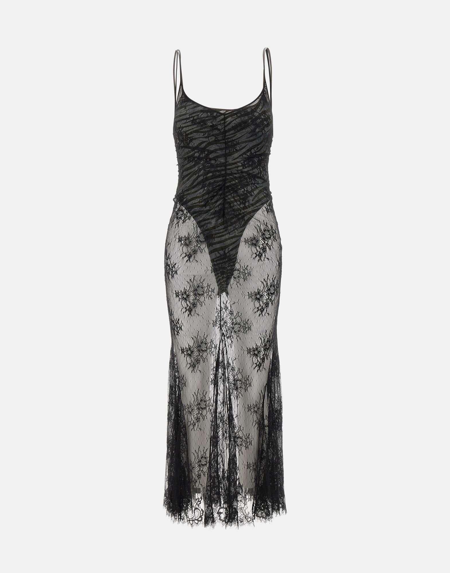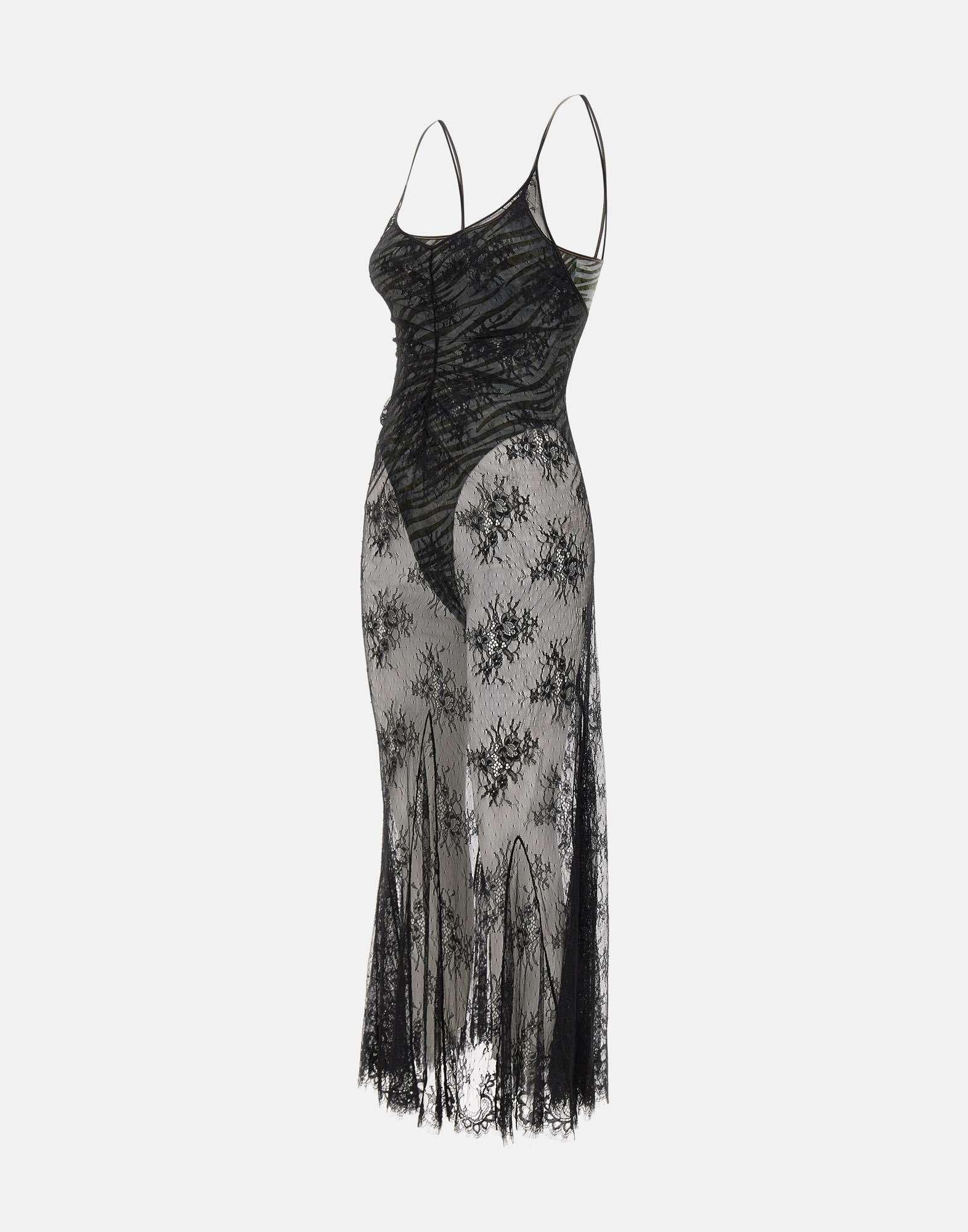 Abito lungo Jacques Wei in pizzo colore nero, body interno a fantasia zebrata nei toni del nero e grigio rifinito in seta. Modello con bretelline sottili e chiusura posteriore con zip invisibile. Vestibilità slim fit. Lavaggio a secco professionale.