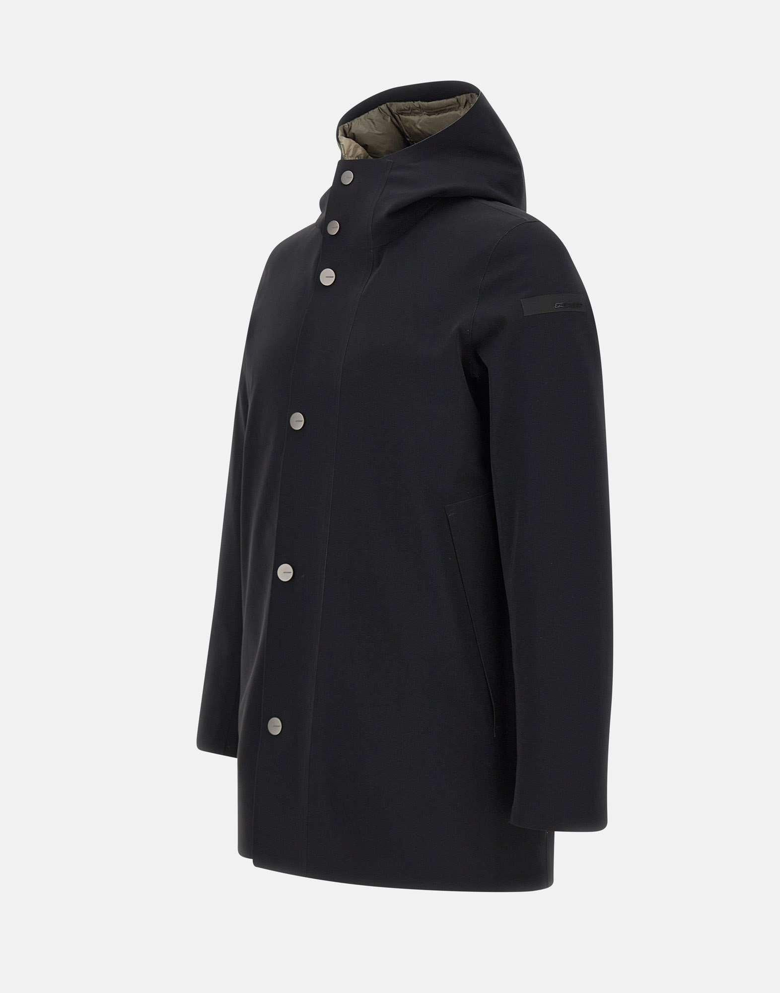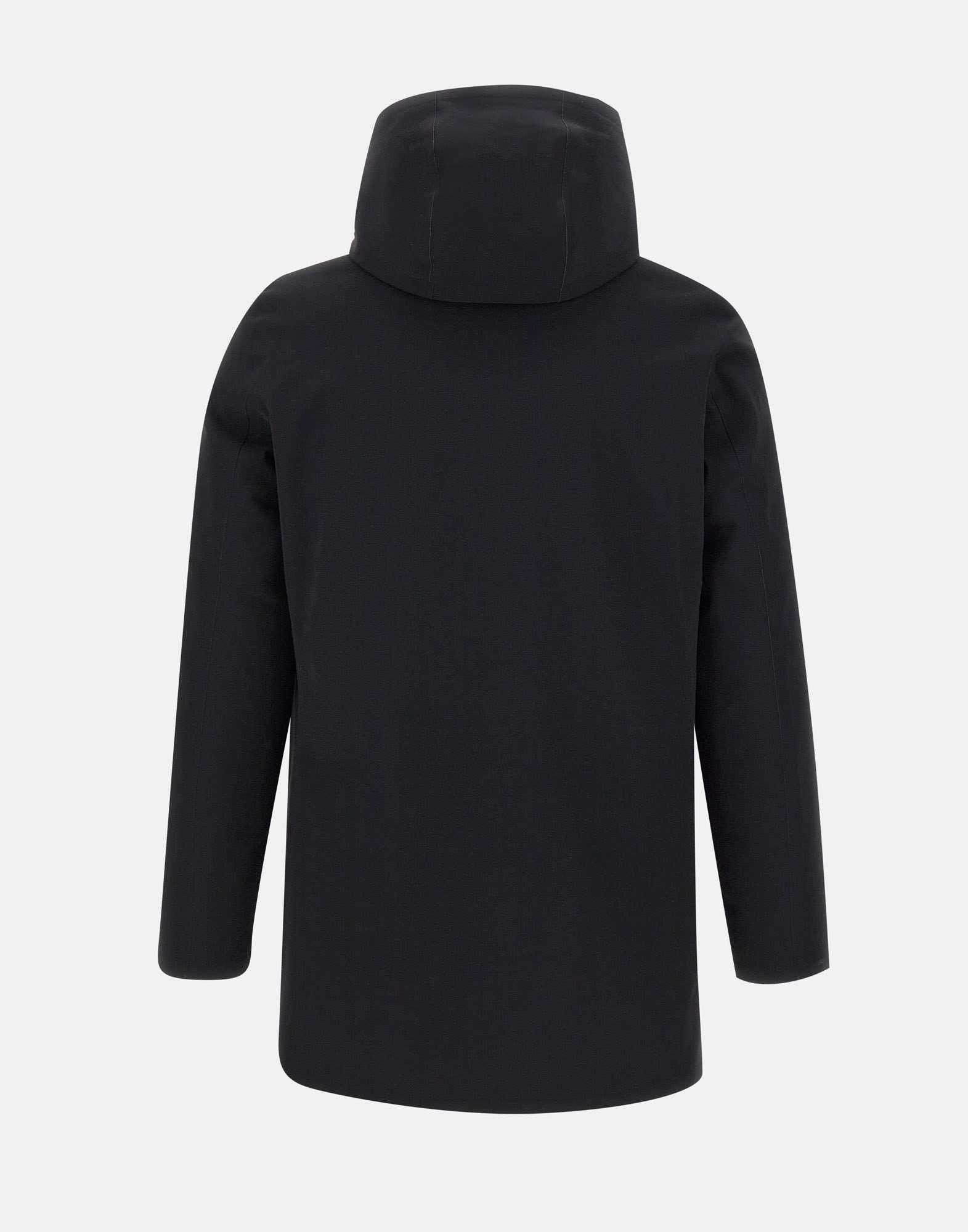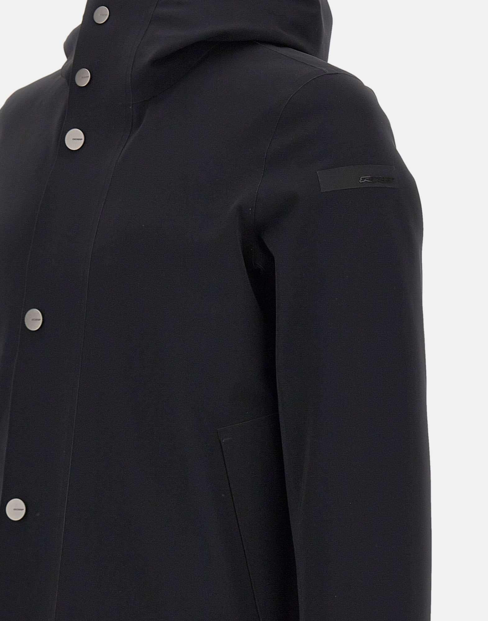 Parka uomo RRD "Surflex Winter Down Under Floating Parka Jkt" colore nero, dal design minimalista ed elegante con cappuccio fisso avvolgente. Realizzato in tessuto SURFLEX con costruzione Laser Glue Lock e membrana Stratofabric, è completamente impermeabile e resistente agli agenti atmosferici. Chiusura frontale con zip a doppio cursore nascosta da patta con bottoni a pressione e ampie tasche laterali a pistagna. Imbottitura in piuma danatra 90/10 con tecnologia Floating Shield per una vestibilità impeccabile e massimo comfort. Interno con taschino a zip invisibile rifinito da doppio filetto arancione fluo e tag "Made with love, designed in Tuscany". Logo a microiniezione nero sulla manica.