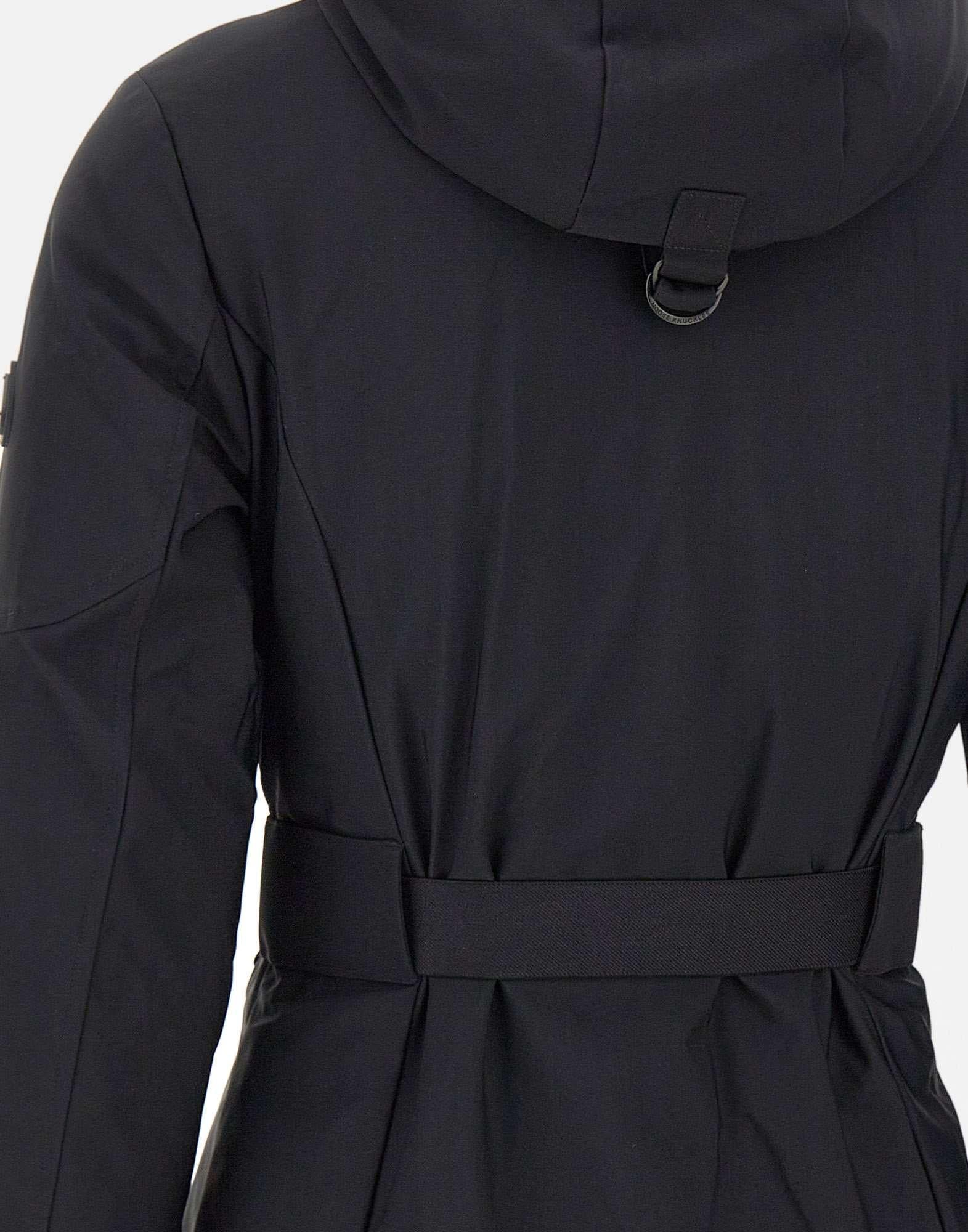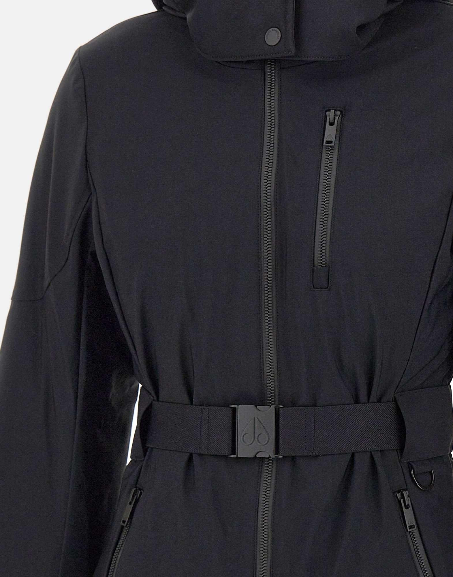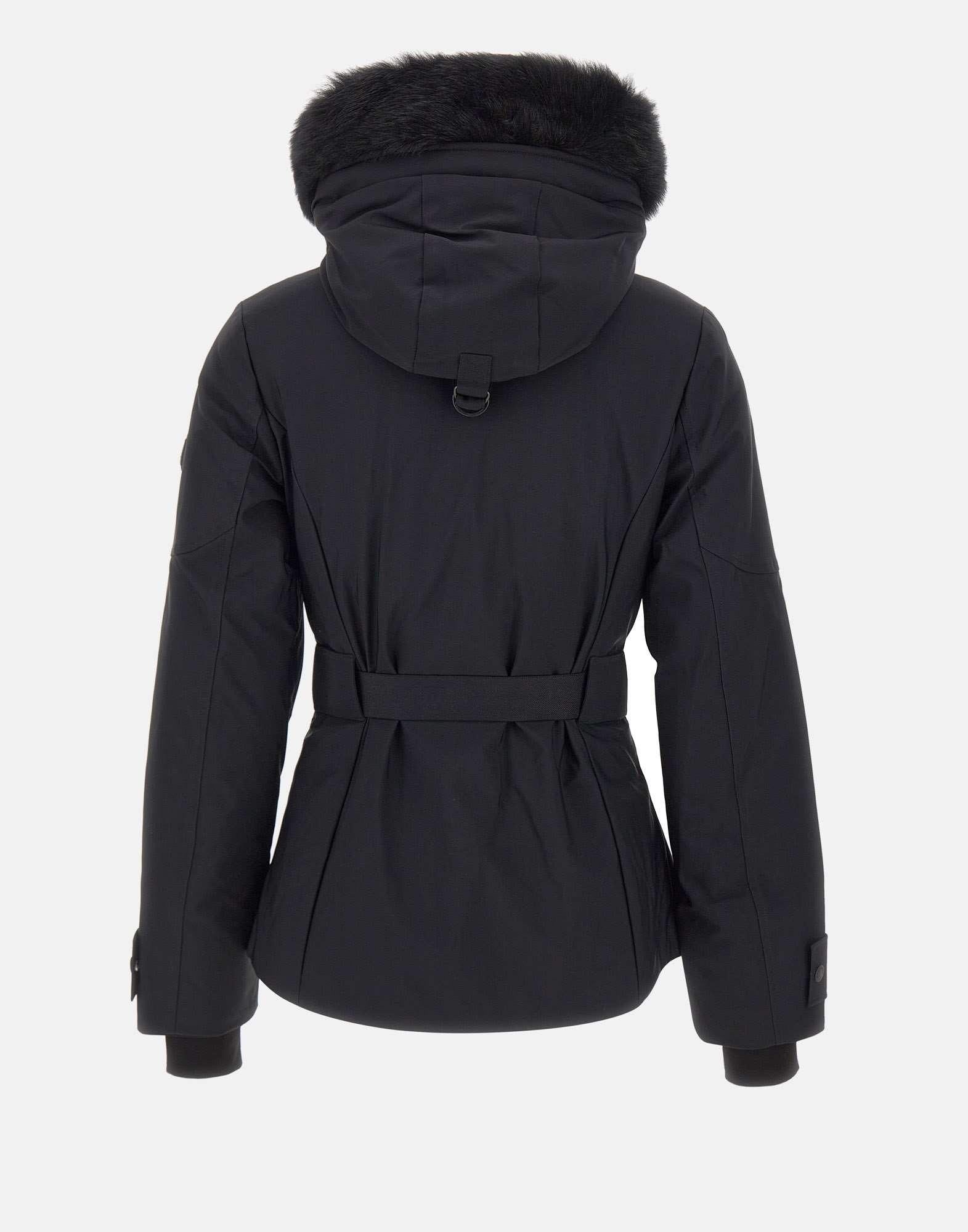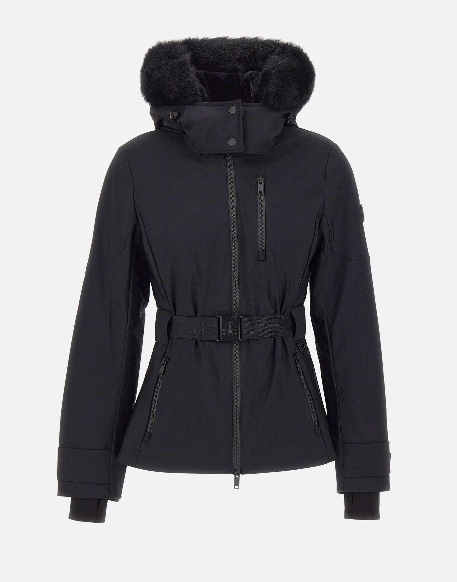 Giacca donna Moose Knuckles "Willowbank" in tessuto liscio e idrorepellente color nero, realizzata in poliammide e poliestere con imbottitura sintetica Polyfill che assicura calore e leggerezza. Il modello presenta cappuccio rimovibile con bordo in pelliccia sintetica, cerniera frontale bidirezionale, polsini regolabili con linguette e inserto interno con foro per il pollice. La cintura in vita removibile valorizza la silhouette, mentre le tasche con zip in vita, la tasca sul petto e la tasca porta-pass sulla manica garantiscono praticità. Rifinita con logo patch sulla manica sinistra e anello a D in vita, unisce performance e stile contemporaneo.