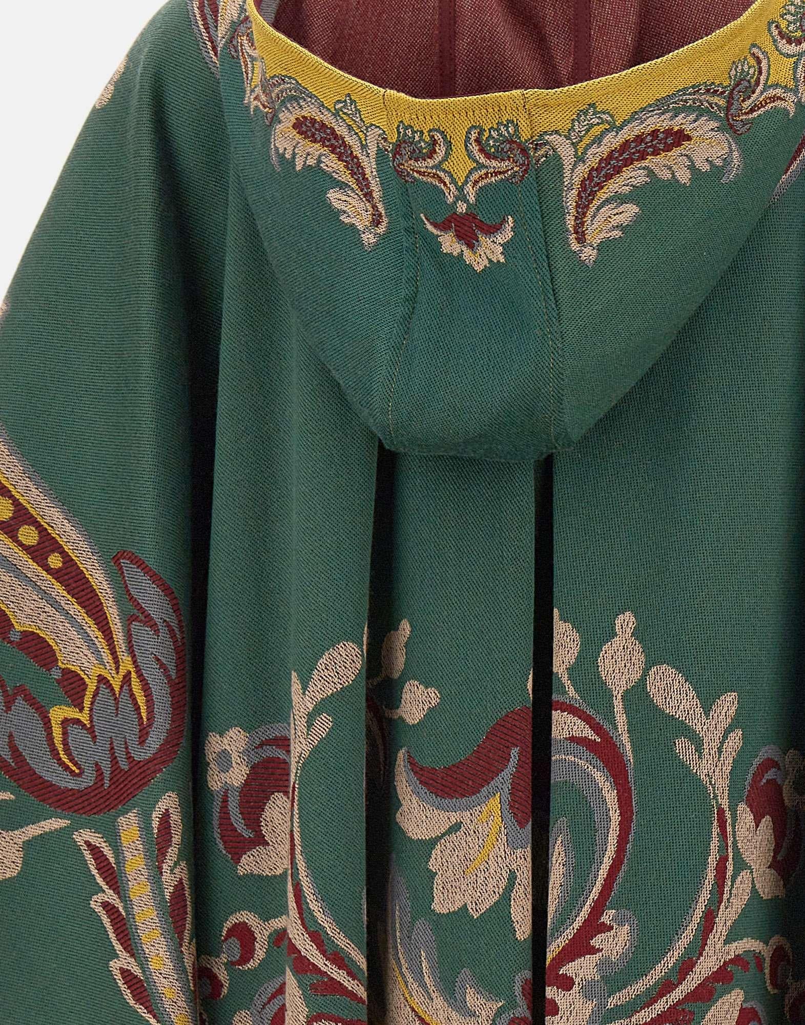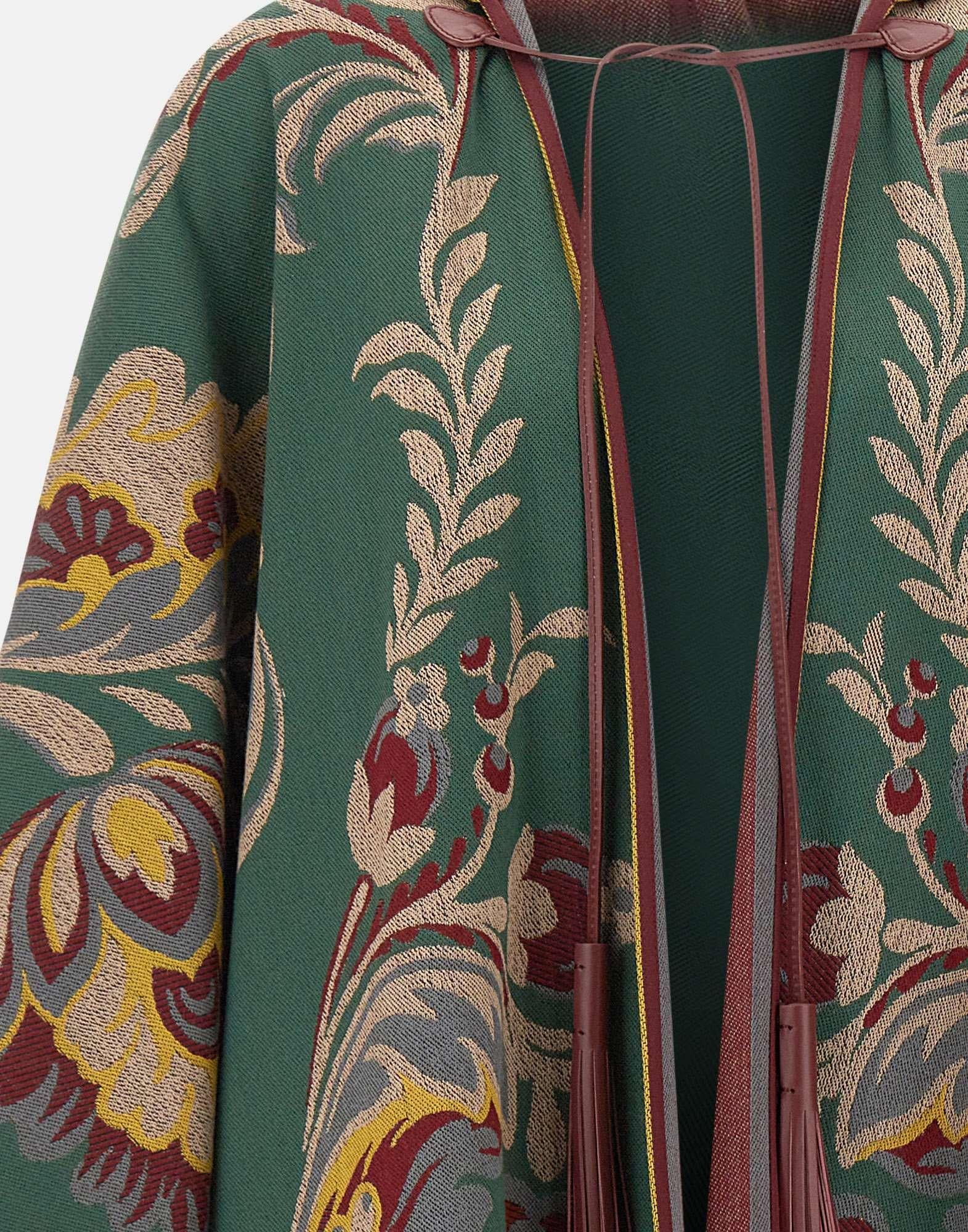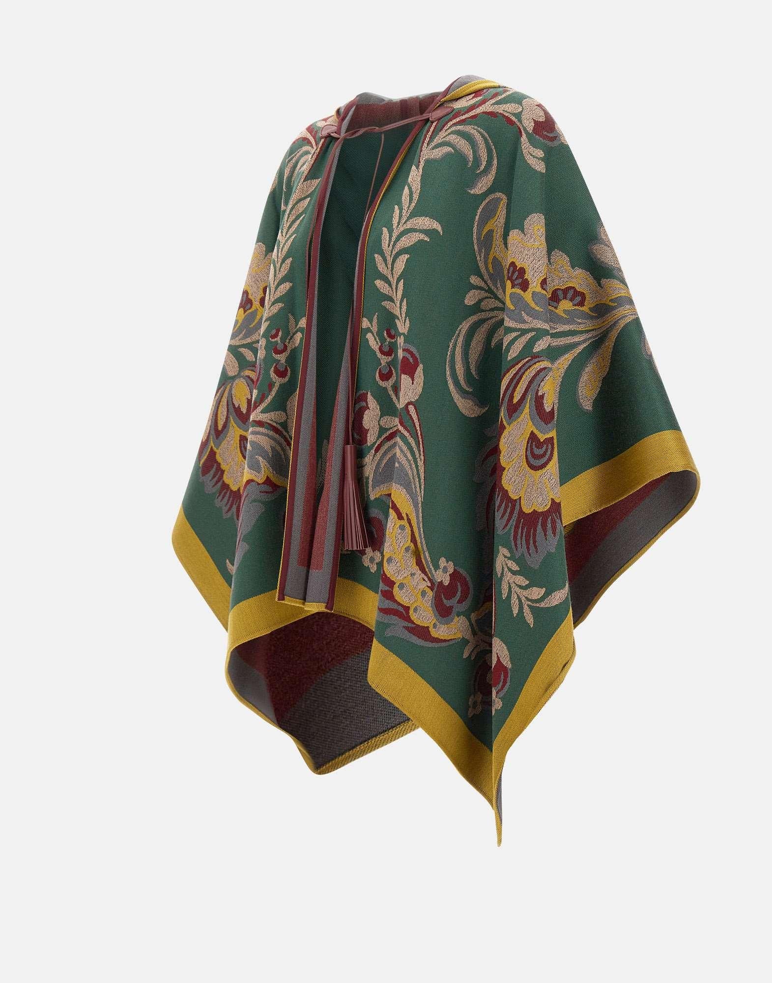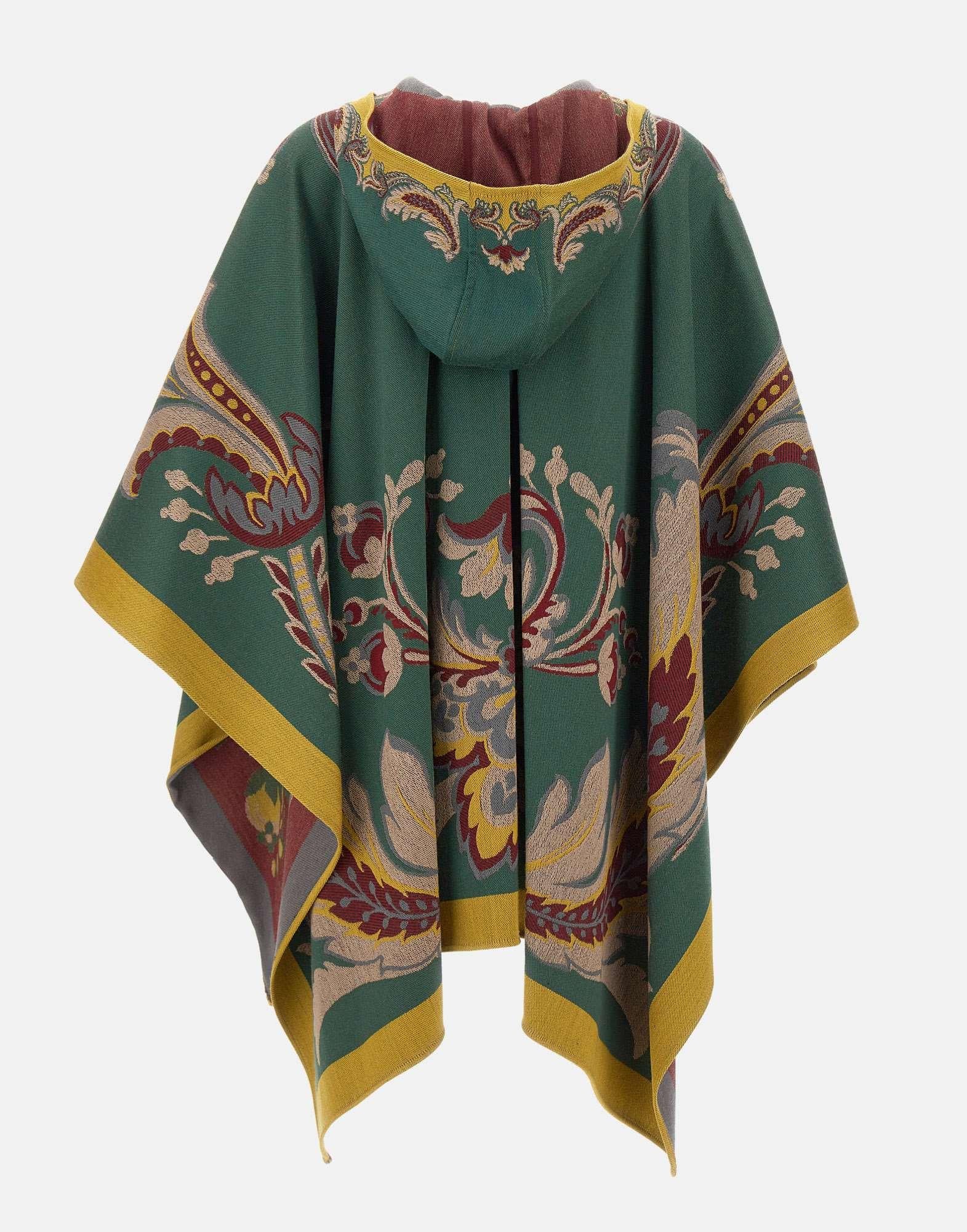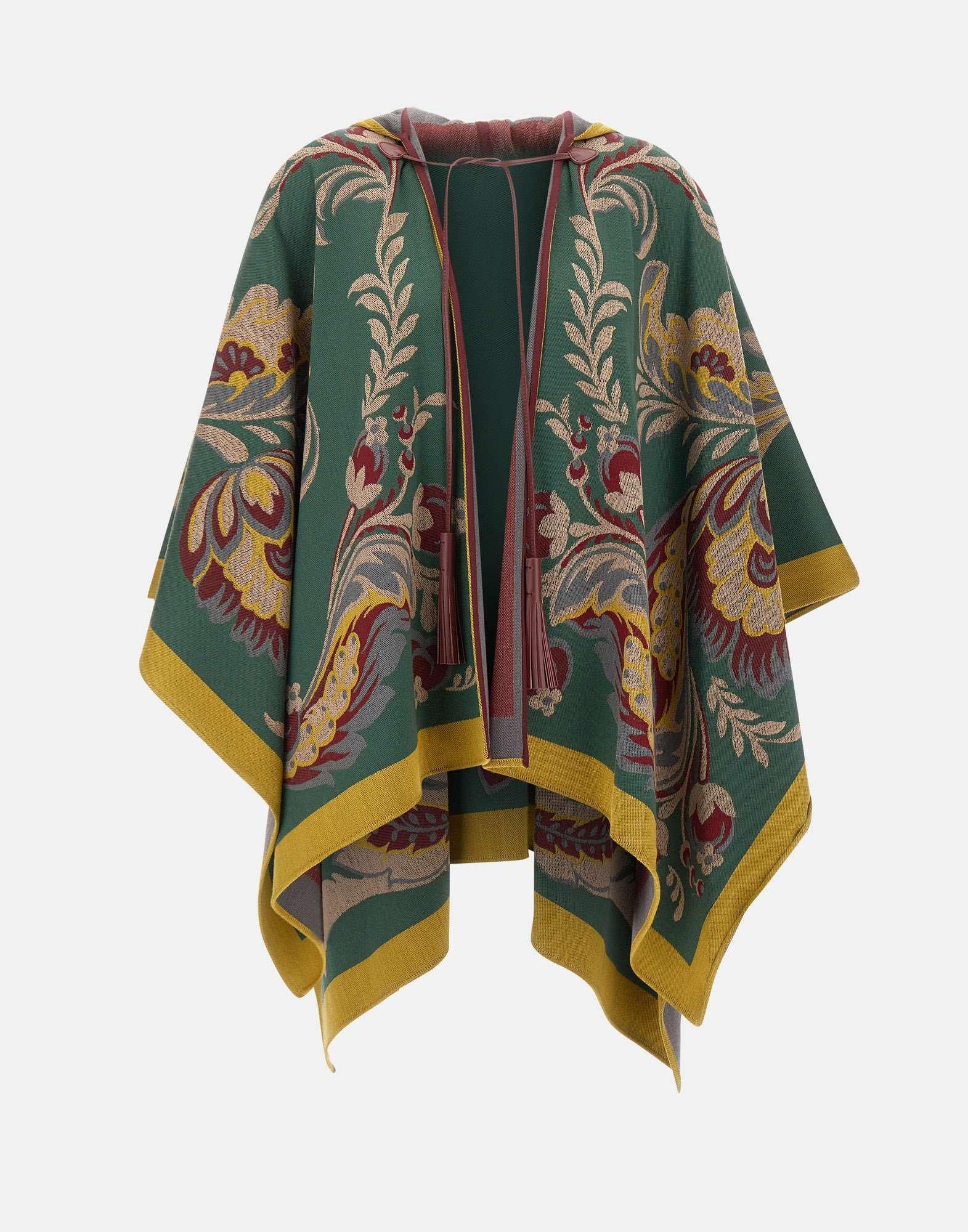 La mantella Etro è realizzata in un pregiato mix di lana e viscosa, lavorazione jacquard, impreziosita dal caratteristico motivo Paisley floreale piazzato multicolor. Il design presenta una chiusura con nappine, che aggiunge un tocco raffinato e artigianale. La vestibilità over e la texture morbida e fluida rendono il capo perfetto per completare look sofisticati e boho-chic. Taglia unica. Made in Italy.