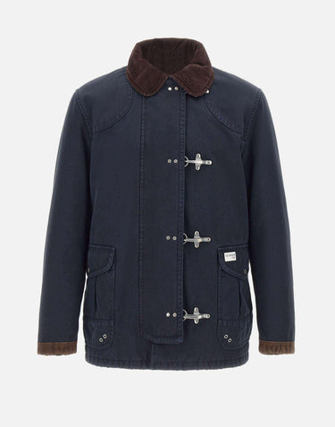 Iconico "4 Ganci Fay Archive" colore blu, capo cult del DNA workwear Fay dagli anni Ottanta. Ispirato alle divise dei pompieri americani, è realizzato in resistente cover di cotone con imbottitura in ovatta e fodera trapuntata a motivo cipolla a contrasto di colore. Caratterizzato da colletto in velluto, dettagli in crosta e inconfondibile chiusura con quattro ganci in metallo e automatici nascosti. Completano il design le maxi tasche con patta e il taschino interno. Etichetta Fay Archive cucita sulla tasca sinistra. Made in Italy. Vestibilità comfort.