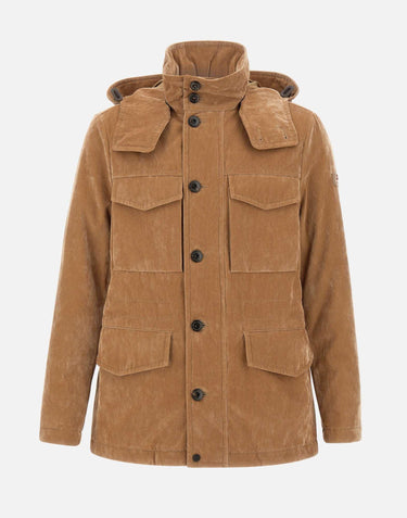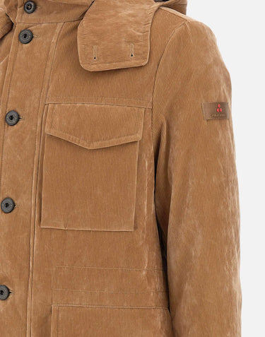 Giacca Peuterey "Athol" colore cammello, realizzata in velluto a costine di misto cotone e viscosa. Il design combina eleganza e funzionalità con cappuccio removibile e regolabile, chiusura frontale con zip e bottoni, e quattro tasche anteriori pratiche. L'imbottitura sintetica con trapuntatura a onde assicura comfort termico e leggerezza. Dettagliata dal logo Peuterey sulla manica sinistra. Regular fit.