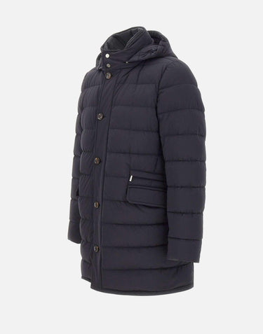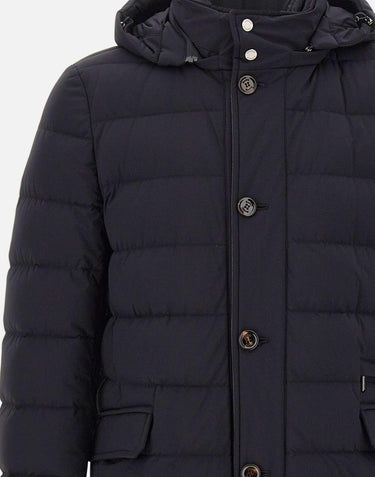 Moorer "Kalandri KN" blu notte, unisce eleganza sartoriale e tecnologia performante. Realizzato in tessuto bielastico resinato idrorepellente, compatto e resistente, fa parte della linea Acqua (1 ombrellino), ideale per affrontare pioggia e freddo. Il design monopetto a linea dritta, trapuntato in piuma doca per un comfort termico superiore, presenta stacchino trapuntato e cappuccio removibili, chiusura con bottoni in corno, tasche anteriori con pattina e tasche interne funzionali. Un capo raffinato, sinonimo delleccellenza Made in Italy, progettato per garantire una thermal experience da -12°C a +8°C.