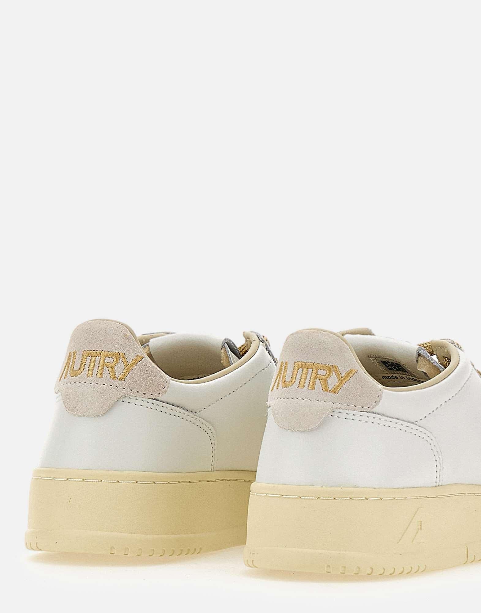 Sneakers da donna Autry Medalist Low in pelle, ispirate alle iconiche tennis anni 80 e reinterpretate in chiave contemporanea. I dettagli in lurex color oro aggiungono un tocco di luce sofisticata: dai lacci tondi al logo laterale con effetto brillante, ogni elemento esalta lidentità del modello. Il talloncino in suede beige presenta il logo Autry ricamato tono su tono, mentre la punta microtraforata favorisce la traspirazione. La linguetta è completata da unetichetta ricamata cucita con cura. La fodera interna combina pelle e spugna di cotone per un comfort ottimale, sostenuta da una suola in gomma alta 3 cm. Calzata regolare.