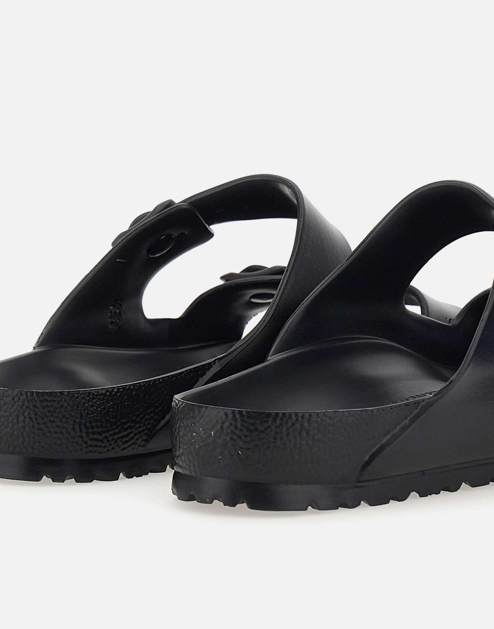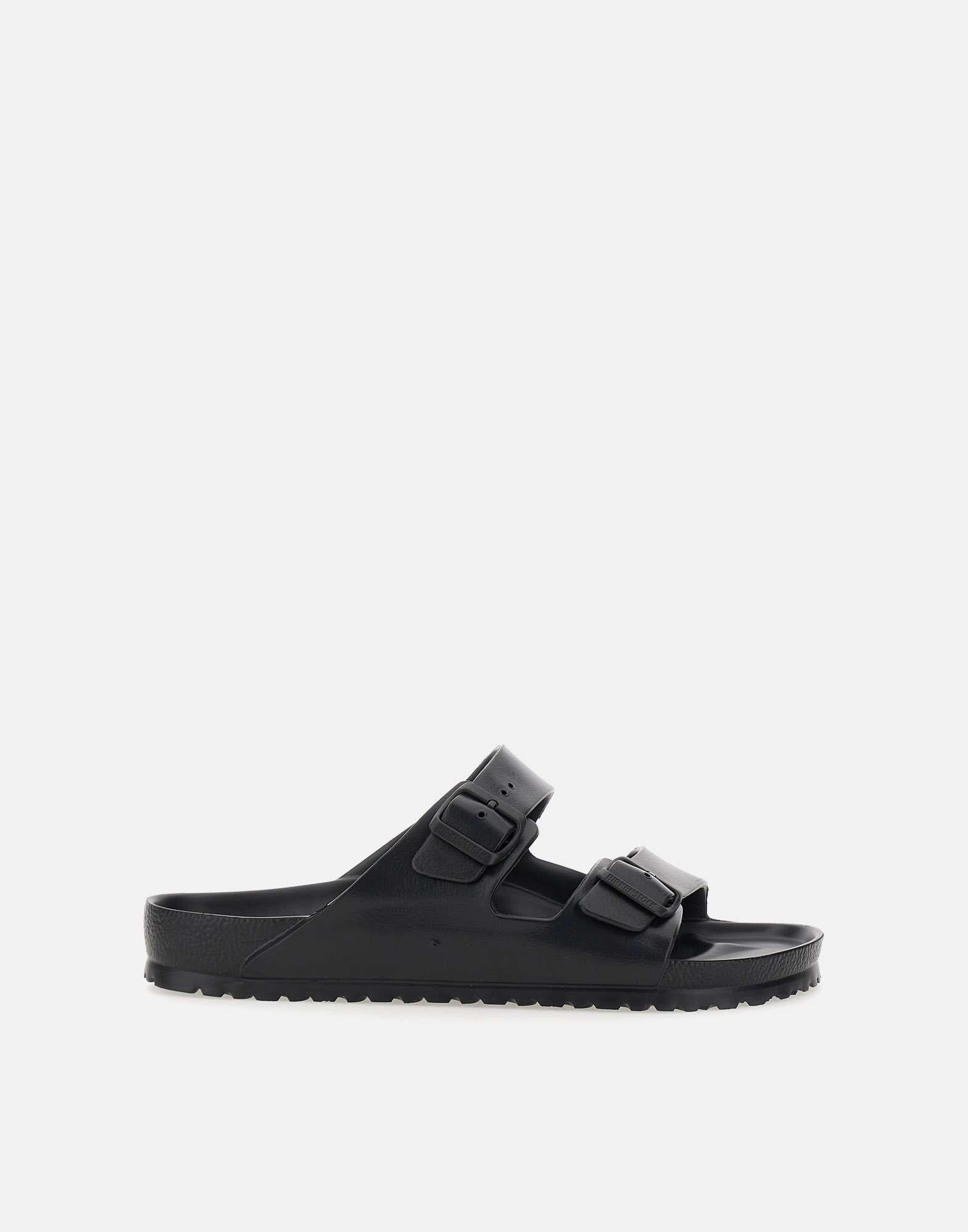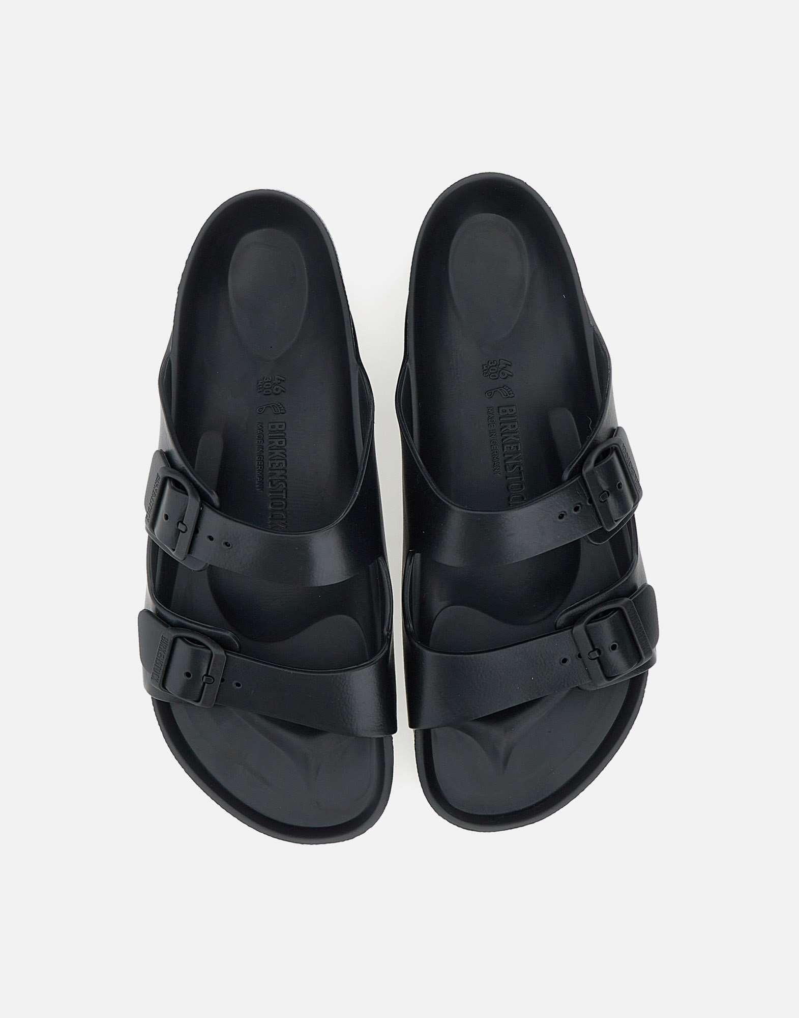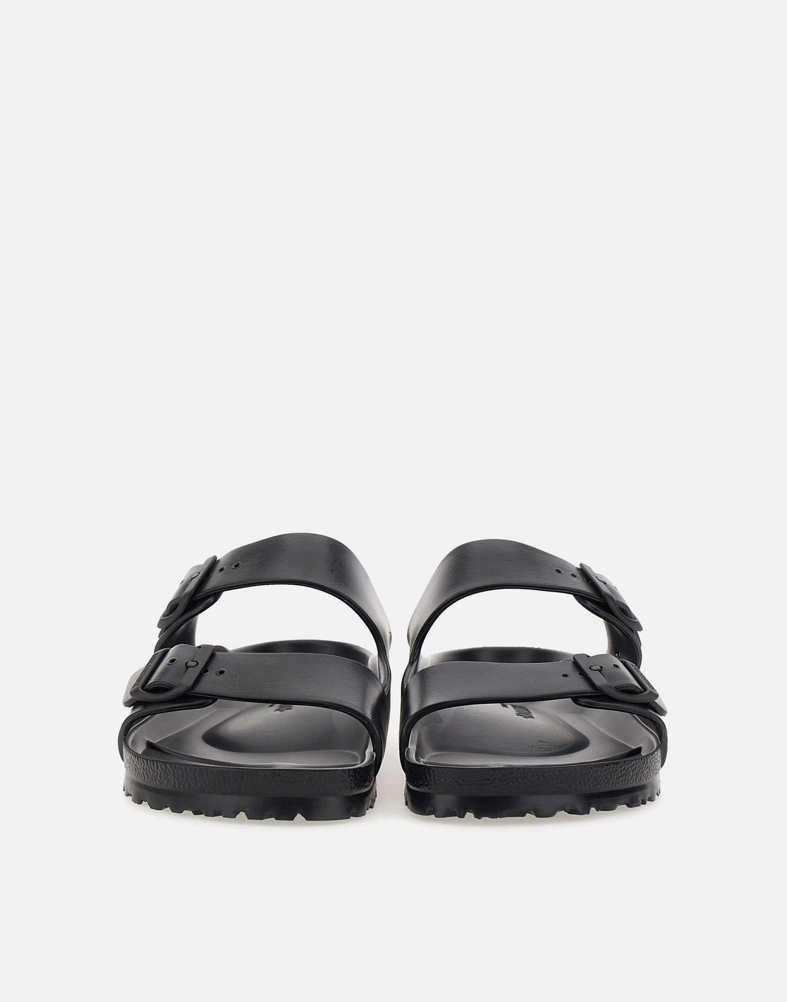 Ciabatte uomo Birkenstock "Arizona Eva", nere, design senza tempo, leggere, impermebili, comode, tomaia in EVA, due cinturini con fibbie regolabili, logo impresso laterale e sulle fibbie, plantare anatomico, suola in gomma alta 1cm.