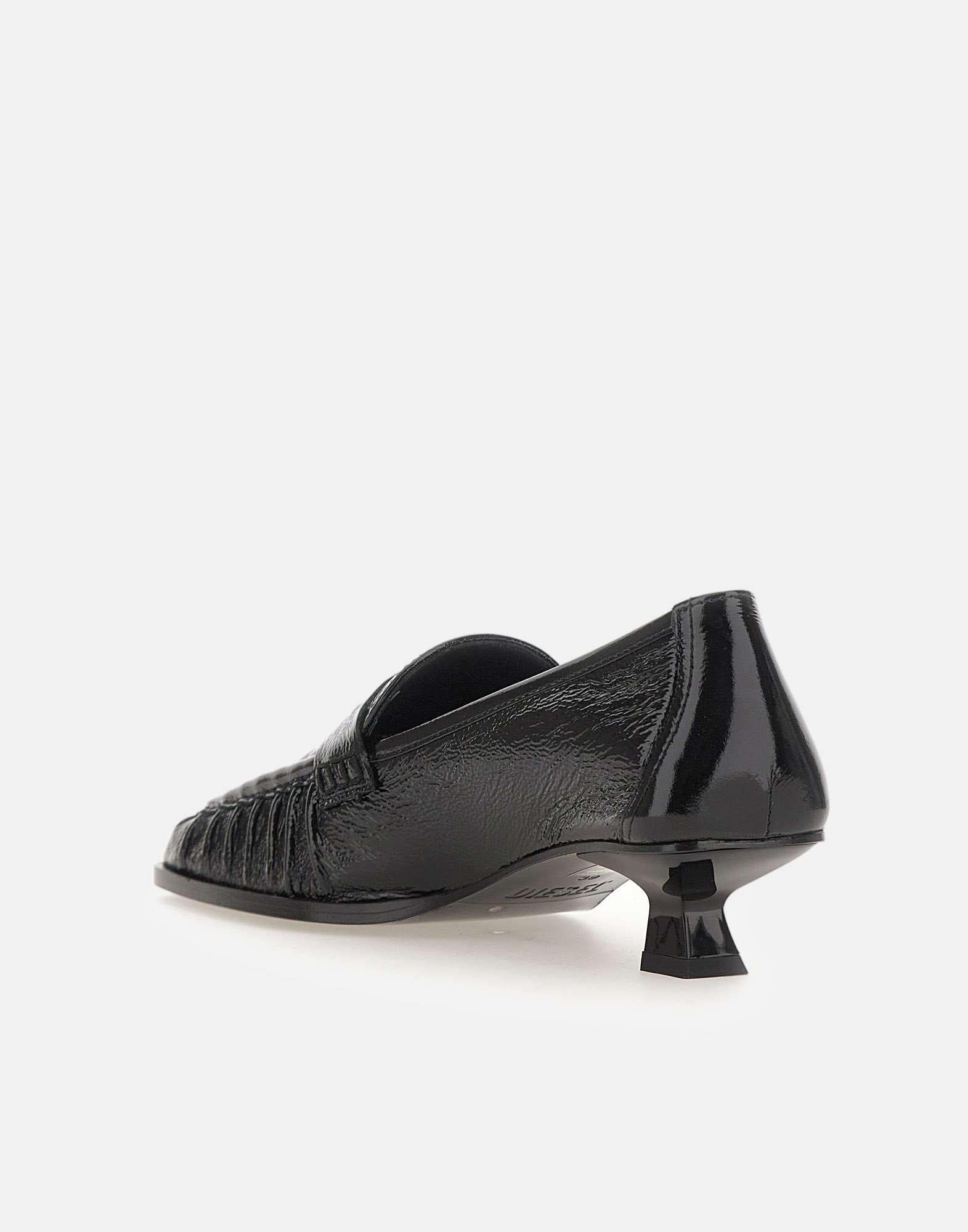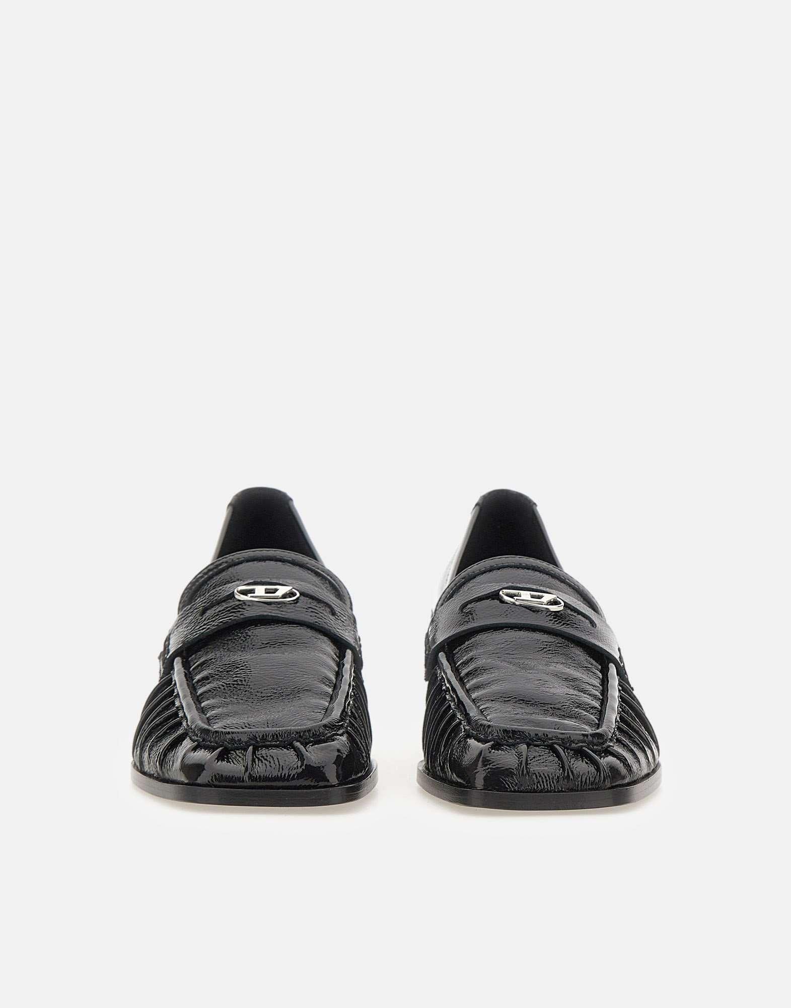 Scarpa donna Diesel "D-Amber Moc 30" in pelle nera lucida e leggermente increspata, dal design ispirato al classico mocassino. Caratterizzata da punta squadrata e tacco scultoreo alto 4 cm con profilo angolato, unisce eleganza e personalità contemporanea. Completata da una piccola placca metallica con logo Oval D applicata sulla sella, è una calzatura dallo stile deciso e sofisticato, perfetta per aggiungere un tocco distintivo ai look urbani.