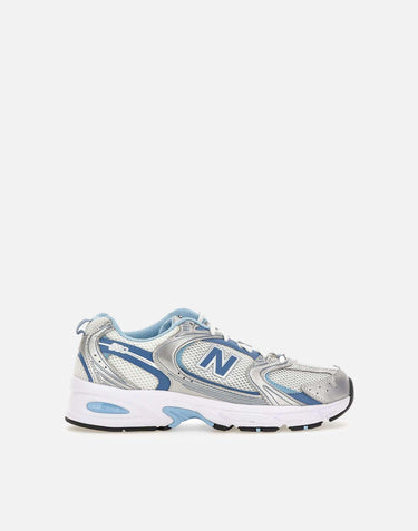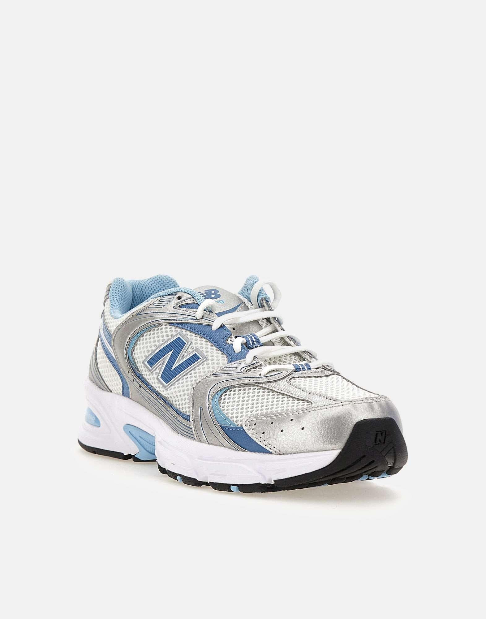 Sneakers New Balance "530" bianche con dettagli sintetici silver e blu, ispirate allestetica running di fine millennio. Tomaia in mesh traspirante con rivestimenti in materiale sintetico, suola in gomma ABZORB alta 4 cm per un comfort e una ammortizzazione ottimali. Il design contemporaneo fonde linee curve e angoli marcati per un look high-tech e distintivo, perfetto per un utilizzo quotidiano.