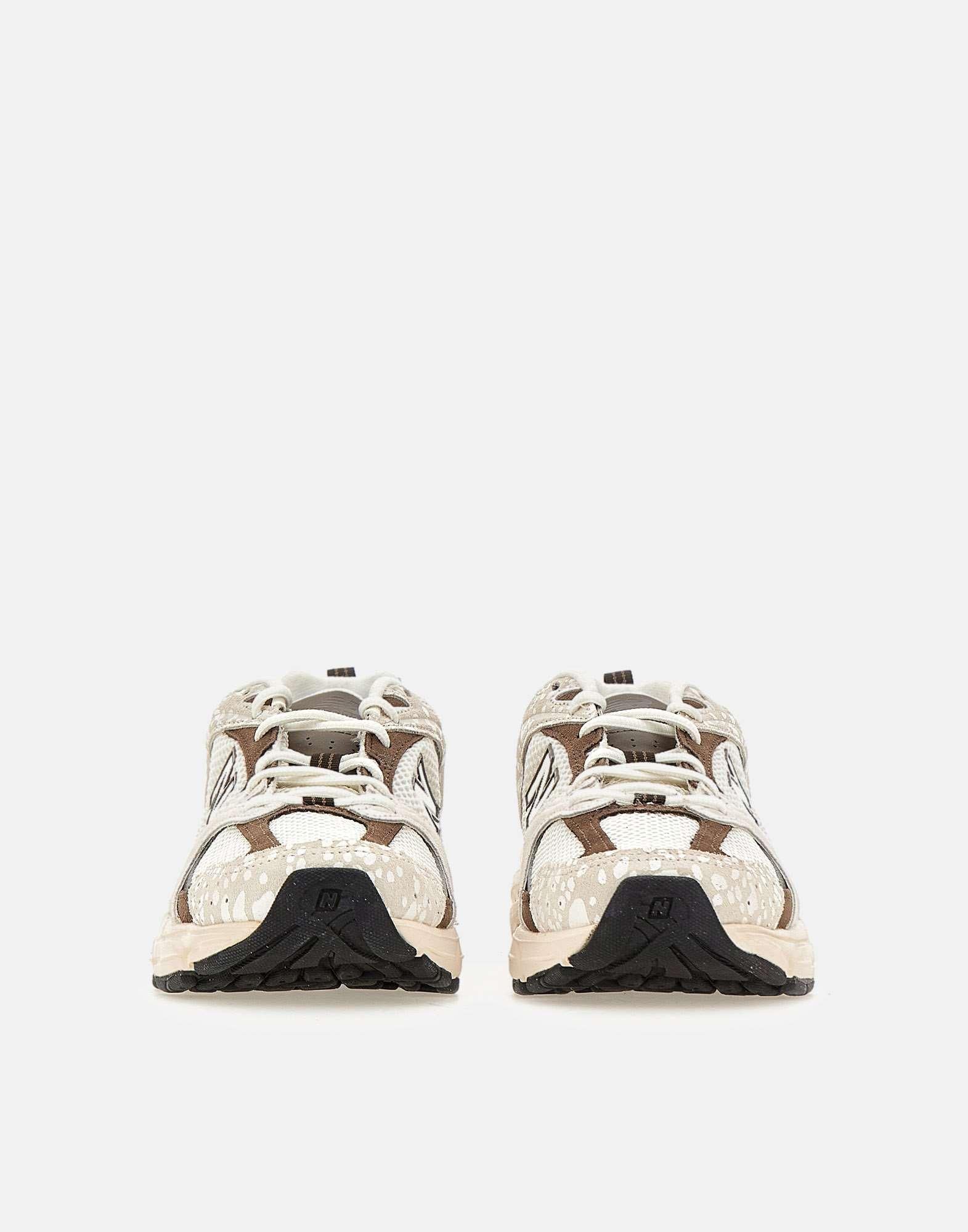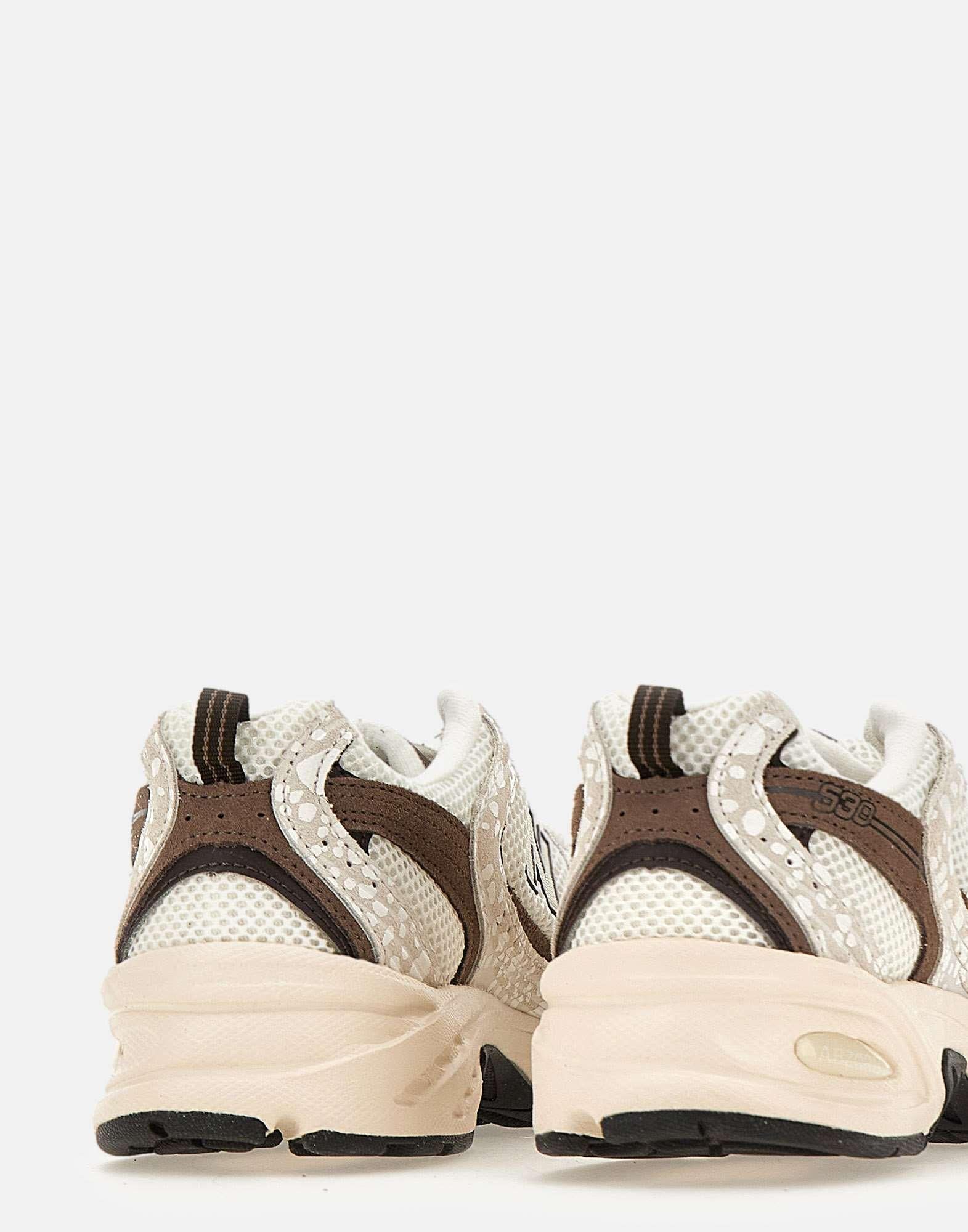Sneakers New Balance "530" con tomaia in mesh bianca arricchita da inserti in pelle scamosciata marrone e beige con micro fantasia maculata. Il design combina linee curve e angoli ampi per un'estetica peculiare dal carattere high-tech. L'intersuola ABZORB assorbe efficacemente gli impatti grazie alla combinazione di ammortizzazione e resistenza alla compressione, garantendo comfort prolungato durante l'uso quotidiano. Iconica N laterale, lacci bianchi, linguetta imbottita logata e tirante posteriore completano il modello. Suola in gomma con altezza di 4 cm. Calzata tendenzialmente piccola, si consiglia mezzo numero in piu. Taglia US 6 e 1/2 corrisponde a EU/IT 39 e 1/2. Conversione tramite tabella CALZATURE UNISEX USA.