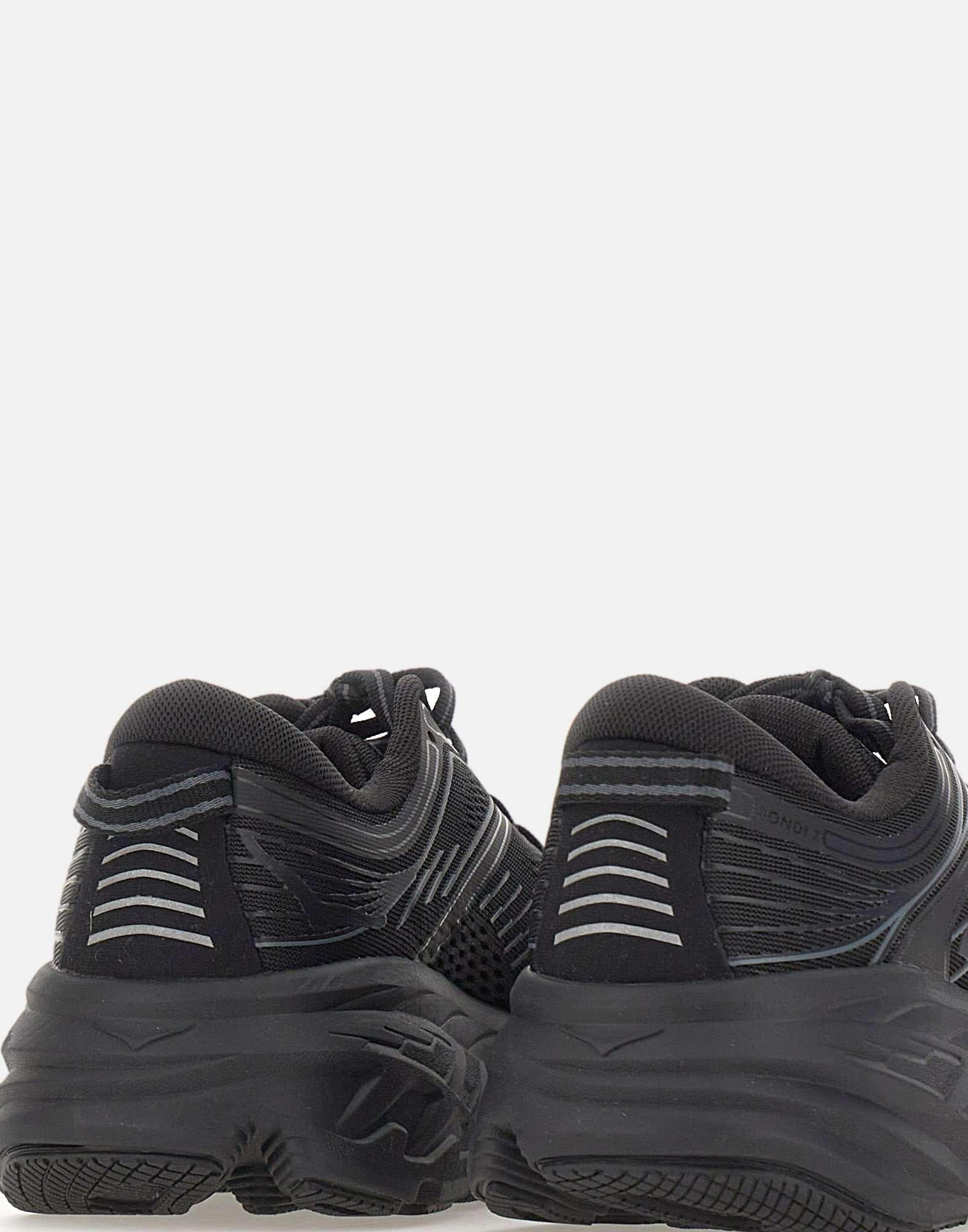 Sneakers donna Hoka "BONDI 7" realizzate in tessuto traspirante color nero, progettate per offrire comfort e massima ammortizzazione. Il modello presenta collarino sagomato e una suola in gomma alta 5,5 cm, pensata per una camminata piu stabile e morbida. La chiusura è con lacci in cotone neri e grigi, mentre i dettagli in materiale sintetico, come il logo sul lato esterno, completano il design con un accento tecnico e contemporaneo. Talloncino con tirante per una calzata pratica e soletta sagomata in EVA, ideale per un supporto confortevole durante tutta la giornata.