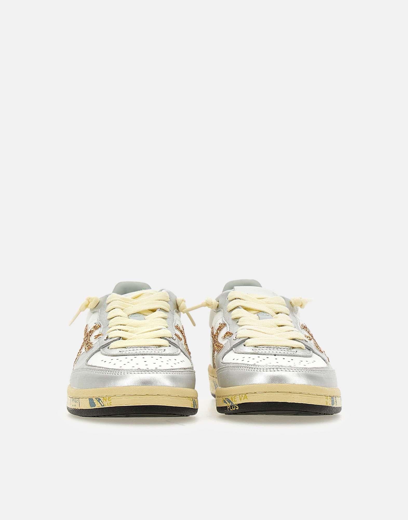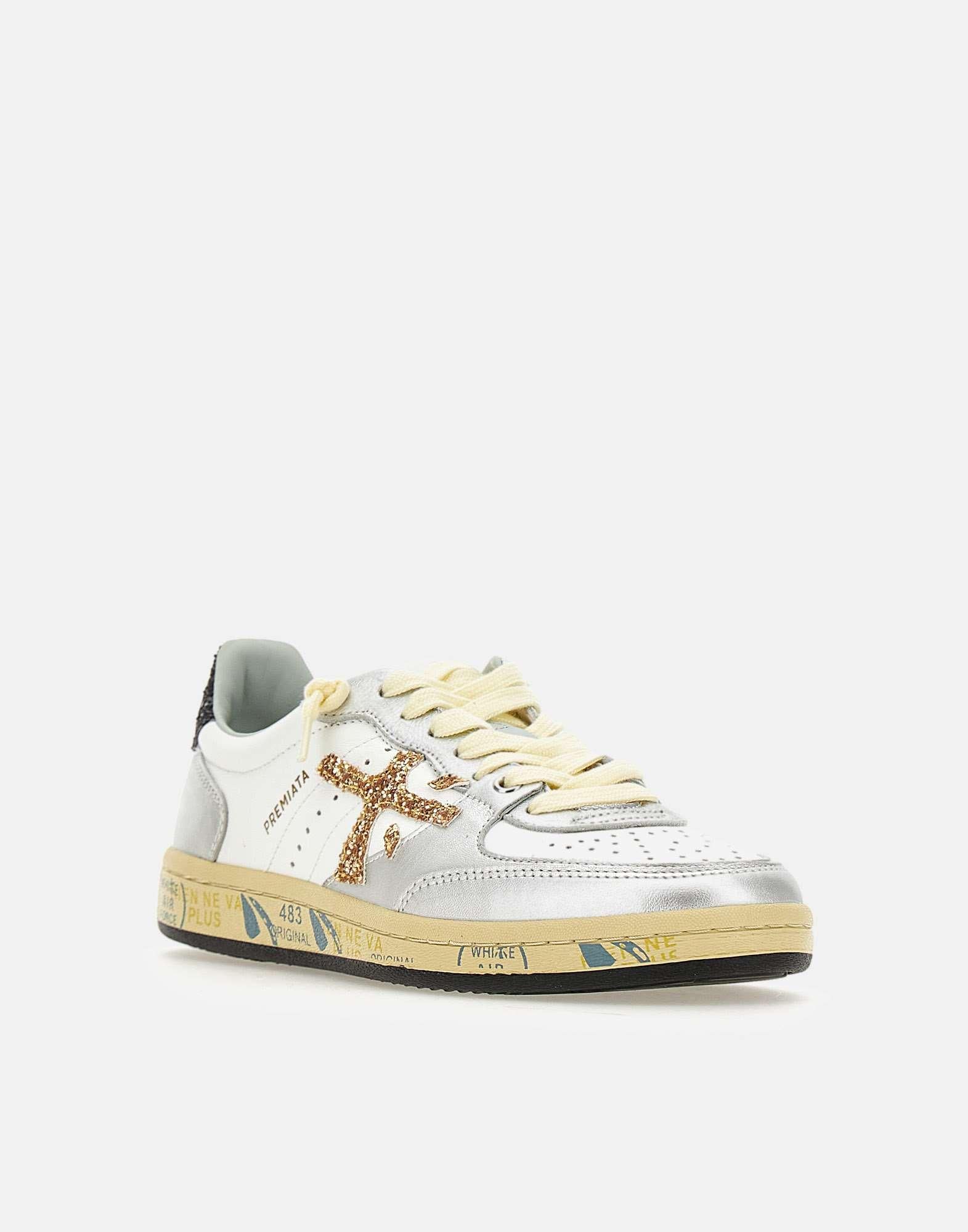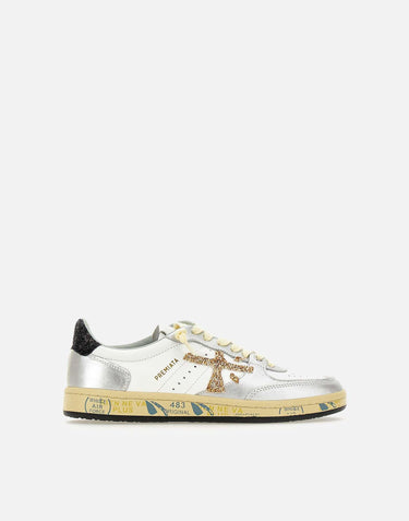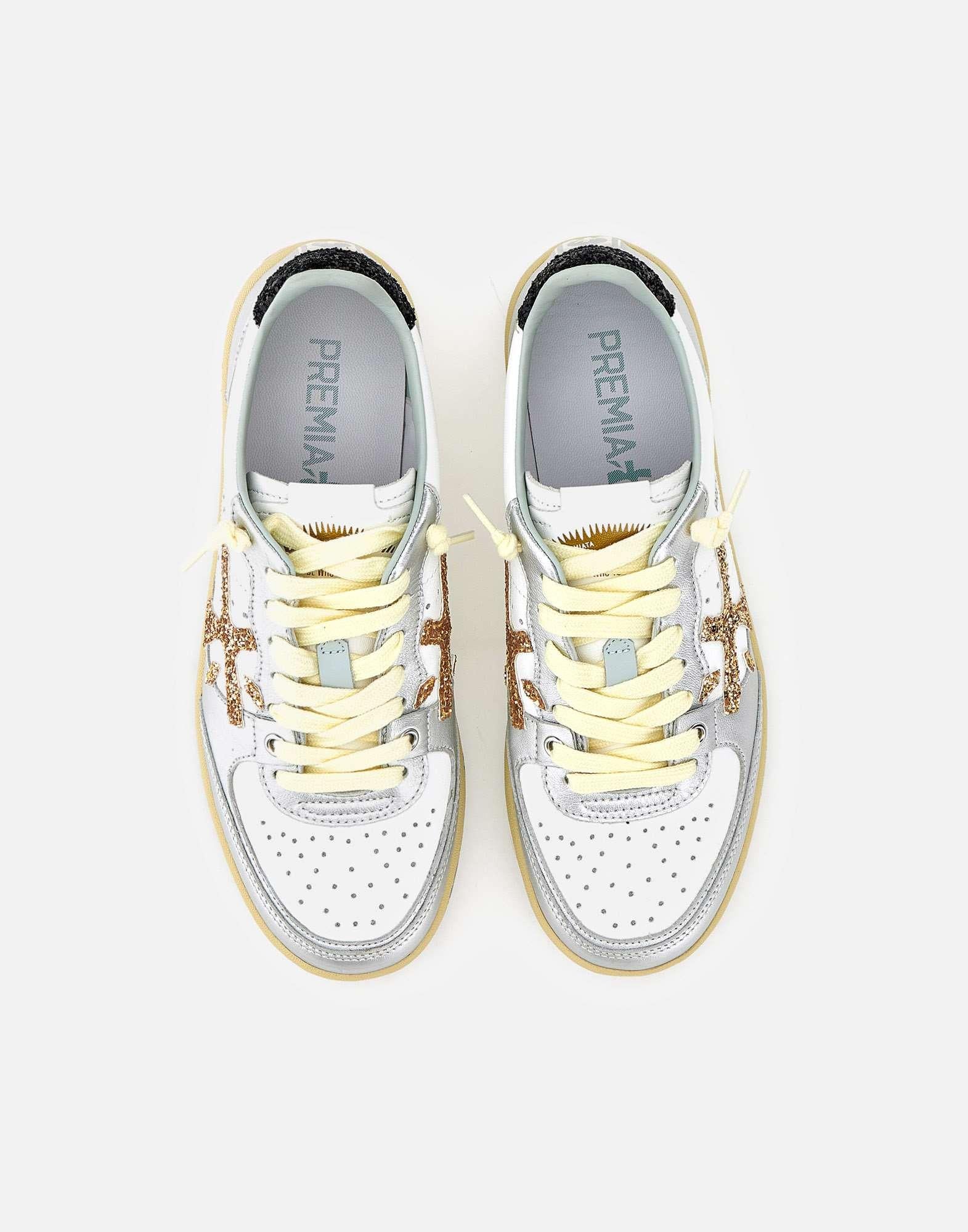 Sneakers donna Premiata "BSKTCLAD 8170" in pelle liscia color bianco con inserti argento e talloncino con glitter nero, per un look casual dal dettaglio luminoso. Sul lato spicca l'iconico logo Premiata in glitter dorato, abbinato a linguetta logata e lacci piatti in cotone color panna, con paio aggiuntivo bianco incluso. La fodera in morbida pelle assicura comfort, mentre i fori di traspirazione sulla punta migliorano la ventilazione. La suola in gomma con profilo a cassetta e serigrafia Premiata è alta 2,5 cm e completa la silhouette con un tocco distintivo. Calzata regolare.