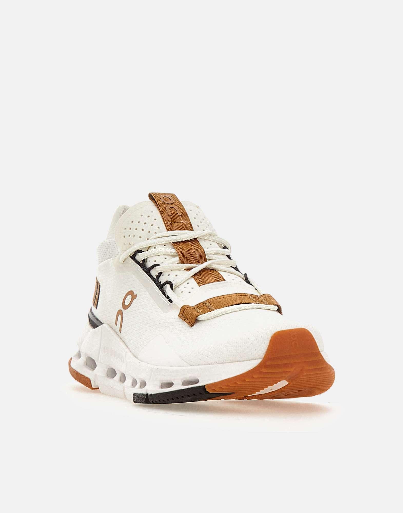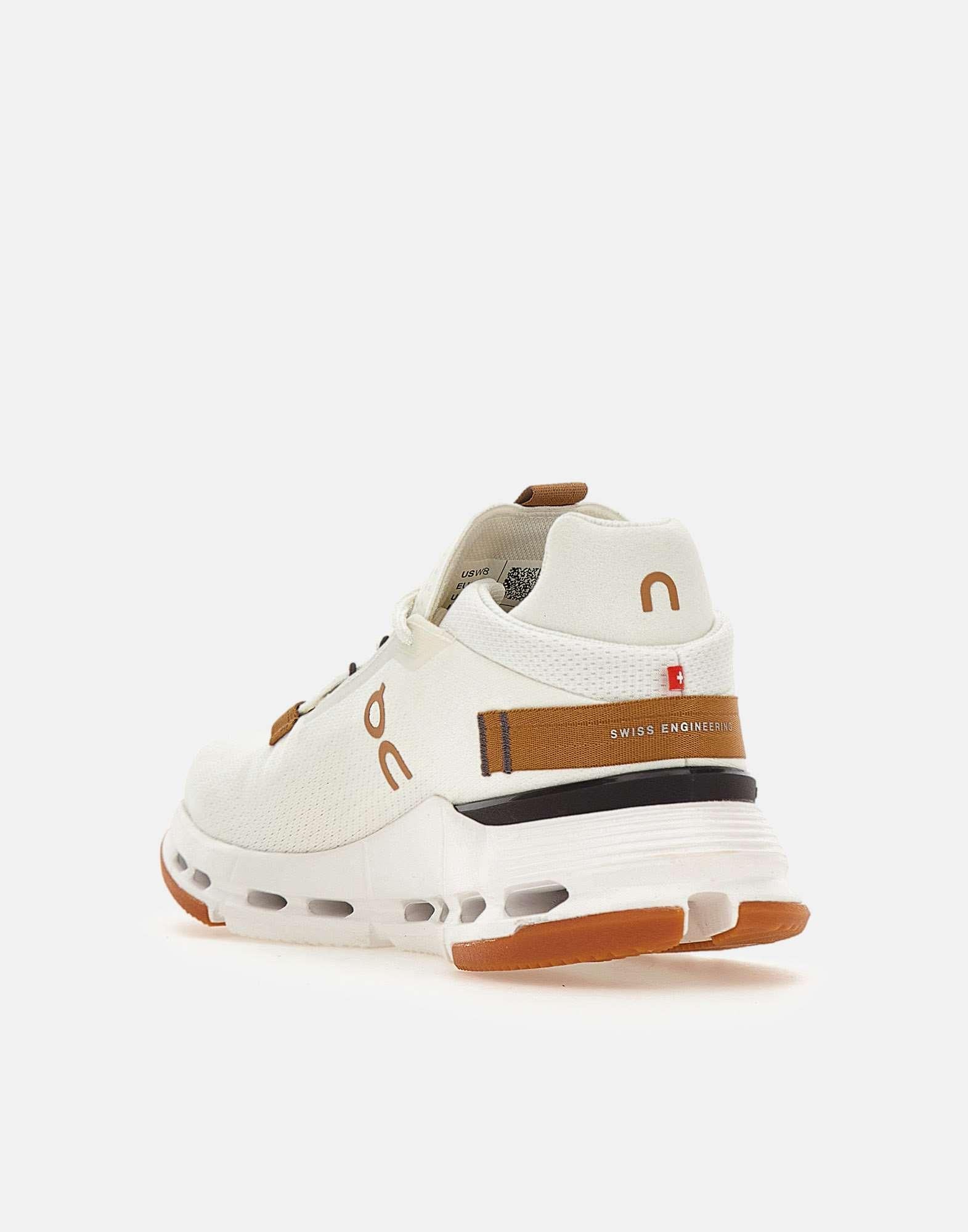 Sneakers donna On "Cloudnova 2" con tomaia in mesh color bianco con inserti color cuoio, pensate per unire tecnologia da running e stile quotidiano in un design originale e audace. Il modello presenta lacci tubolari bianchi, linguetta traforata con tirante a contrasto e logo a contrasto su entrambi i lati, dettagli che definiscono un'estetica pulita e contemporanea. La suola in gomma alta 4 cm integra la Speedboard collegata al tallone per maggiore stabilità, mentre il cuscinetto nel tallone migliora supporto, velocità e rende la calzata più confortevole. Ammortizzazione e stile ogni giorno, con tutta la tecnologia delle scarpe da running in una sneaker per l'uso quotidiano. Calzata regolare.