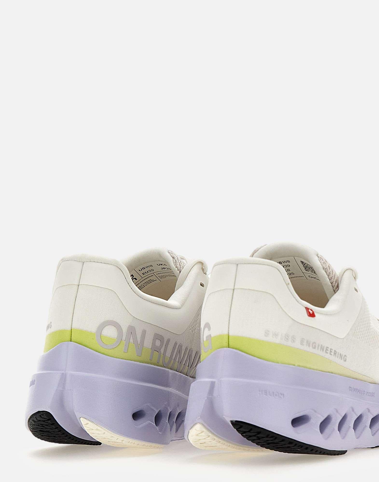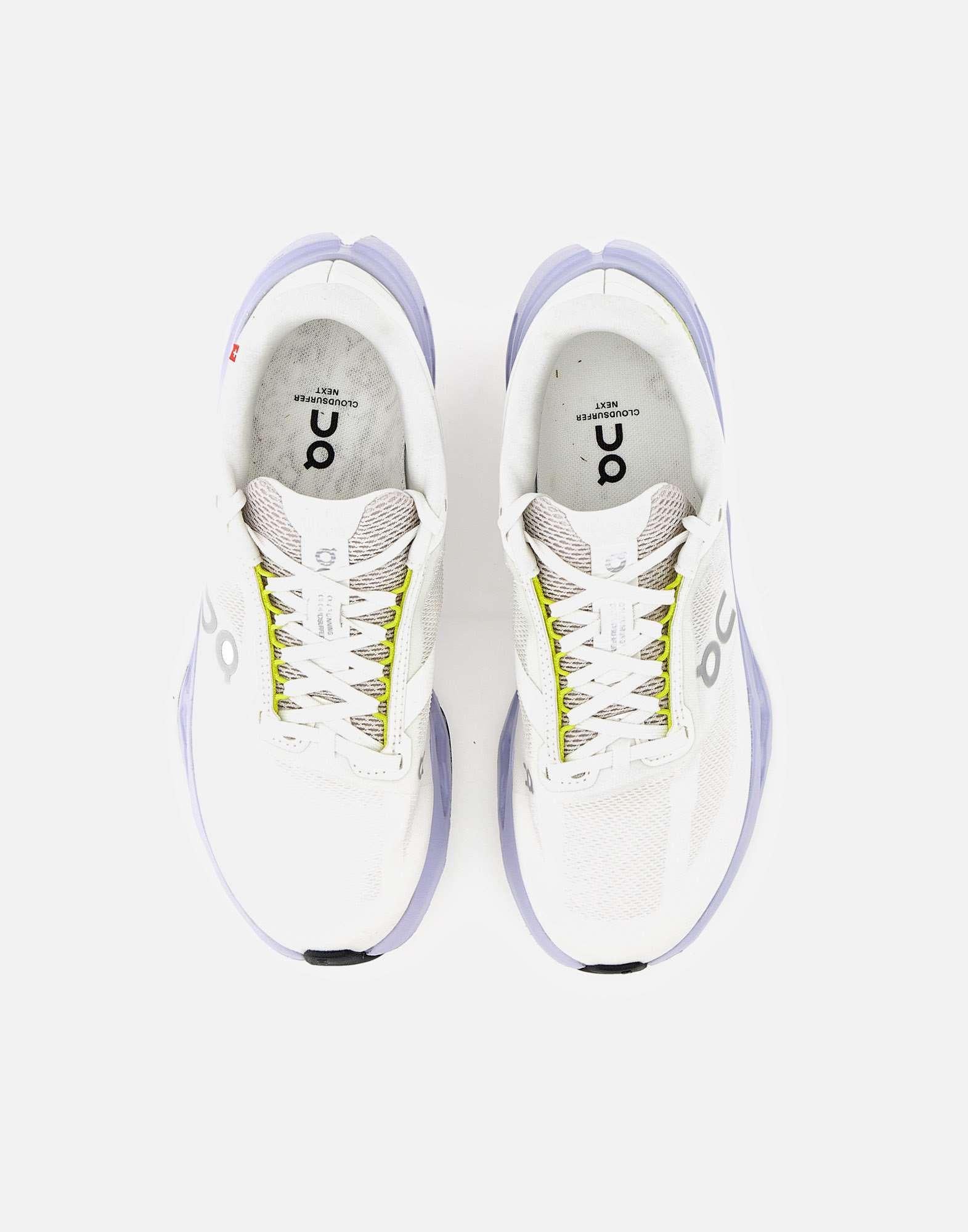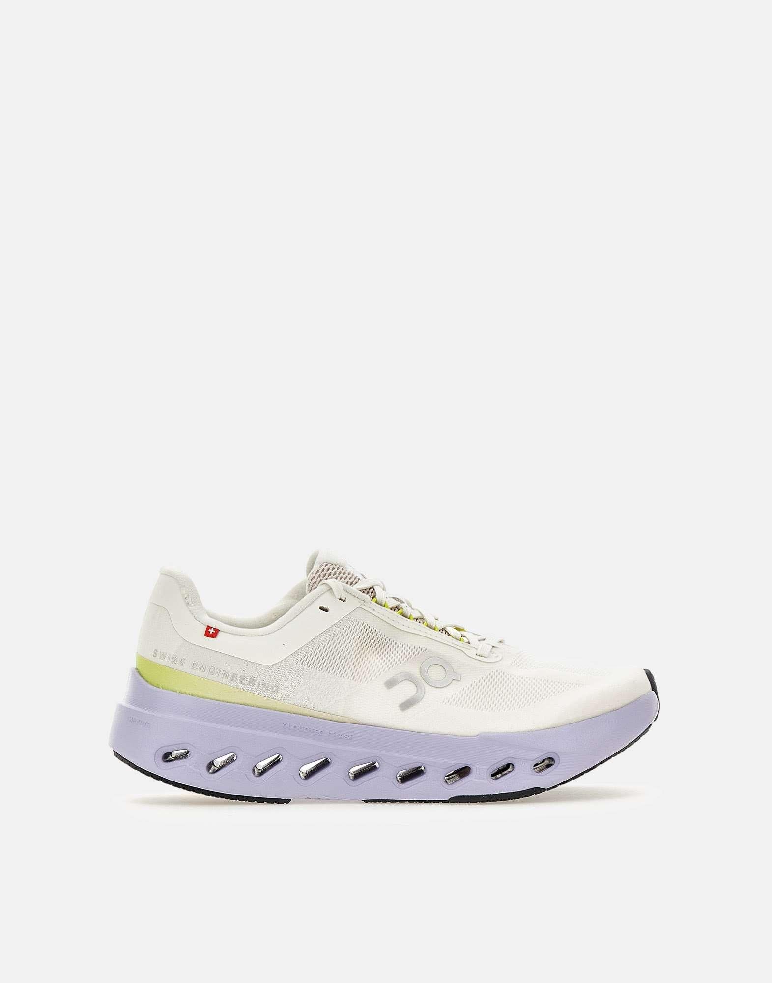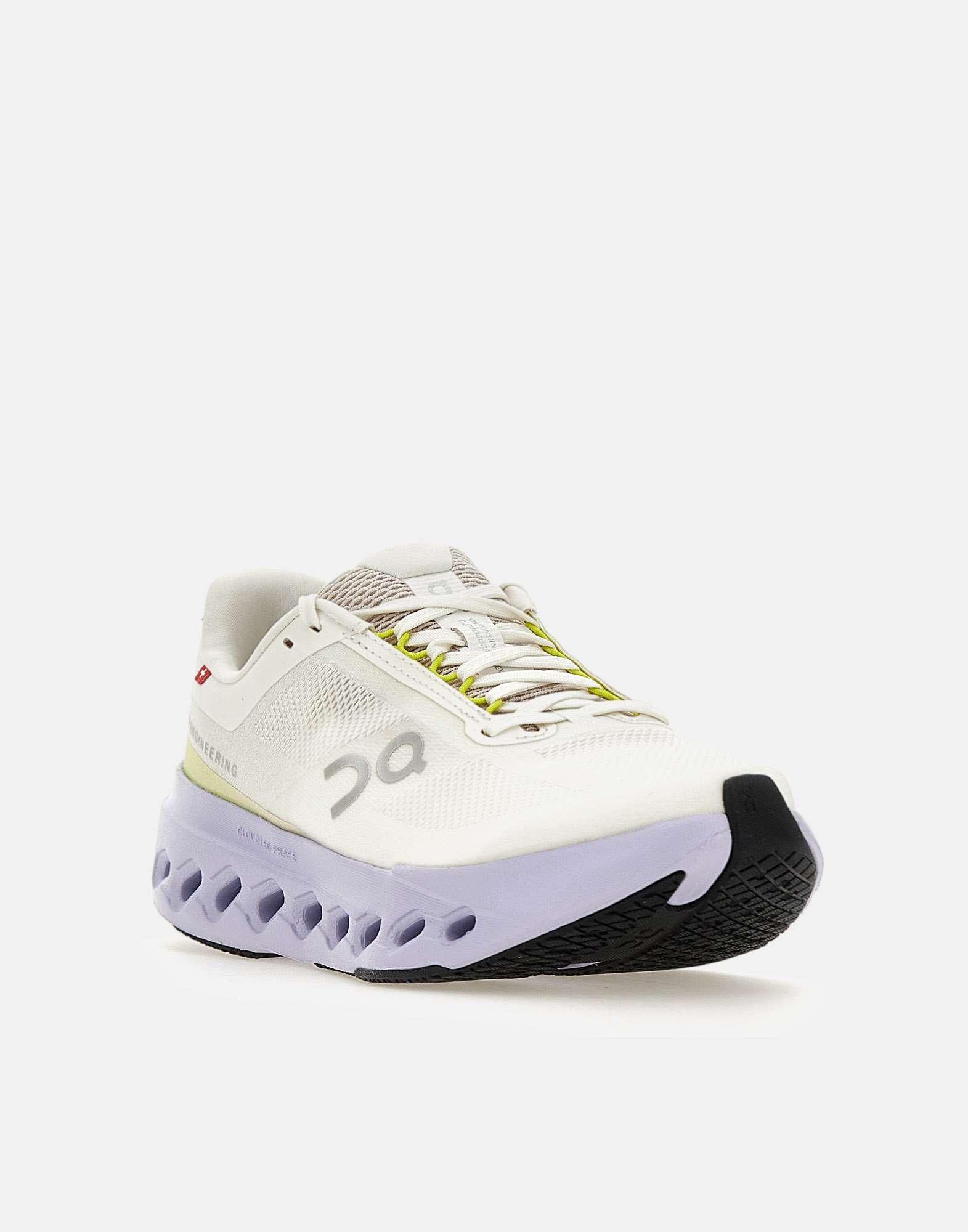 Sneakers donna On "Cloudsurfer Next" con tomaia ultraleggera in mesh color avorio, super traspirante e progettata per avvolgere il piede e regalare comodità. La suola integra elementi antiscivolo per garantire aderenza, mentre il sistema di ammortizzazione CloudTec Phase offre una corsa fluida. La schiuma Helion aggiunge reattività ed energia a ogni falcata. La sagoma è ispirata alle migliori scarpe da gara, con suola alta 5 cm color lilla a contrasto. Calzata comoda che si adatta a diverse forme del piede. Peso 225 g. Calzata regolare.