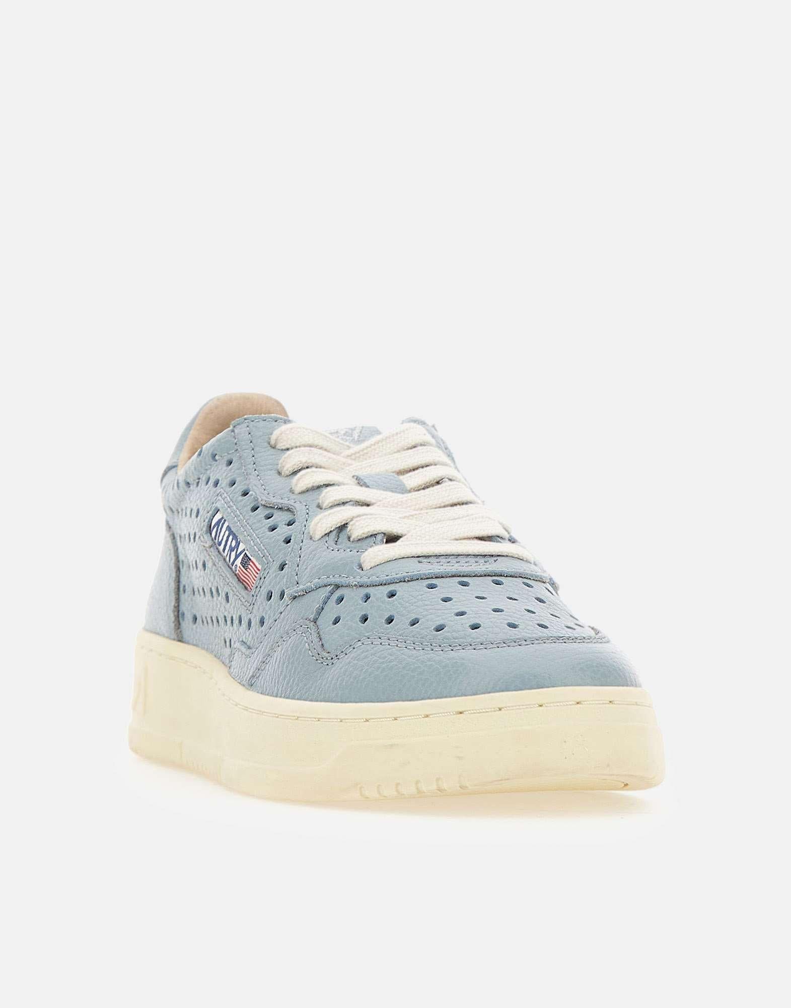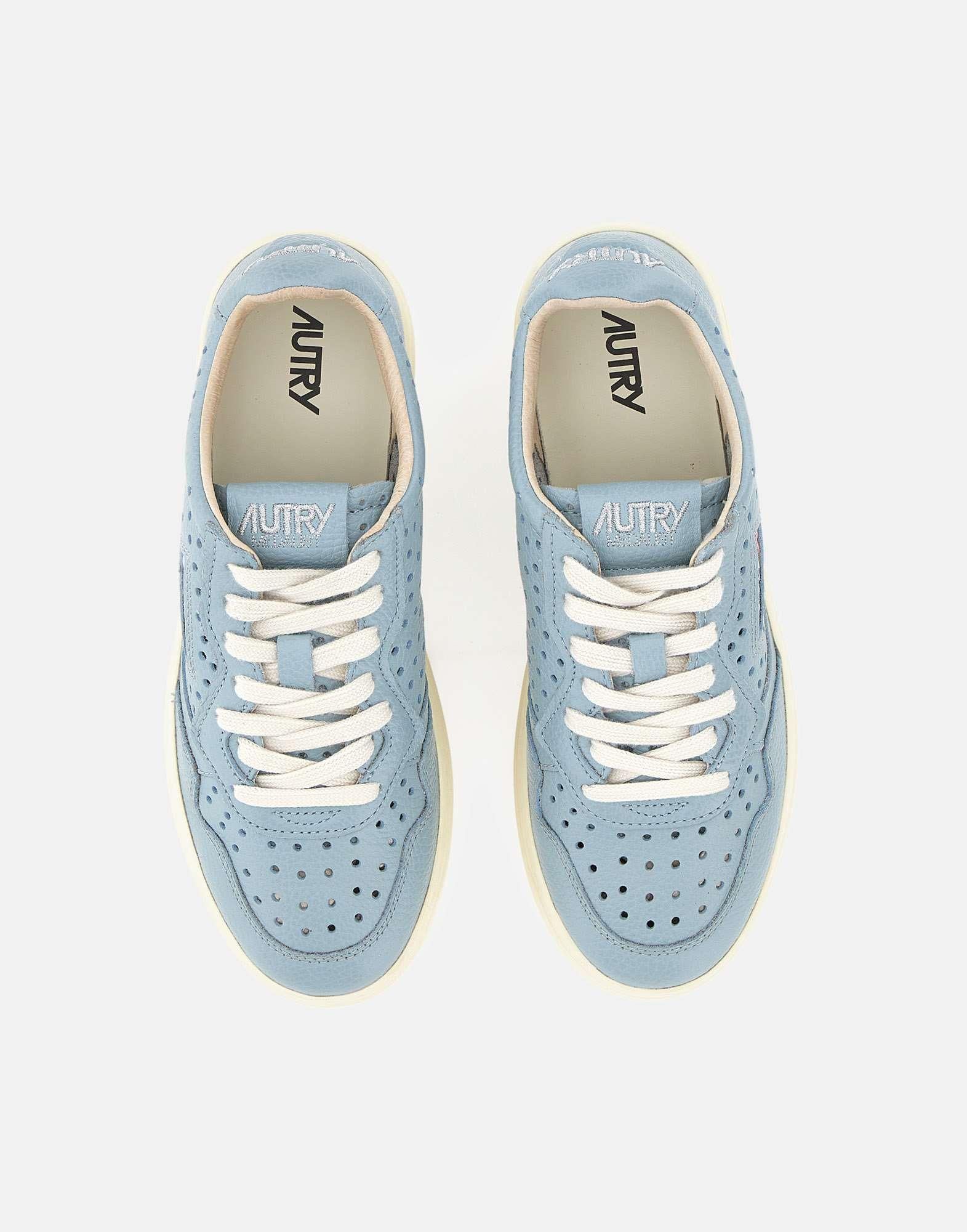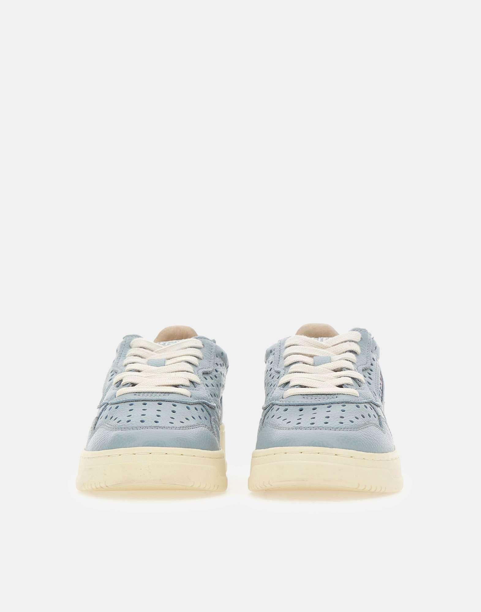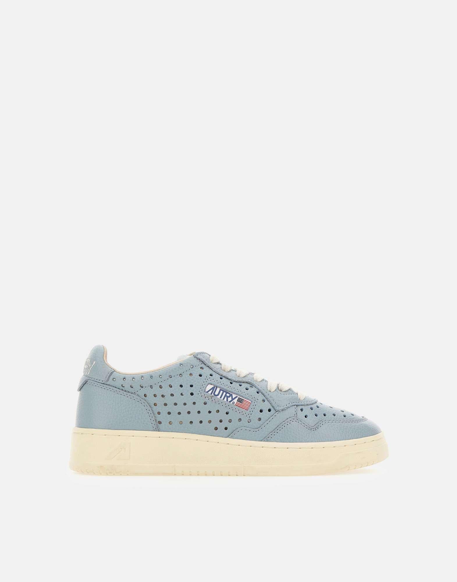 Sneakers donna Autry "Medalist Low" con tomaia in pelle celeste, caratterizzata da texture traforata su punta e lati per un'estetica pulita e una migliore traspirabilità. Il logo ricamato in argento su talloncino e linguetta aggiunge un dettaglio luminoso e raffinato, mentre il patch logo jacquard sul lato esterno definisce l'identità del modello. Rifinite con lacci piatti in cotone e suola in gomma alta 3,5 cm, uniscono comfort e stile quotidiano. Dust bag inclusa.