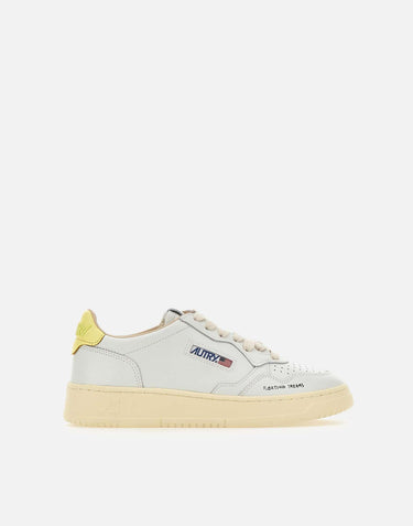 Sneakers donna Autry "Medalist Low" in pelle bianca con talloncino in pelle color giallo, su cui è ricamato in rilievo il logo. Punta traforata per una migliore traspirabilità, lacci piatti in cotone e dettagli logo ricamati sulla linguetta e sul patch jacquard laterale. Suola in gomma color panna alta 3,5 cm. Punta decorata dal testo "Floating dreams" stampato sul lato. Reinterpretazione contemporanea dell'iconica sneaker da tennis anni '80, combina linee pulite e dettagli femminili per un look intramontabile. Inclusa dust bag.