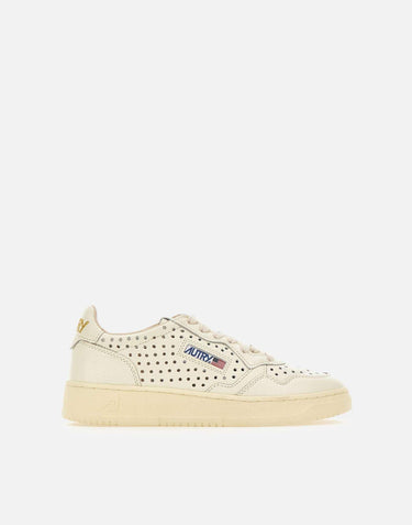 Sneakers donna Autry "Medalist Low" con tomaia in pelle bianca, caratterizzata da texture traforata su punta e lati per un'estetica pulita e una migliore traspirabilità. Il logo ricamato in oro su talloncino e linguetta aggiunge un dettaglio luminoso e raffinato, mentre il patch logo jacquard sul lato esterno definisce l'identità del modello. Rifinite con lacci piatti in cotone e suola in gomma alta 3,5 cm, uniscono comfort e stile quotidiano. Dust bag inclusa.
