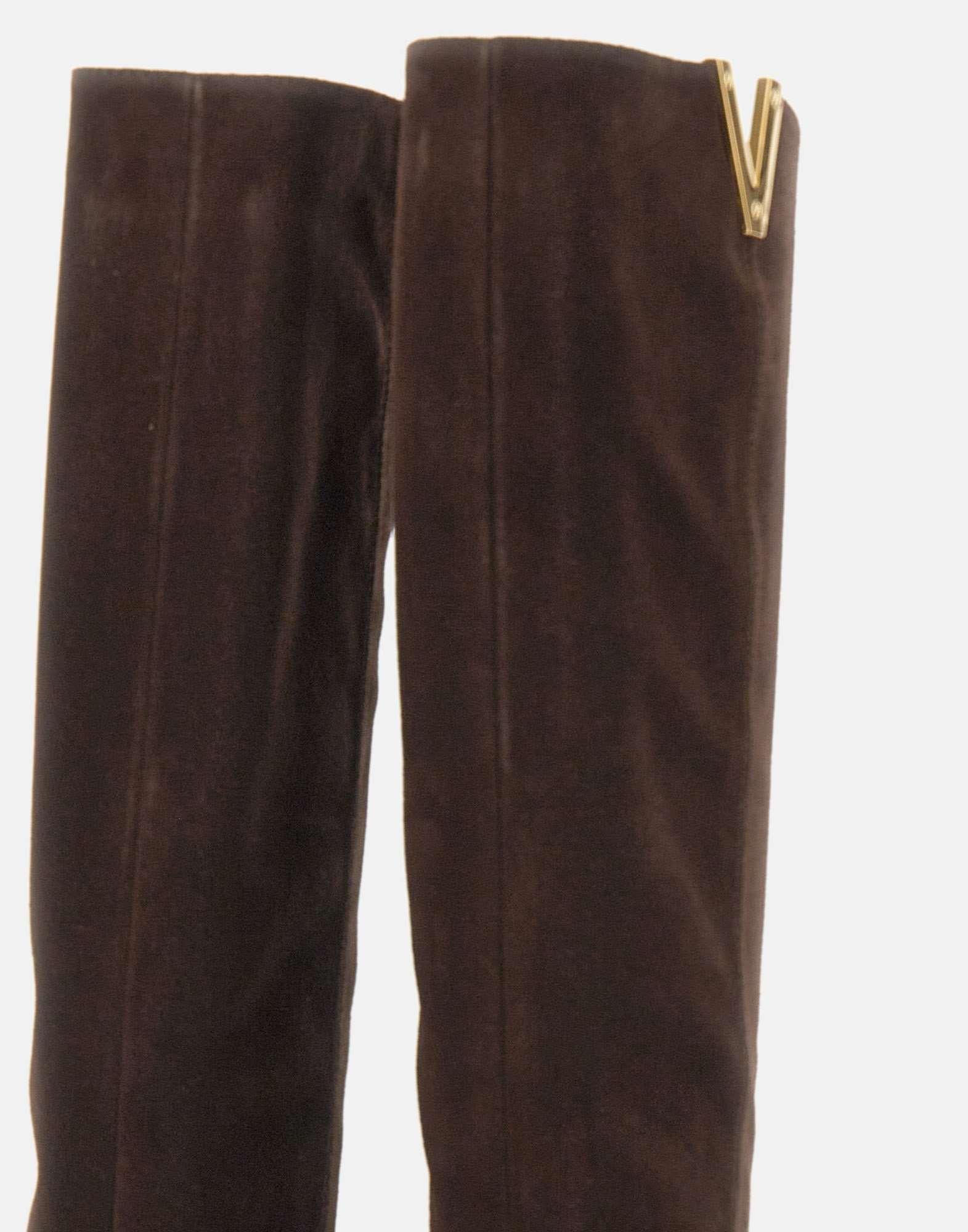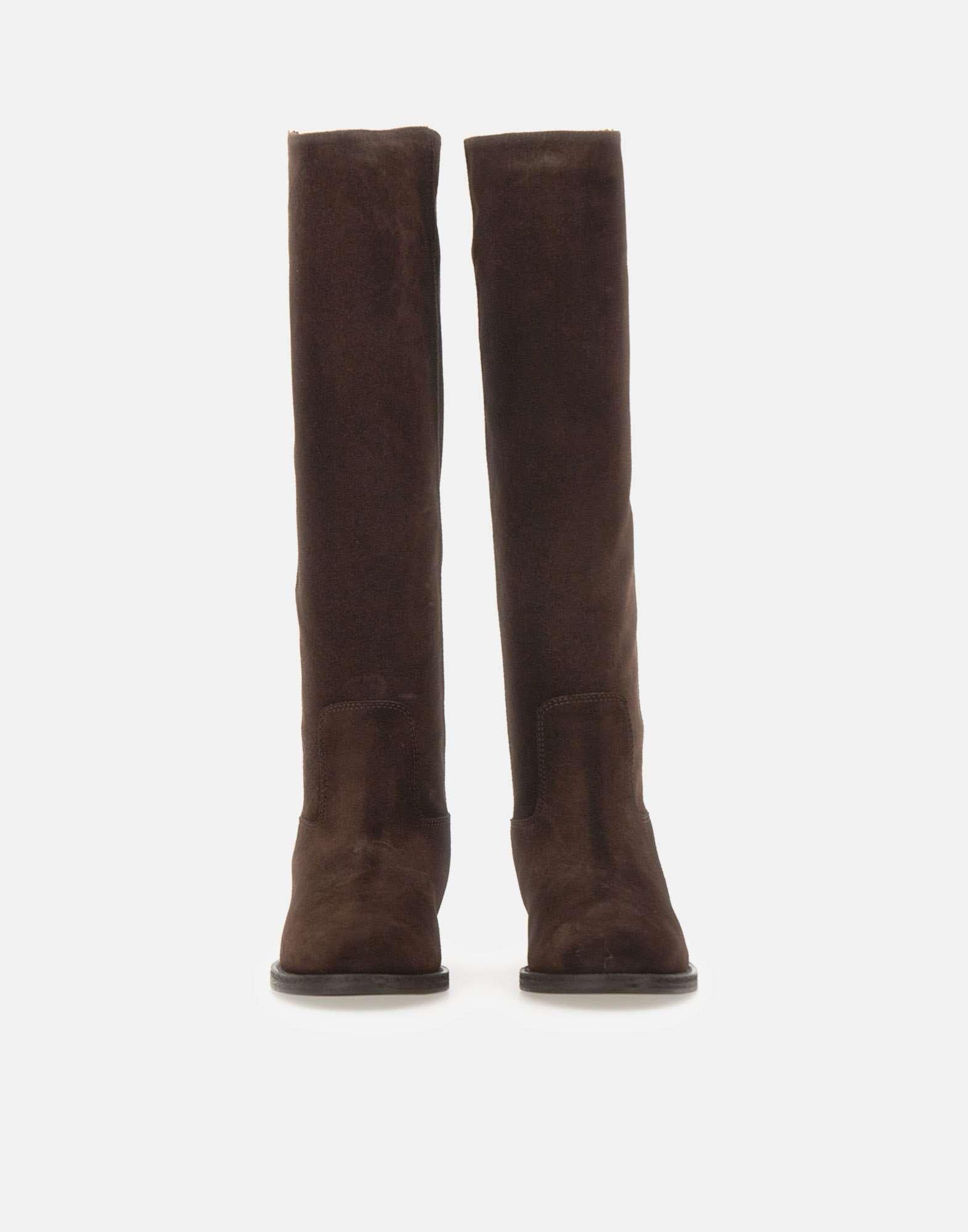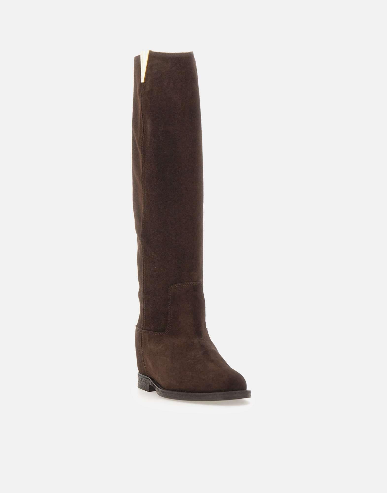 Stivali Via Roma 15 "Velour" realizzati in pelle scamosciata nel colore testa di moro, con elegante dettaglio a V in metallo dorato sul bordo. Il design a gambale alto tubolare presenta punta a mandorla e zeppa interna da 8cm, per un effetto slanciato e confortevole. Rifiniti con tacco e suola a strati, esprimono il perfetto equilibrio tra artigianalità e stile contemporaneo. Made in Italy. Calzata regolare.