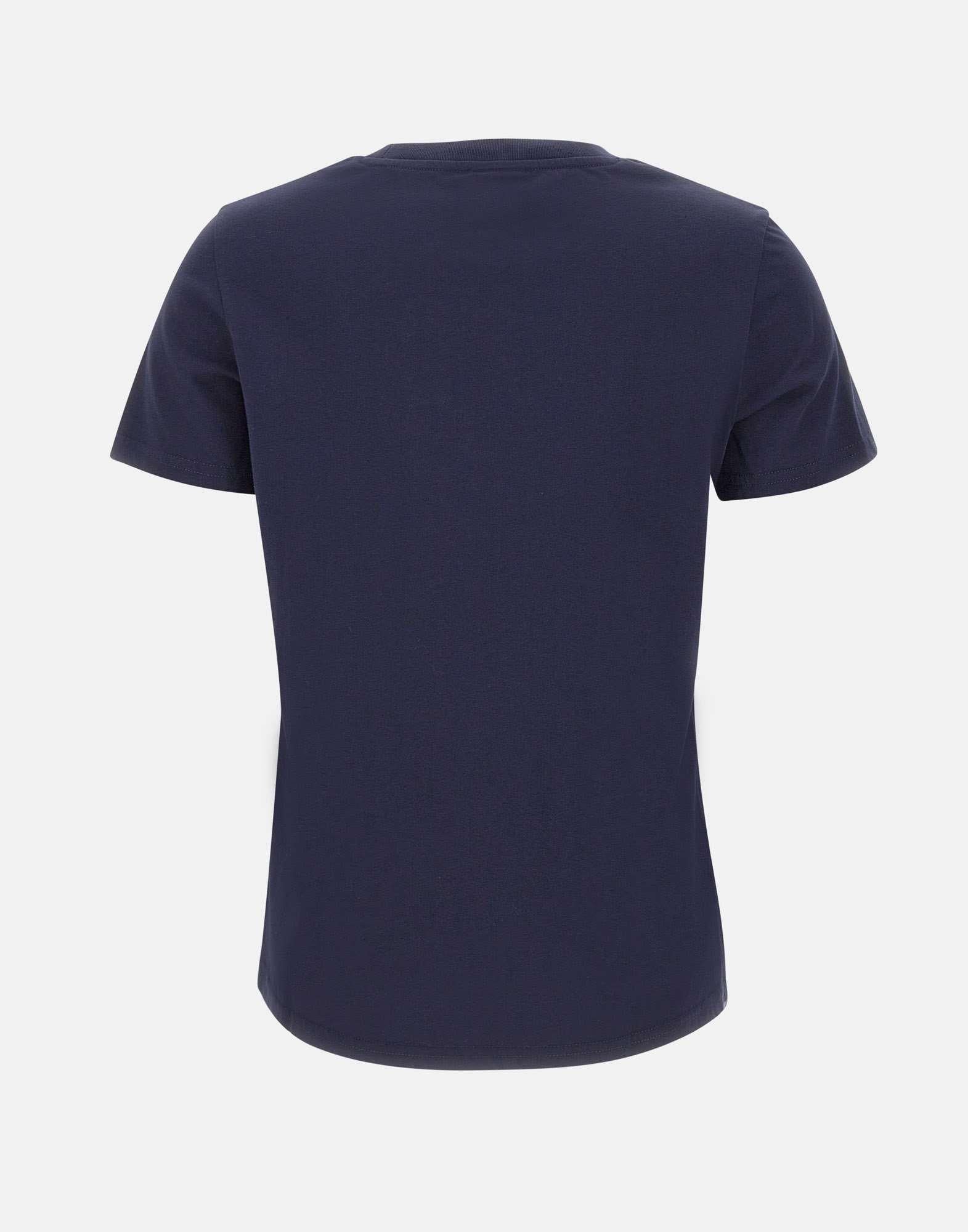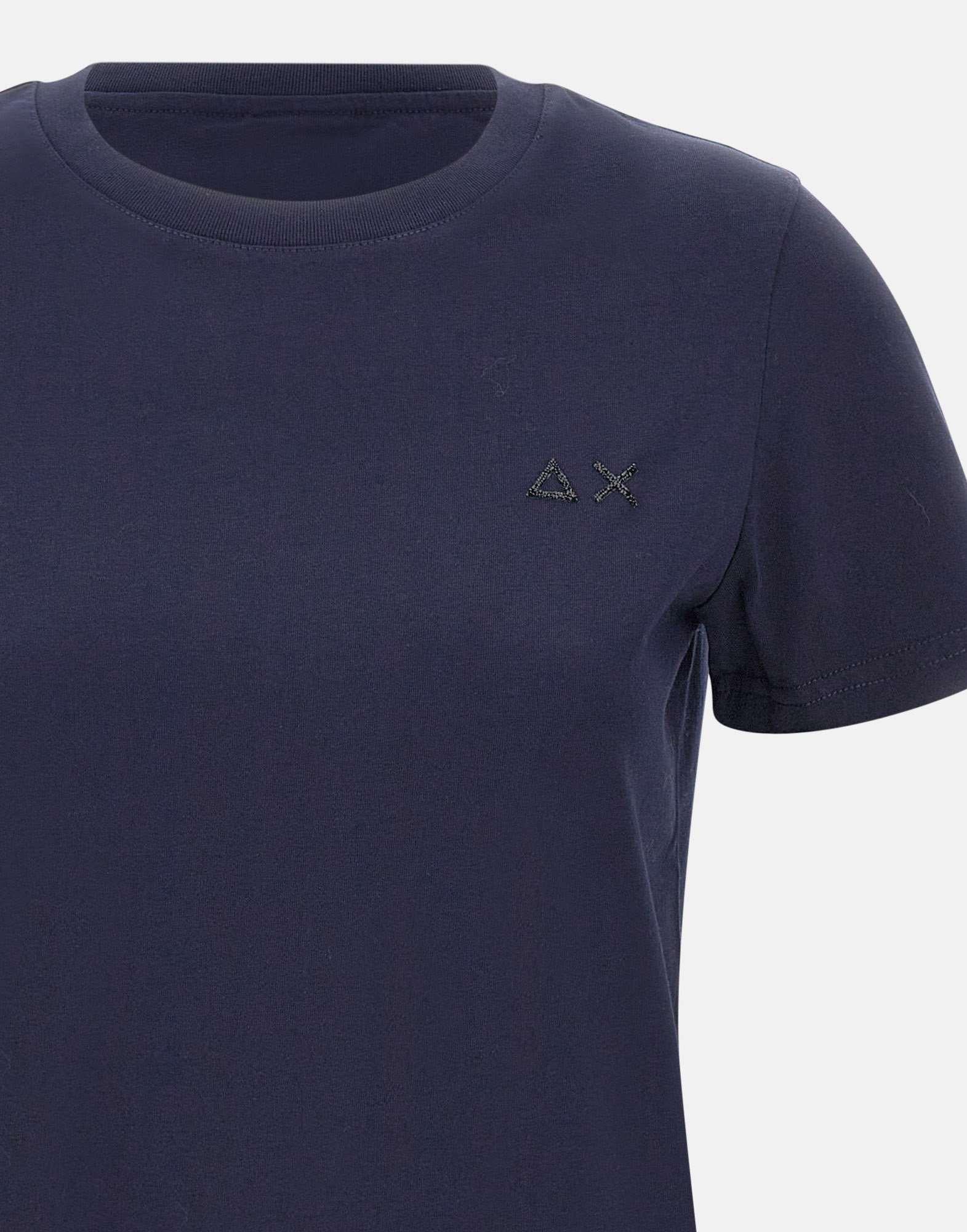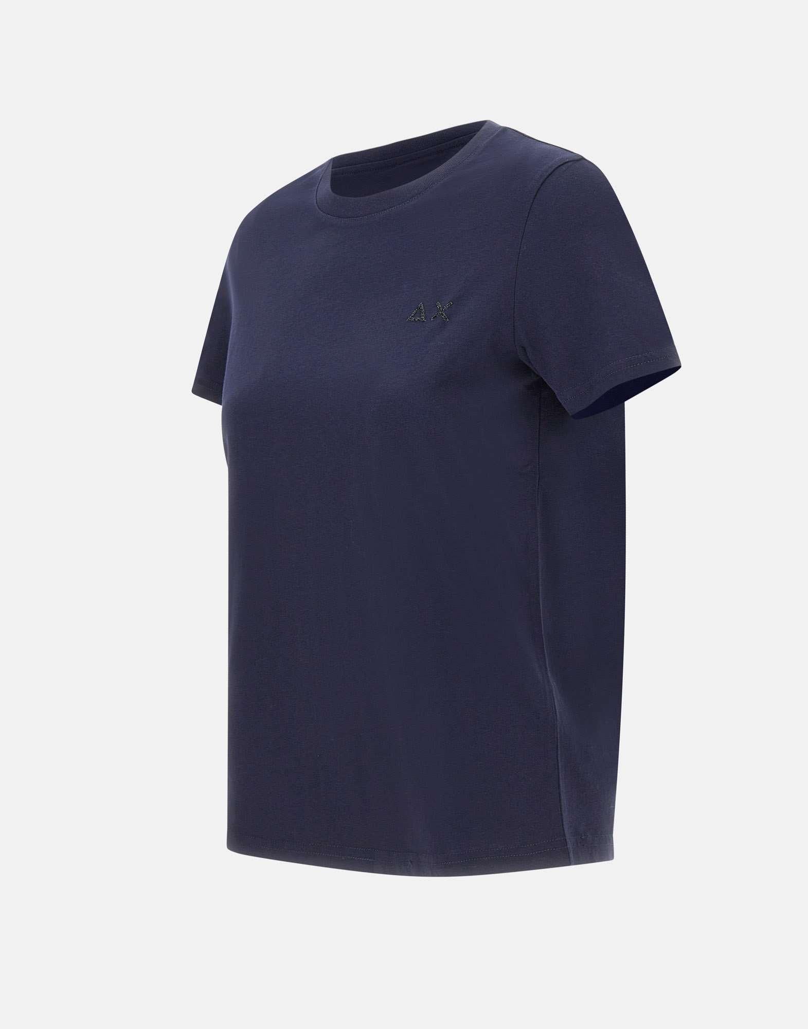 T-shirt donna Sun68 "Basic S/S" in jersey di cotone color blu navy, dal design semplice e raffinato. Presenta maniche corte, girocollo e logo con paillettes sul petto che aggiunge un tocco luminoso e femminile. La vestibilità regular fit garantisce comfort e versatilità, perfetta per look casual con un accento brillante.