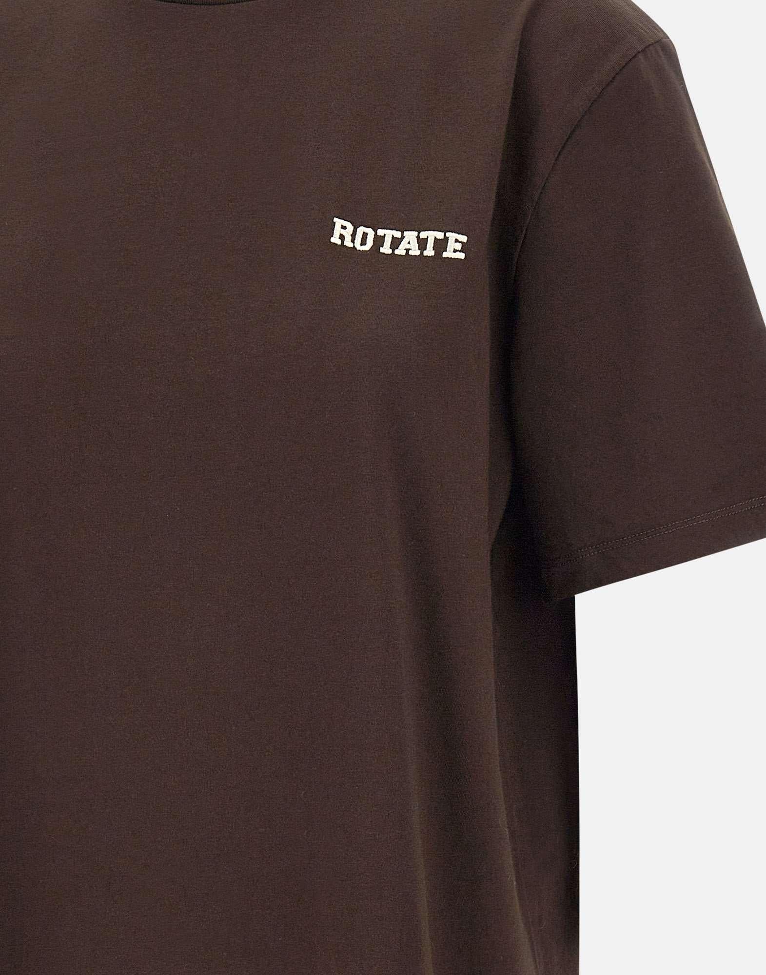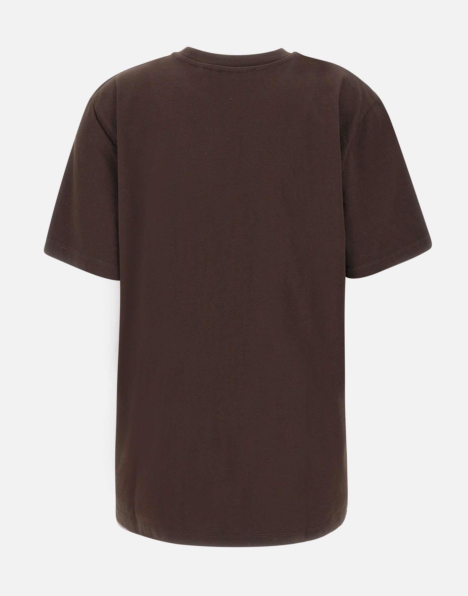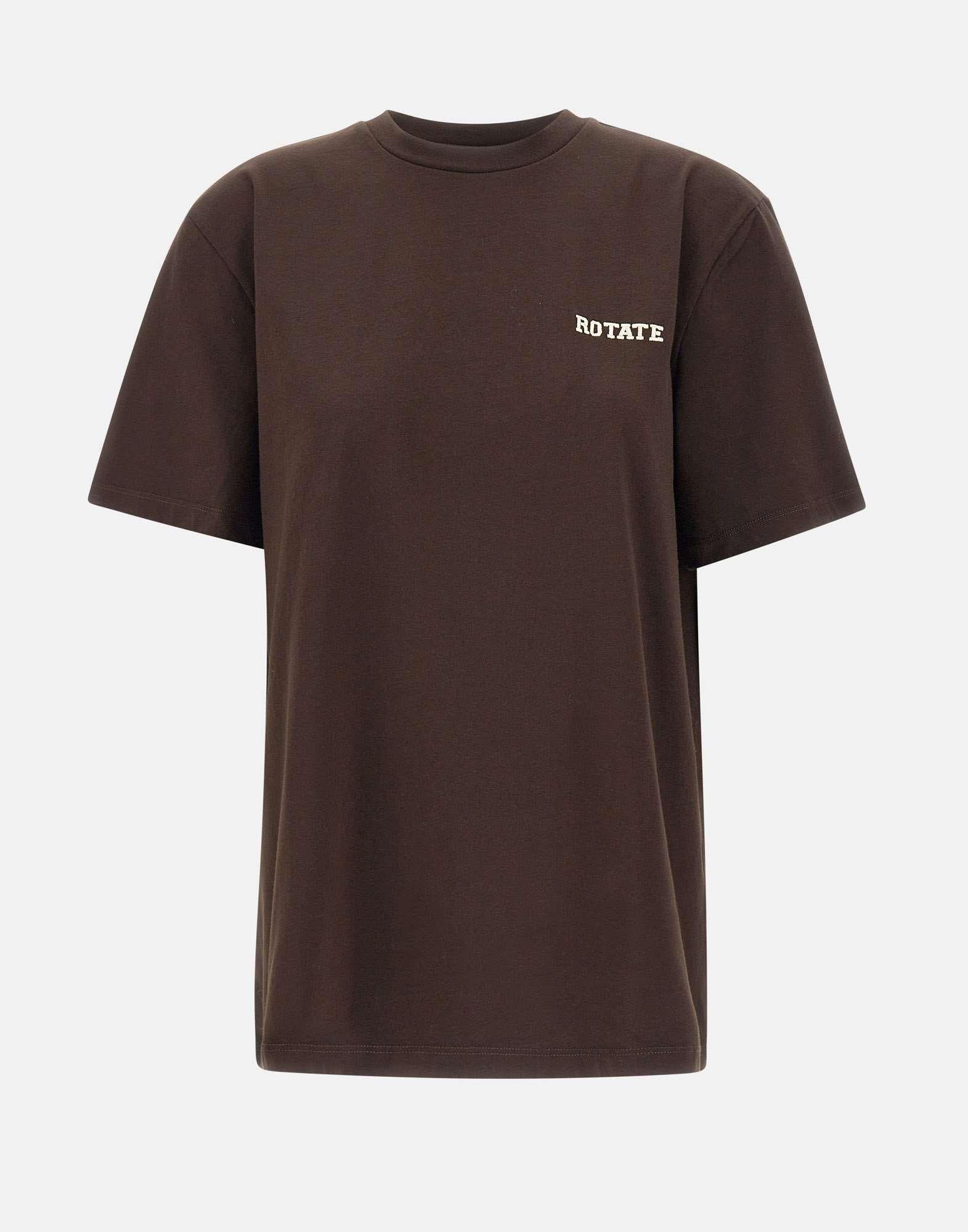 T-shirt "Jersey Oversized" Rotate Birger Christensen in colore cioccolato, Holiday collection, interpreta lo stile casual con un tocco di eleganza contemporanea. Realizzata in morbido jersey di cotone, presenta maniche corte, girocollo classico e il logo ricamato a contrasto sul petto, dettaglio iconico del brand. La vestibilità oversize dona un look moderno e rilassato, perfetto per il tempo libero. Oversize fit.