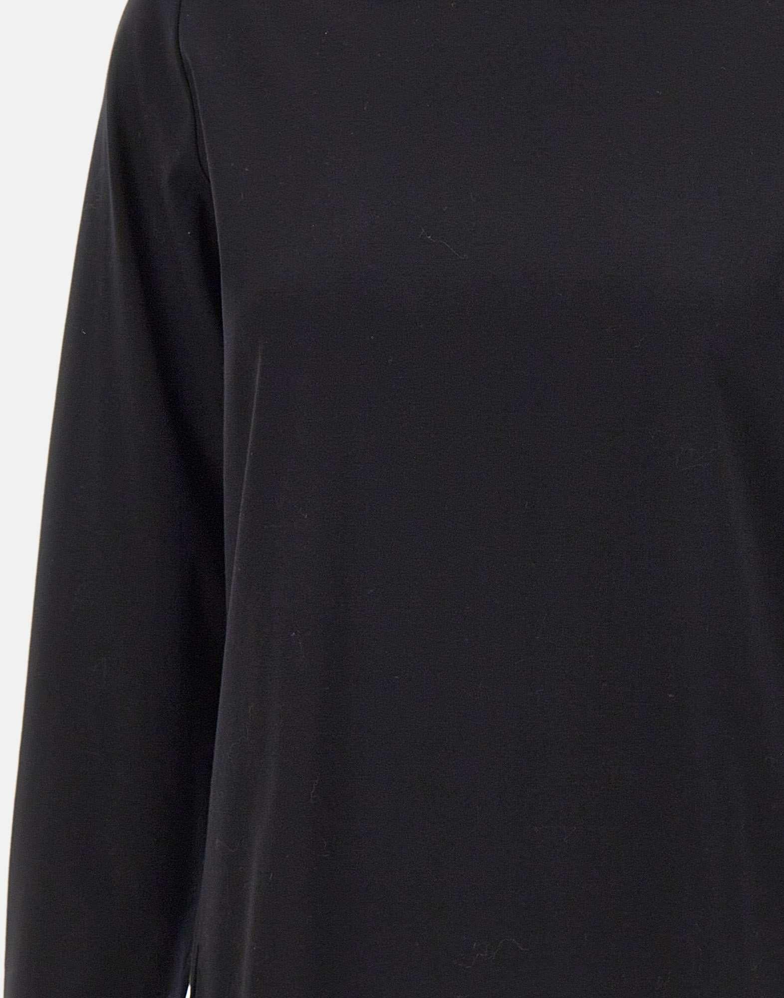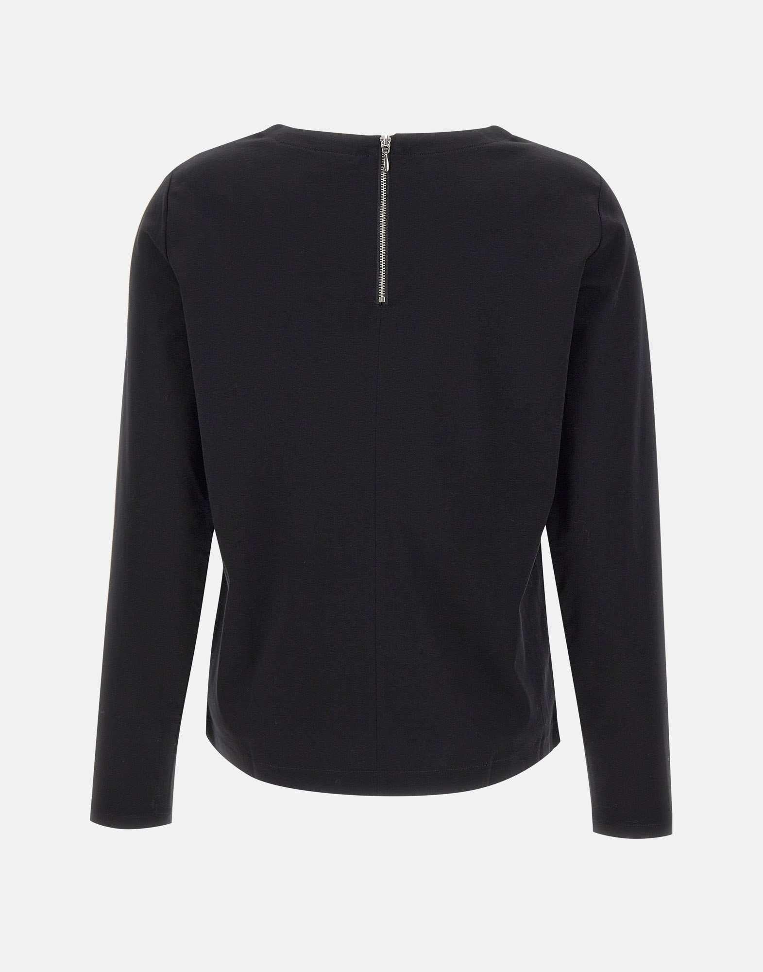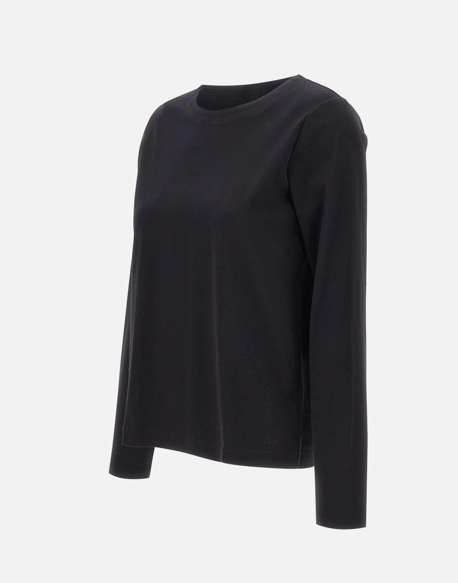 T-shirt donna Sun68 "Luxury" in jersey di cotone color nero, dal design moderno e minimalista. Presenta maniche lunghe, girocollo e zip sul retro per un dettaglio raffinato e funzionale. Lo spacchetto laterale al fondo e il logo ricamato tono su tono completano il look. La vestibilità boxy fit dona una linea morbida e contemporanea, ideale per outfit casual-chic.
