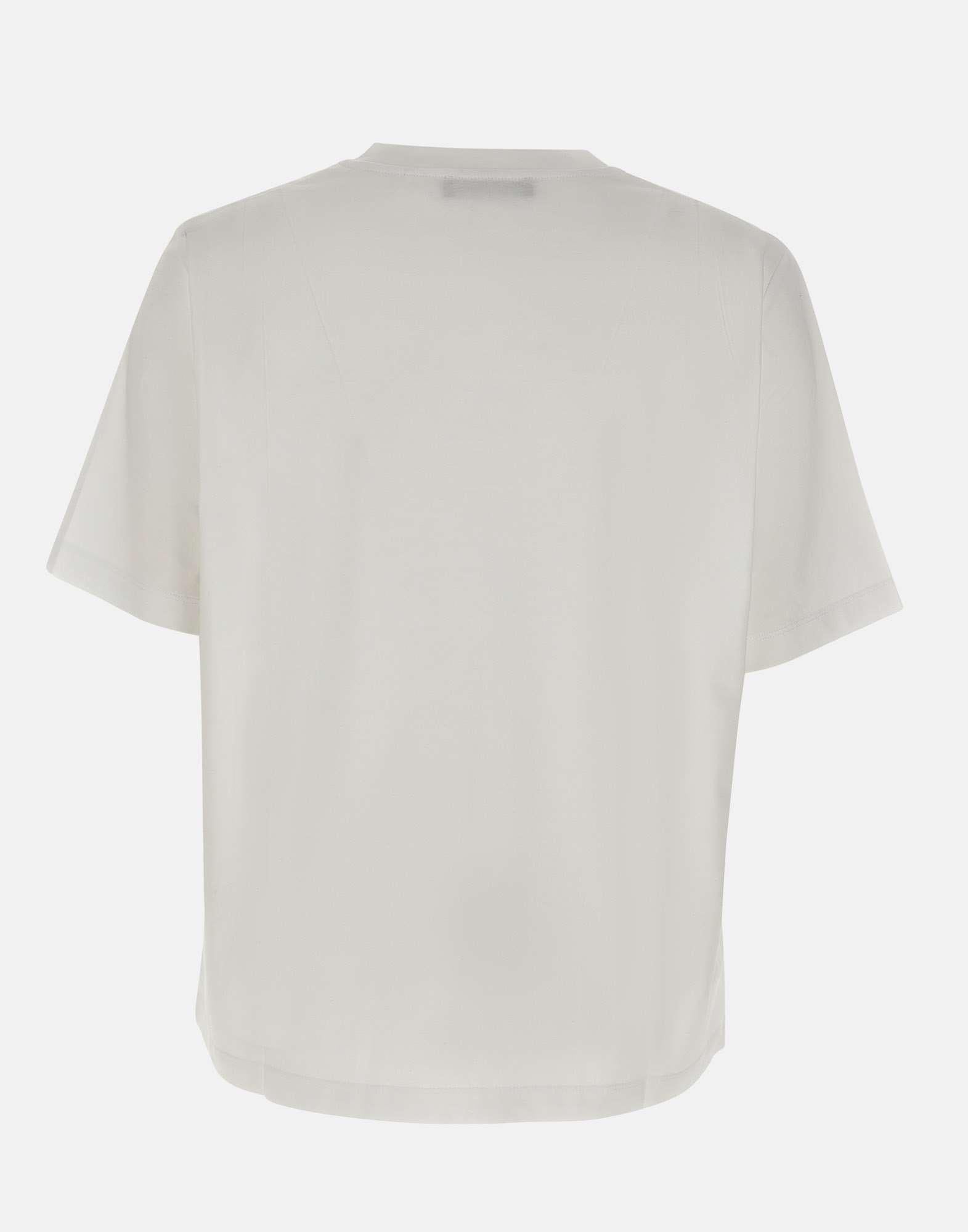 T-shirt Elena Mirò in jersey di cotone bianco, dal design femminile e luminoso. Presenta maniche corte, girocollo e un motivo floreale decorato con paillettes sul davanti, che aggiunge un tocco raffinato e brillante. La vestibilità regular fit garantisce comfort e versatilità per ogni occasione casual chic.