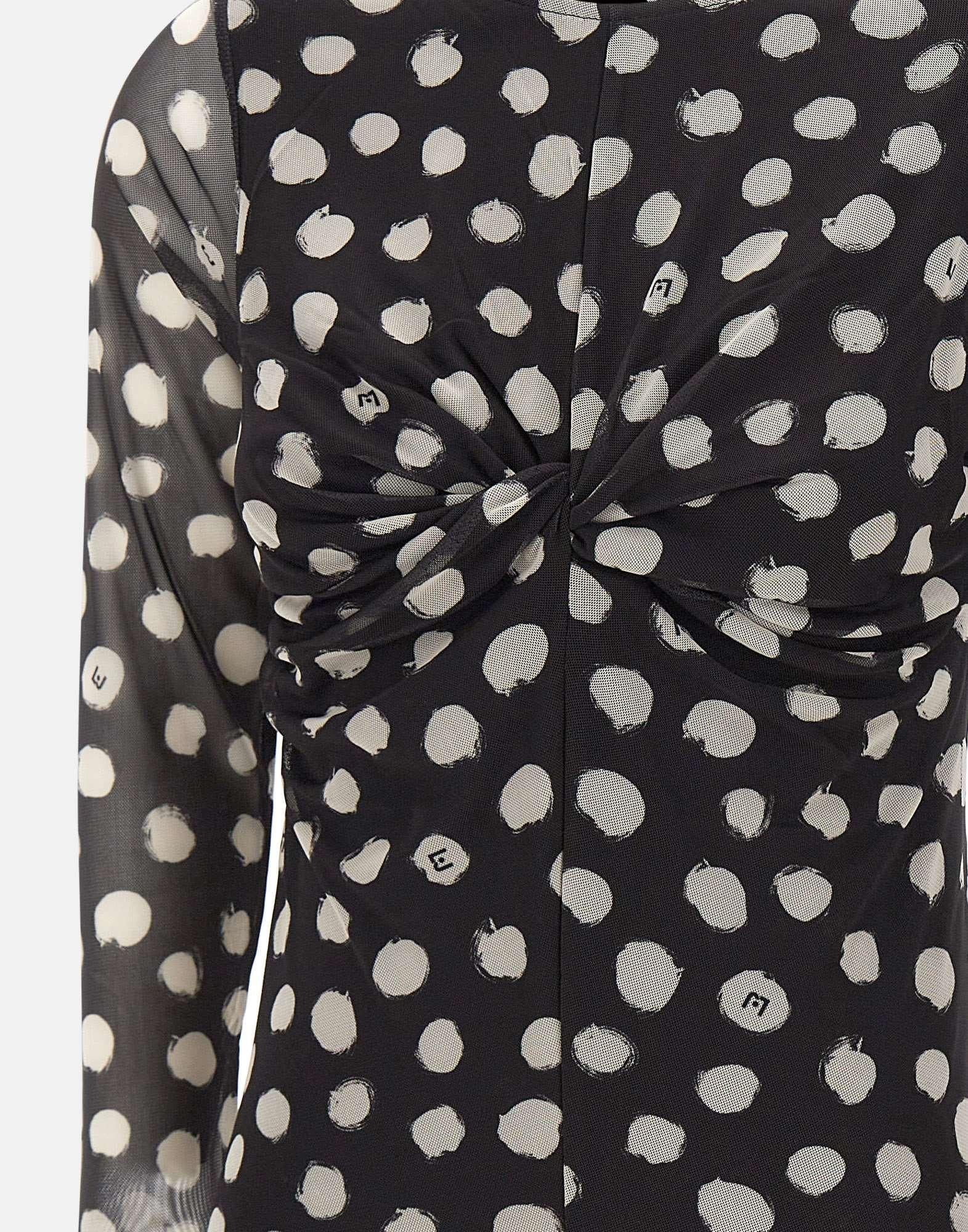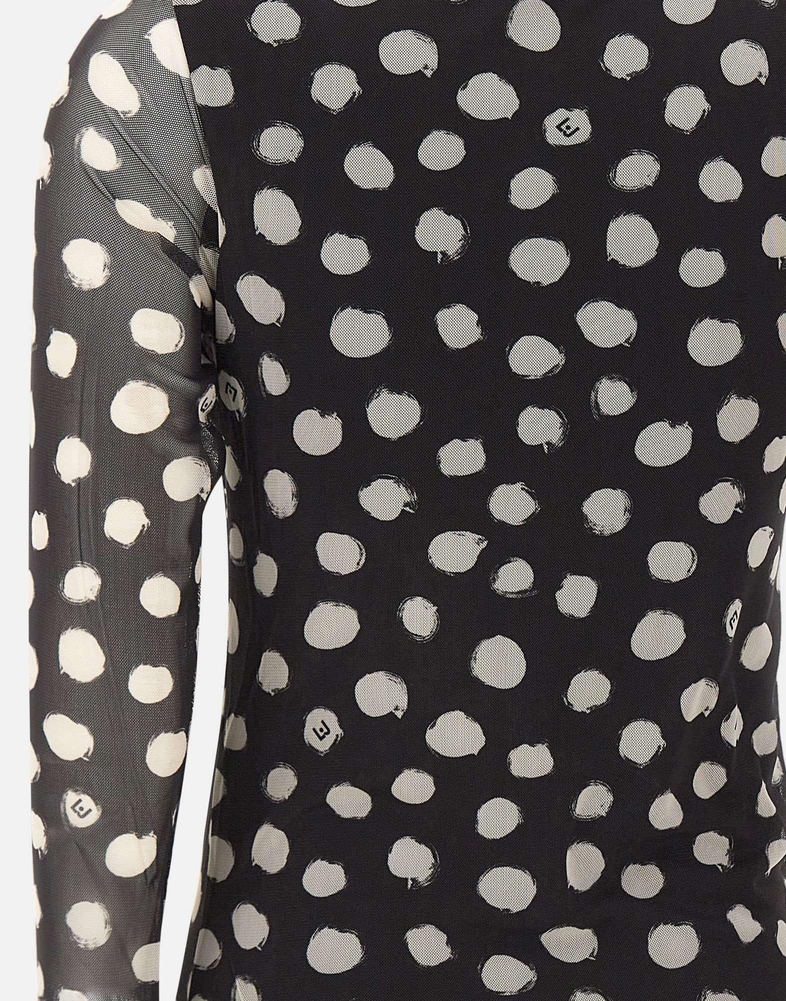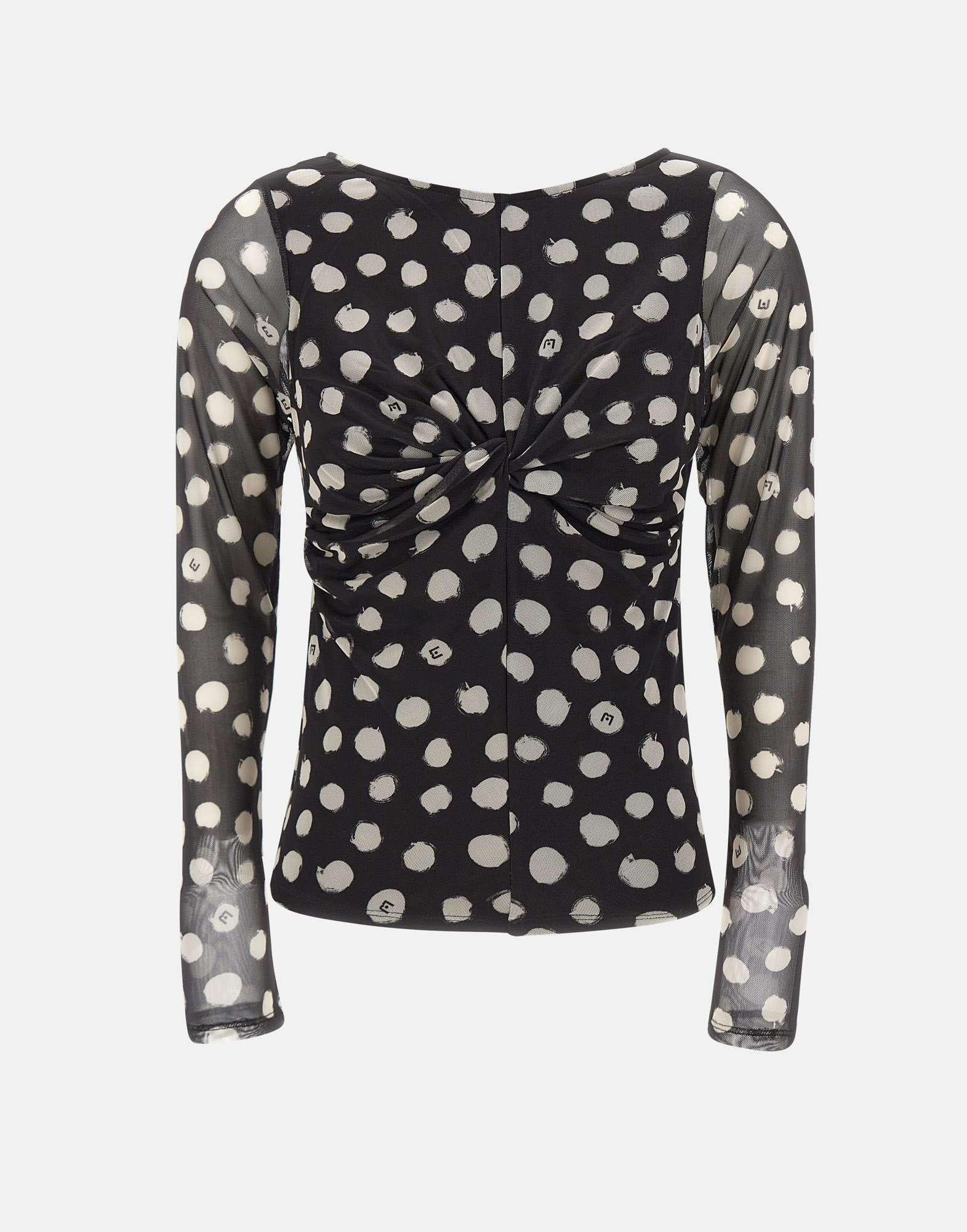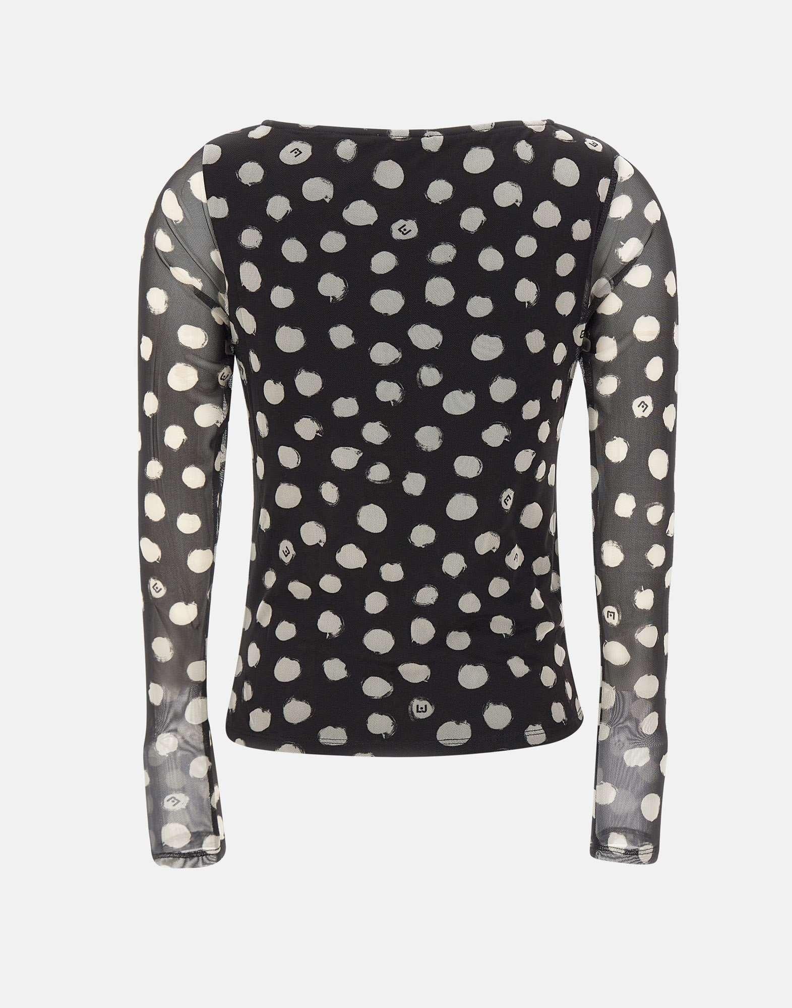 T-shirt donna Liu Jo in jersey stretch nero con stampa a pois bianchi all over, espressione di femminilità raffinata e moderna. Caratterizzata da scollo a barca e delicato arriccio sul davanti, presenta maniche lunghe in tessuto trasparente che donano leggerezza e charme. Appartenente alla linea sostenibile "Liu Jo Better", unisce eleganza e responsabilità ambientale. Vestibilità regular.