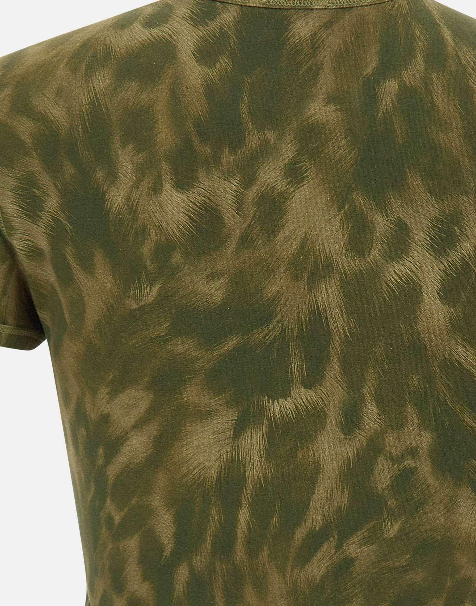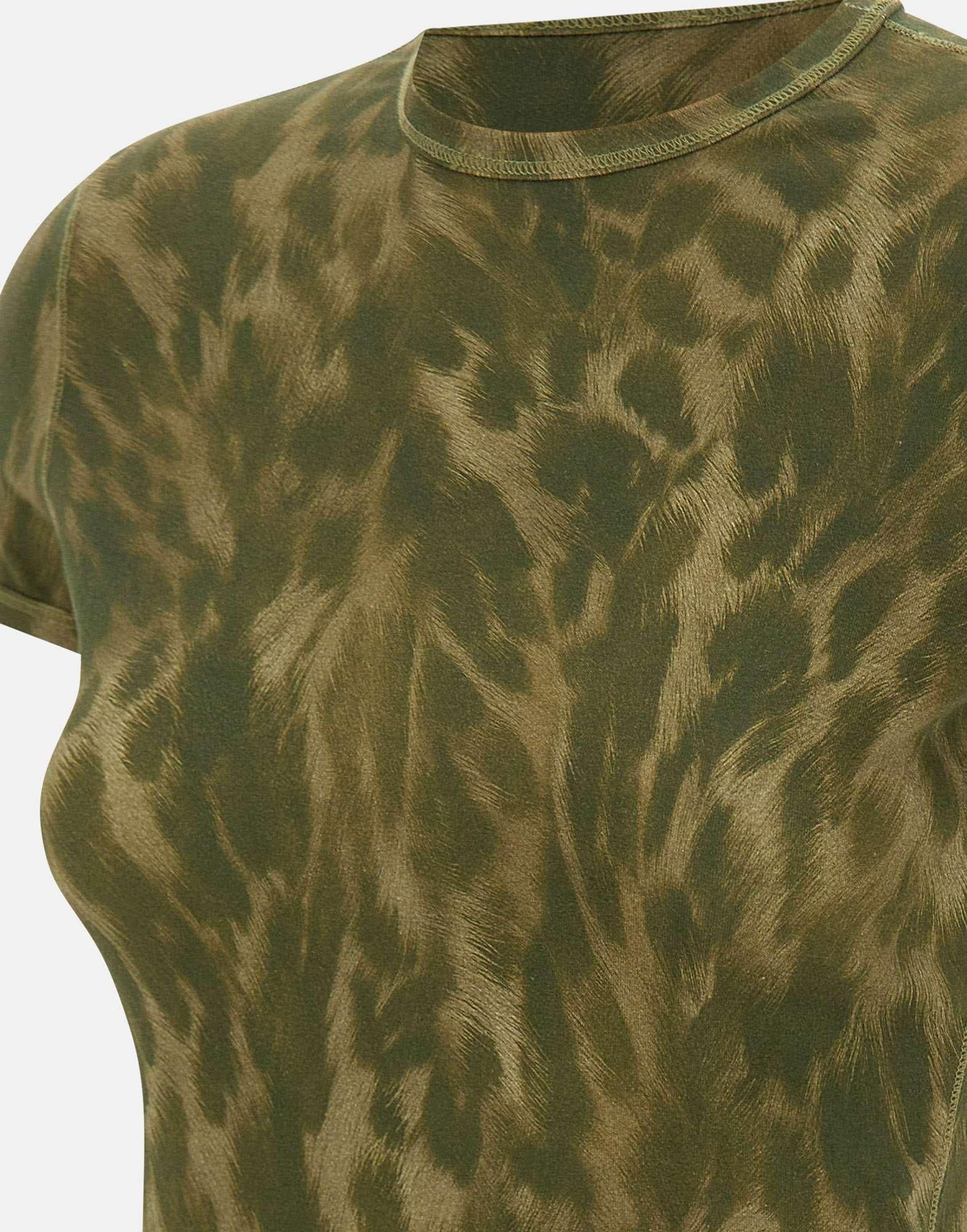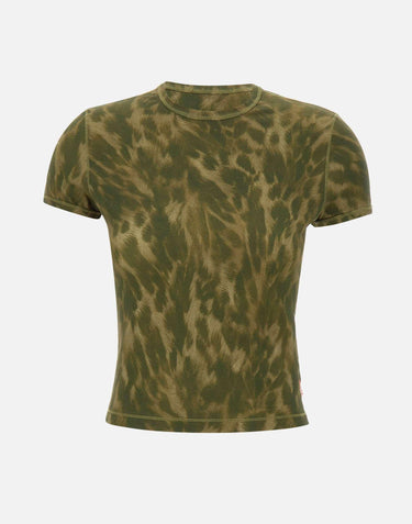 T-shirt donna Diesel "T-Anima" realizzata in cotone elasticizzato color verde militare con fantasia effetto fur, pensata per un look contemporaneo dal forte impatto visivo. Il taglio crop valorizza la silhouette con un'attitudine decisa, mentre maniche corte e girocollo definiscono una linea essenziale e versatile. Le impunture in vista aggiungono un dettaglio grafico, completato dall'etichetta bandierina applicata sul fianco, firma riconoscibile del brand.